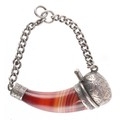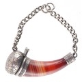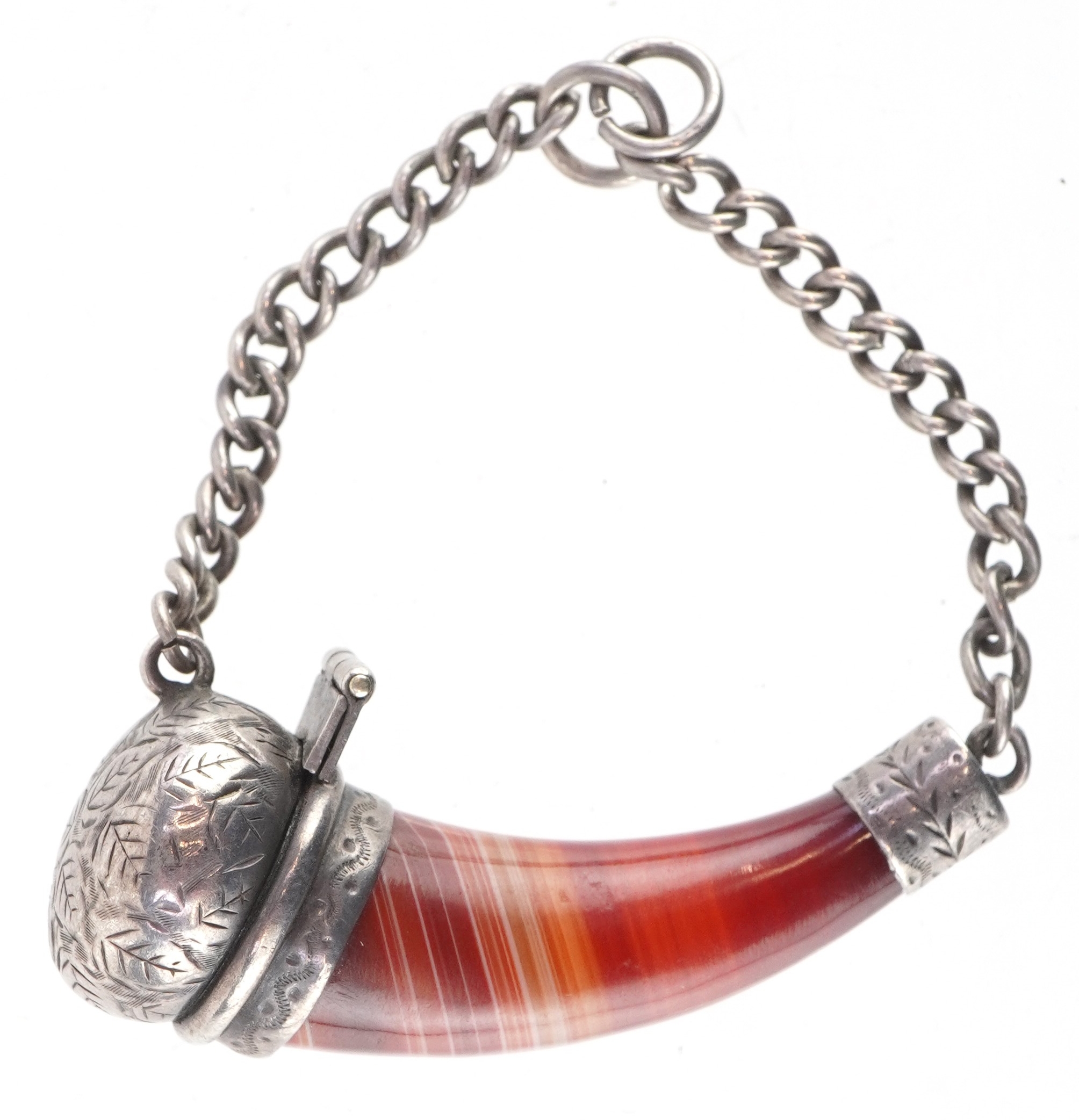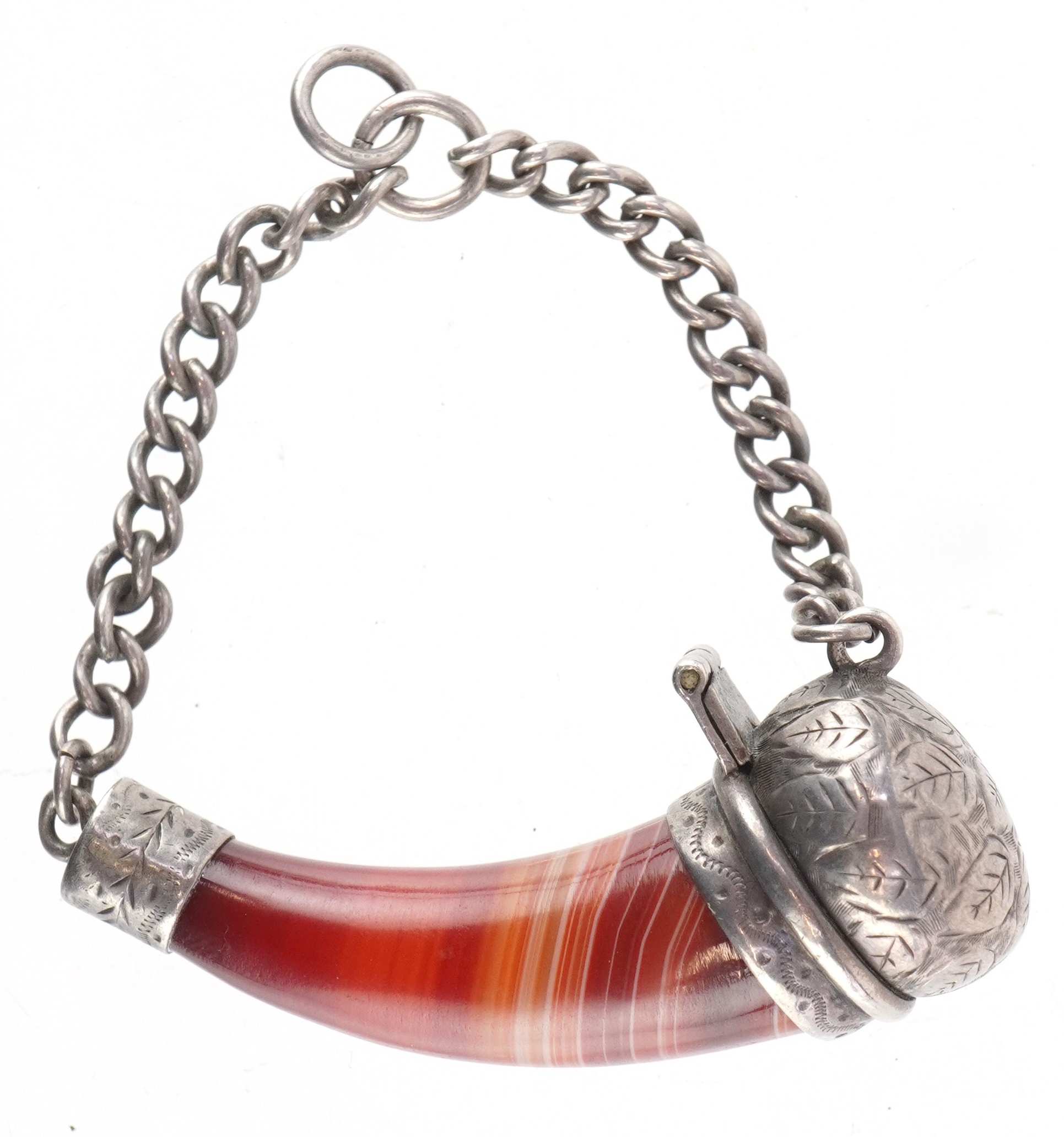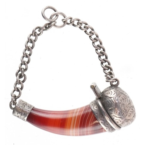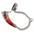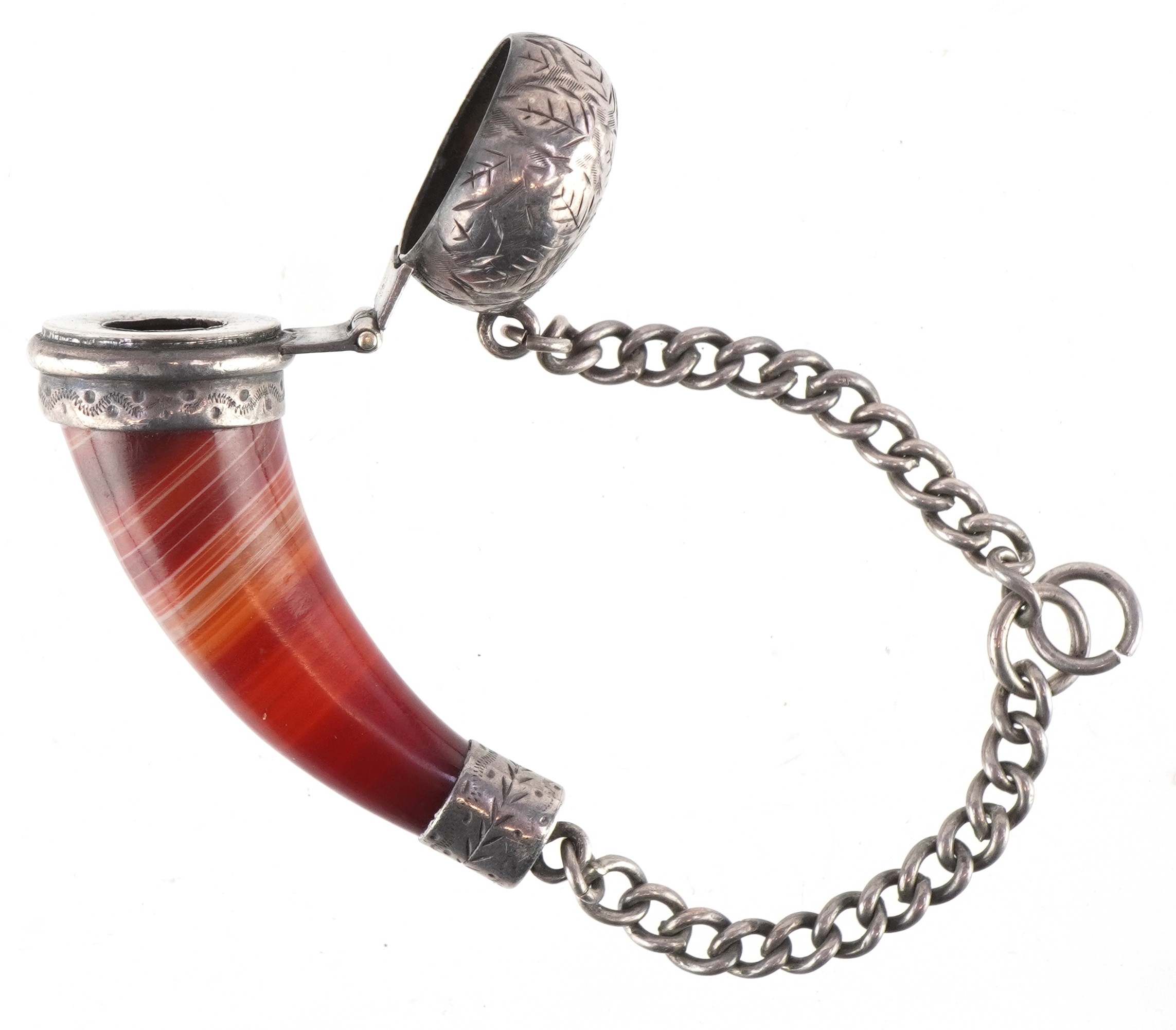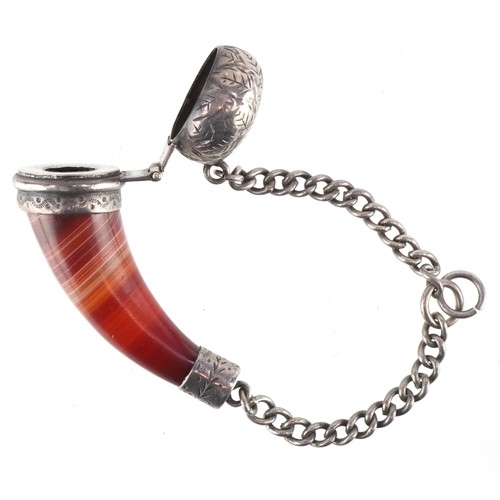 An unmarked silver and agate horn shaped scent bottle with engraved floral decoration, 4.8cm wide, 14.9g.