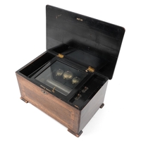 An impressive mid 19th century Swiss interchangeable cylinder music box by Mermod Freres, within a walnut and rosewood crossbanded case fitted with cast brass handles and having two additional cylinders, on bracket feet, 32cm H x 104cm W x 46cm D.