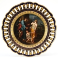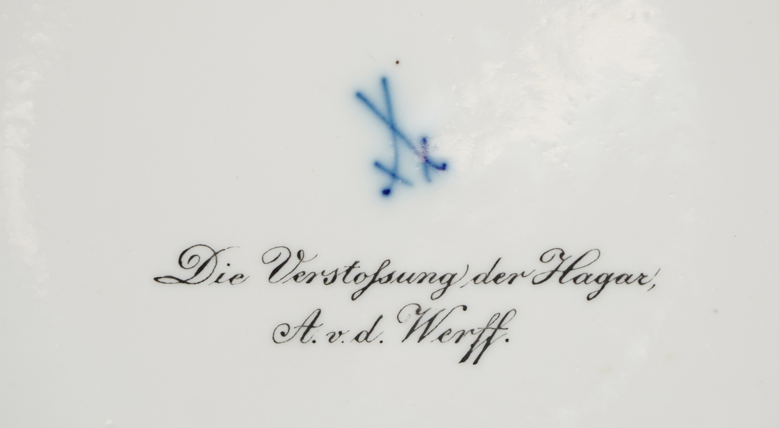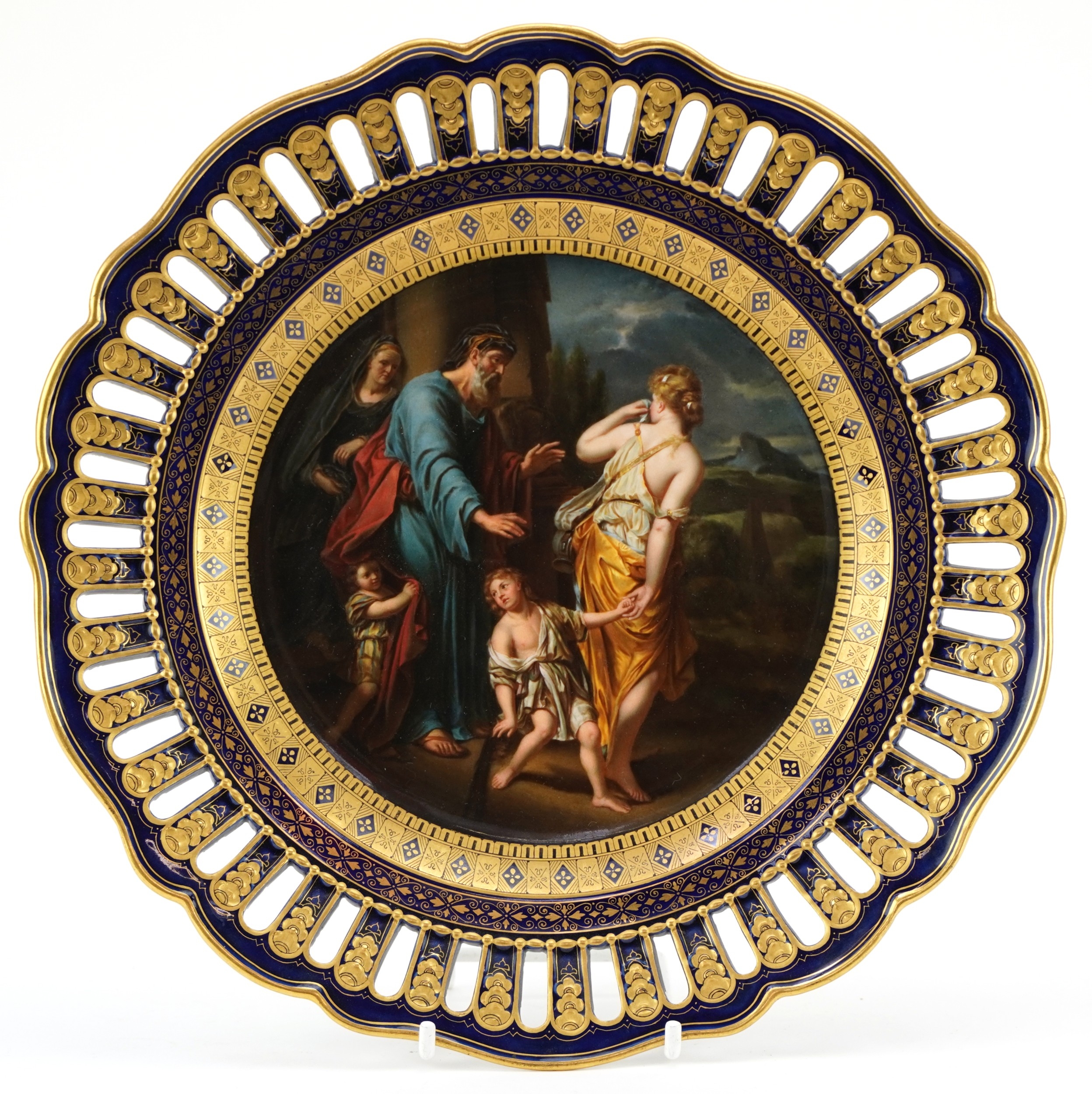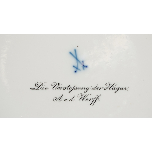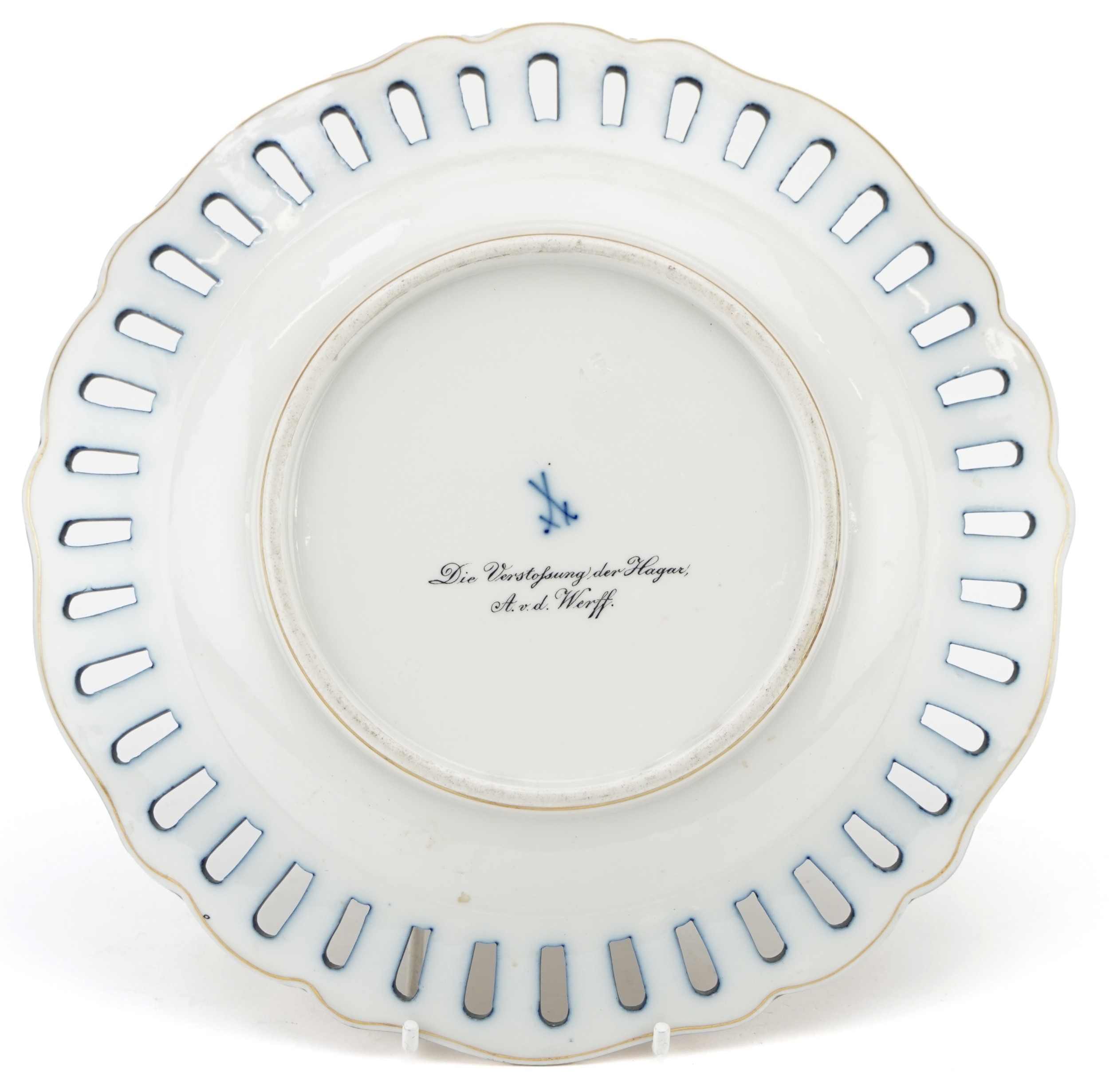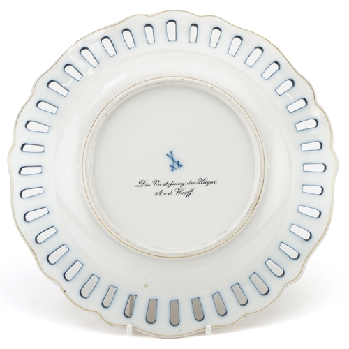 A Meissen 19th century German porcelain cabinet plate with pierced rim, hand painted after Adriaen van der Werff depicting 'The Banishment of Hagar & Ishmael', bearing blue crossed sword marks to the base, 24cm in diameter.