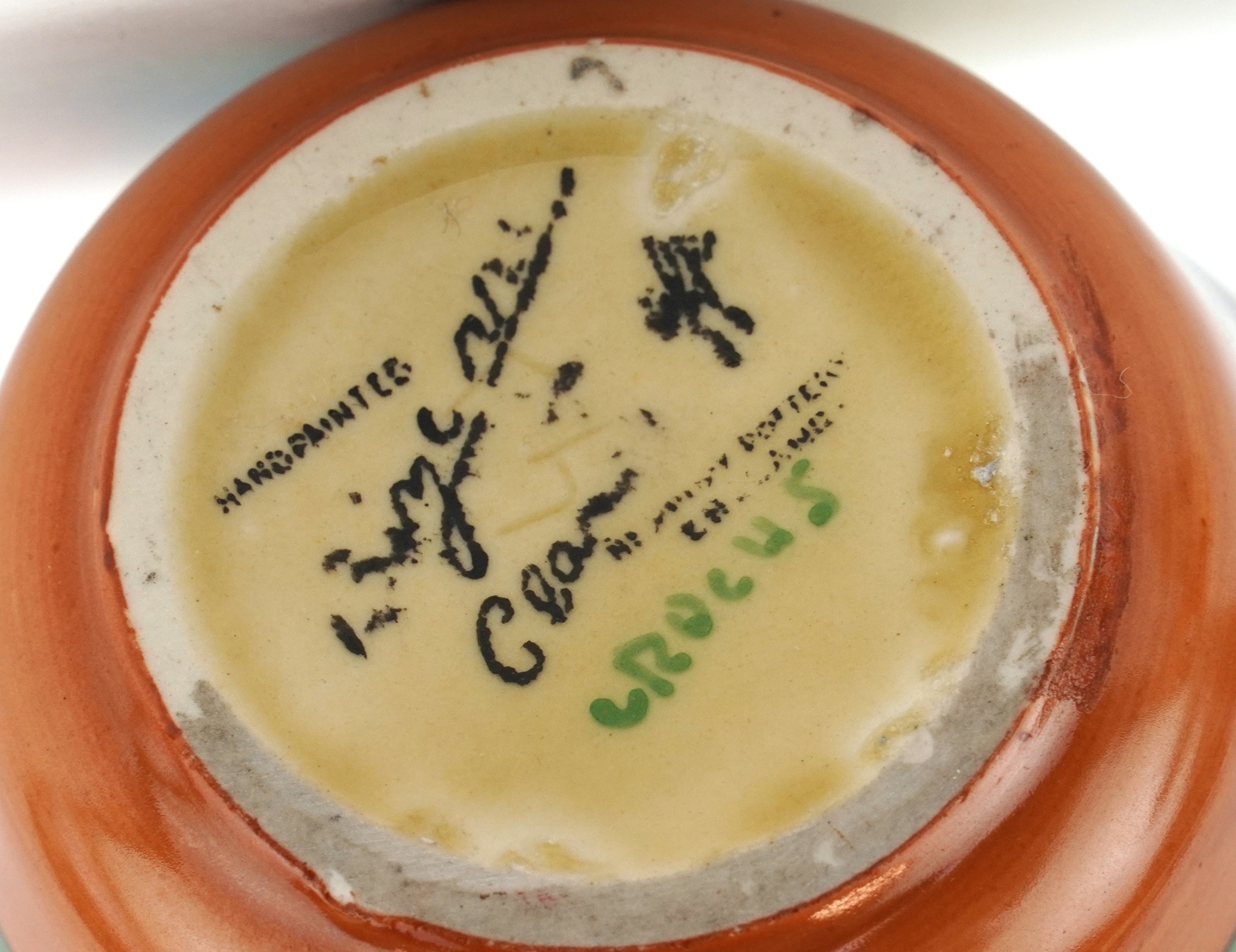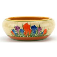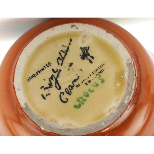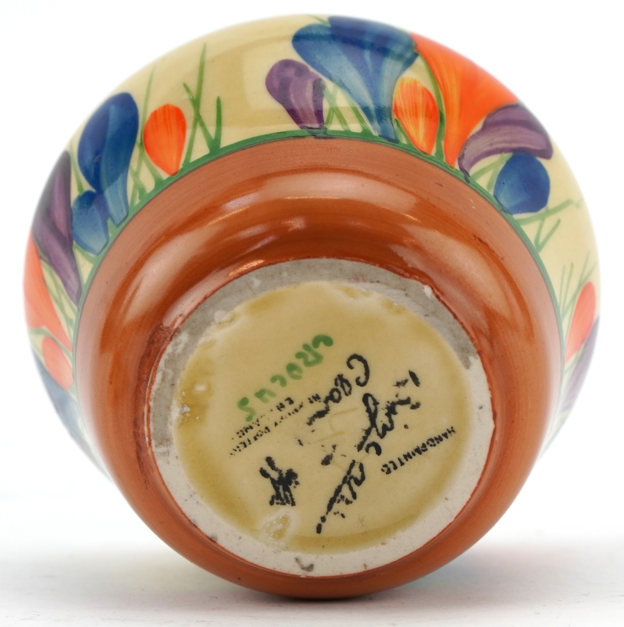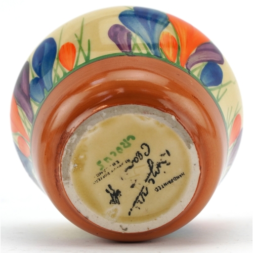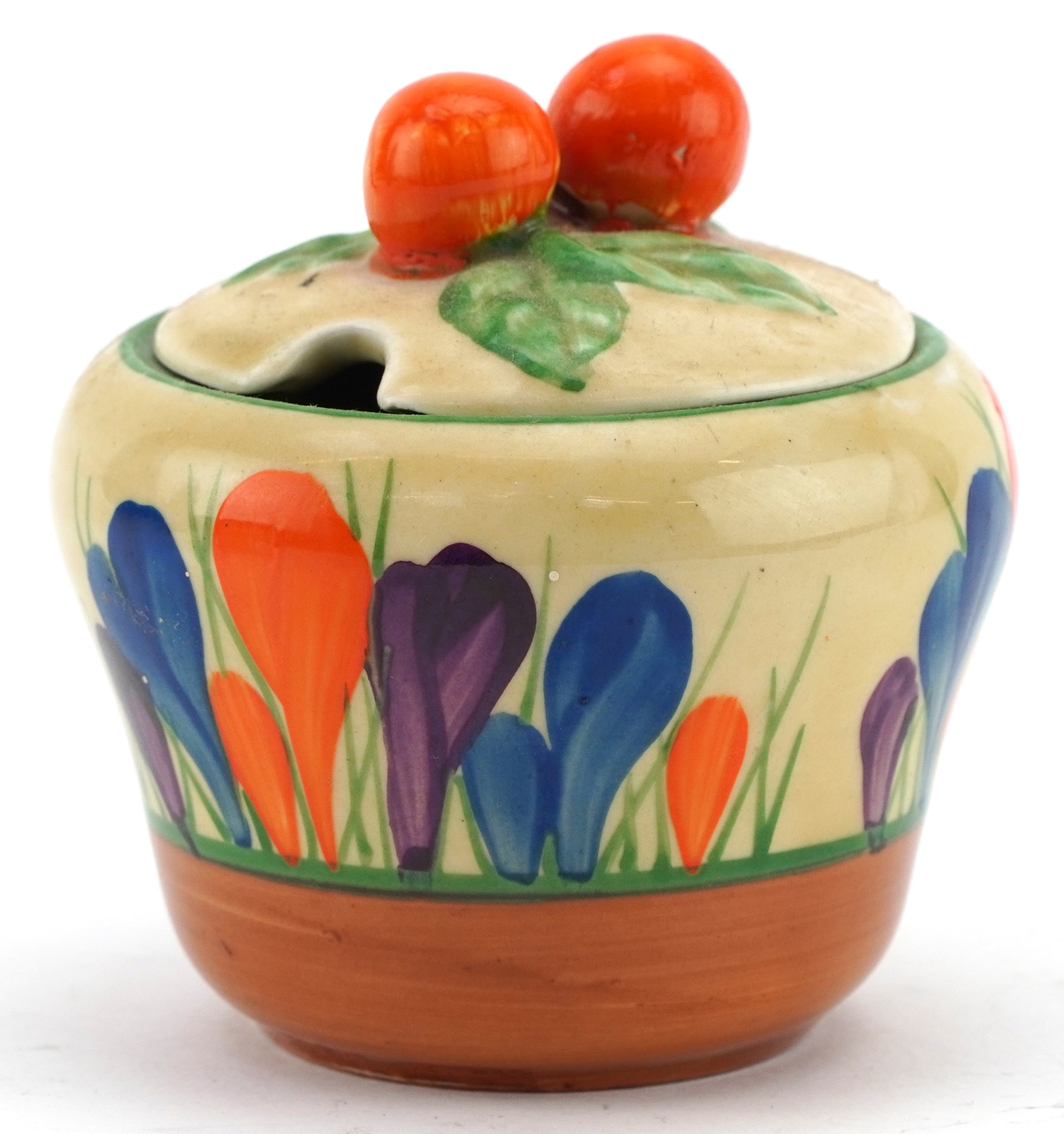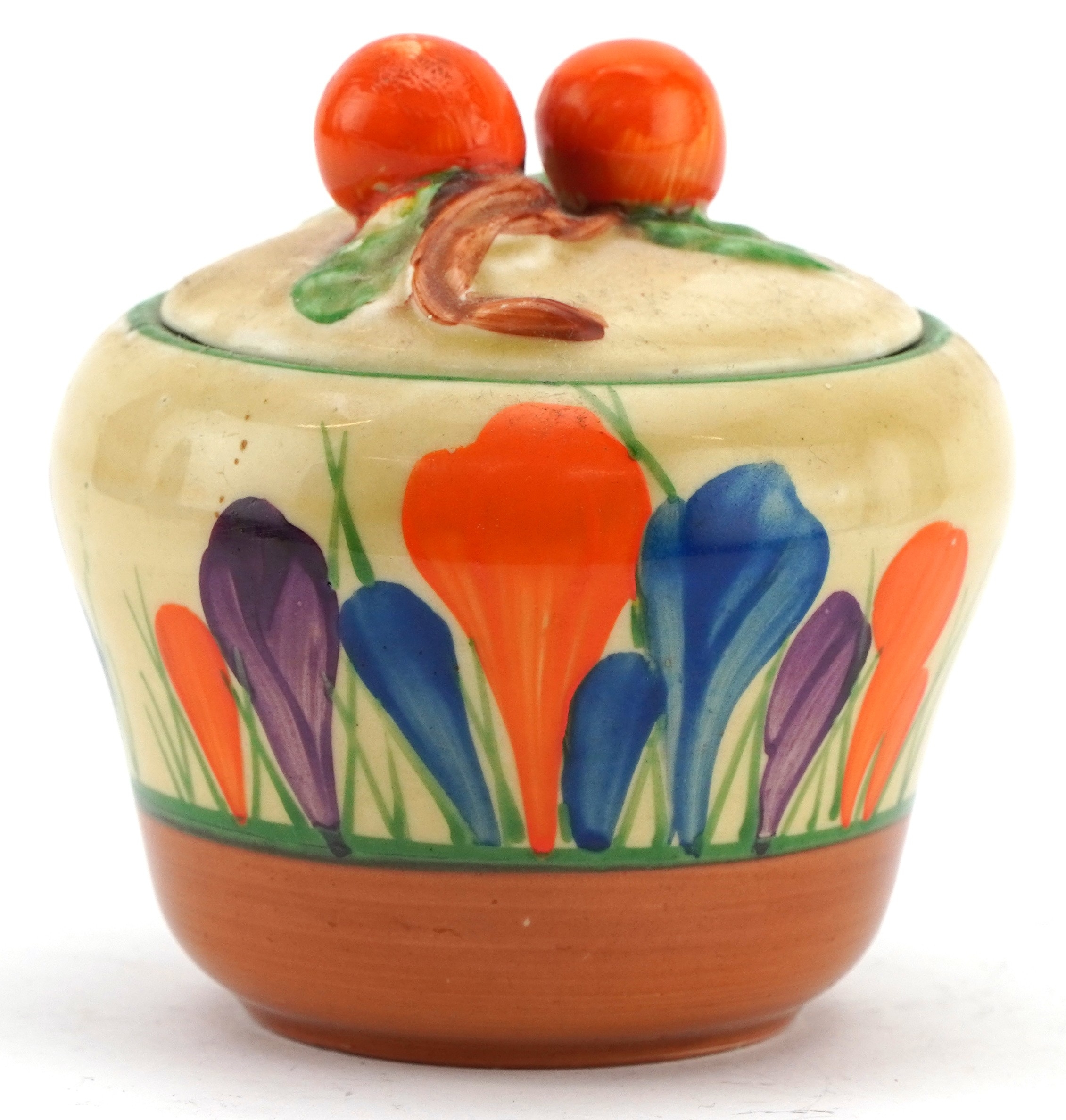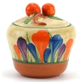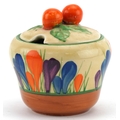 Bizarre by Clarice Cliff, an Art Deco preserve jar and cover hand painted in the Crocus pattern, 8cm high.