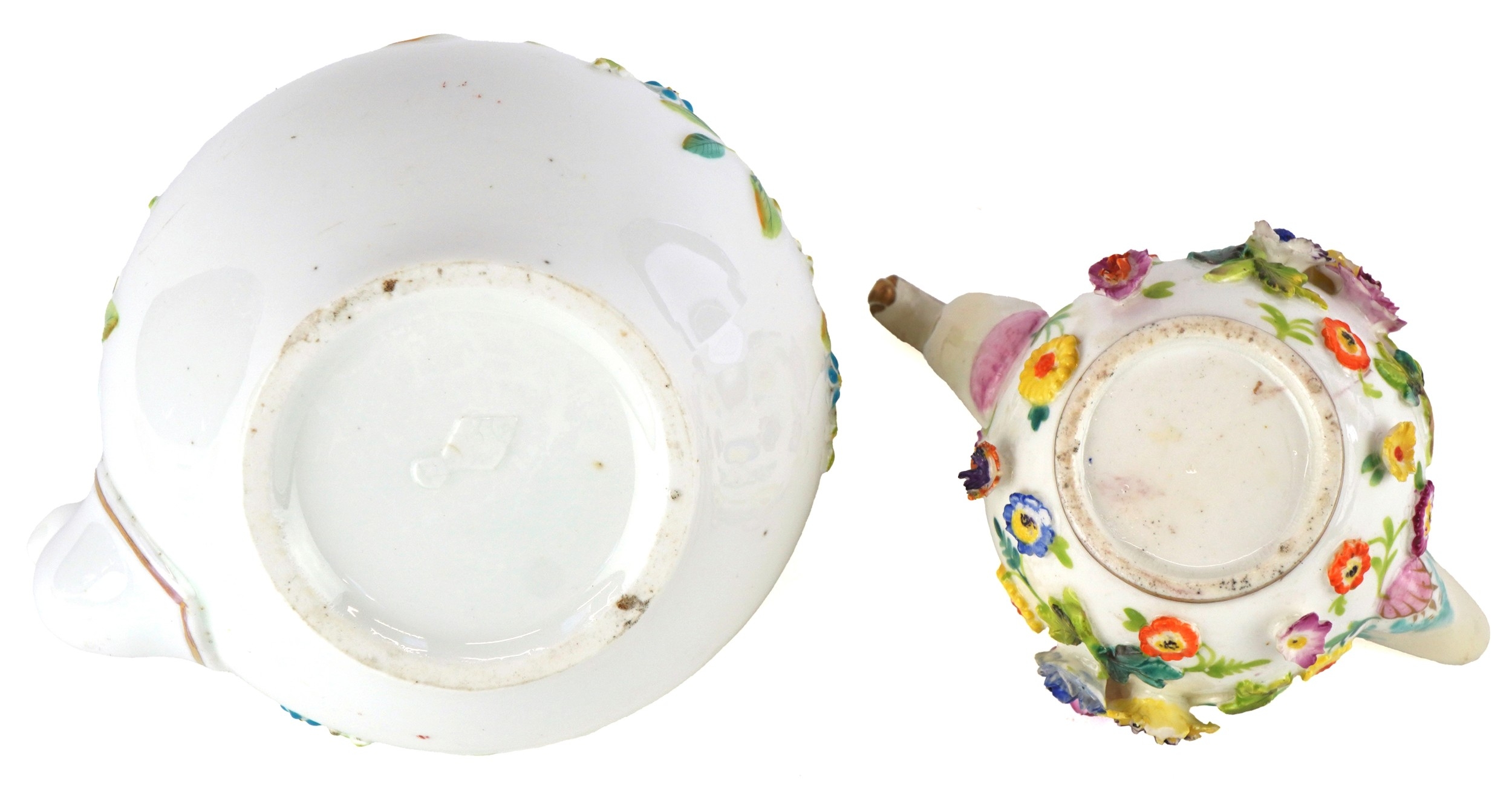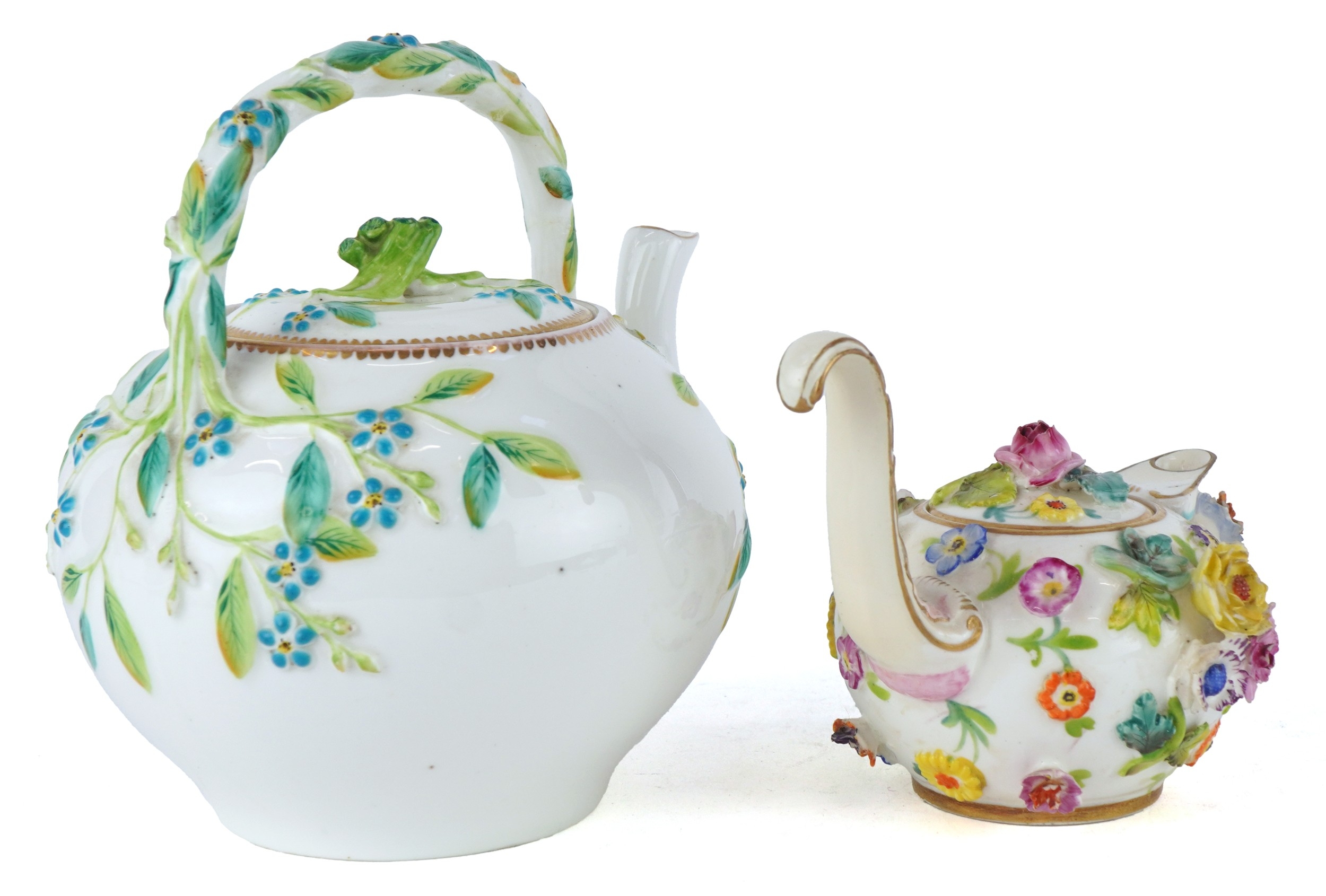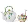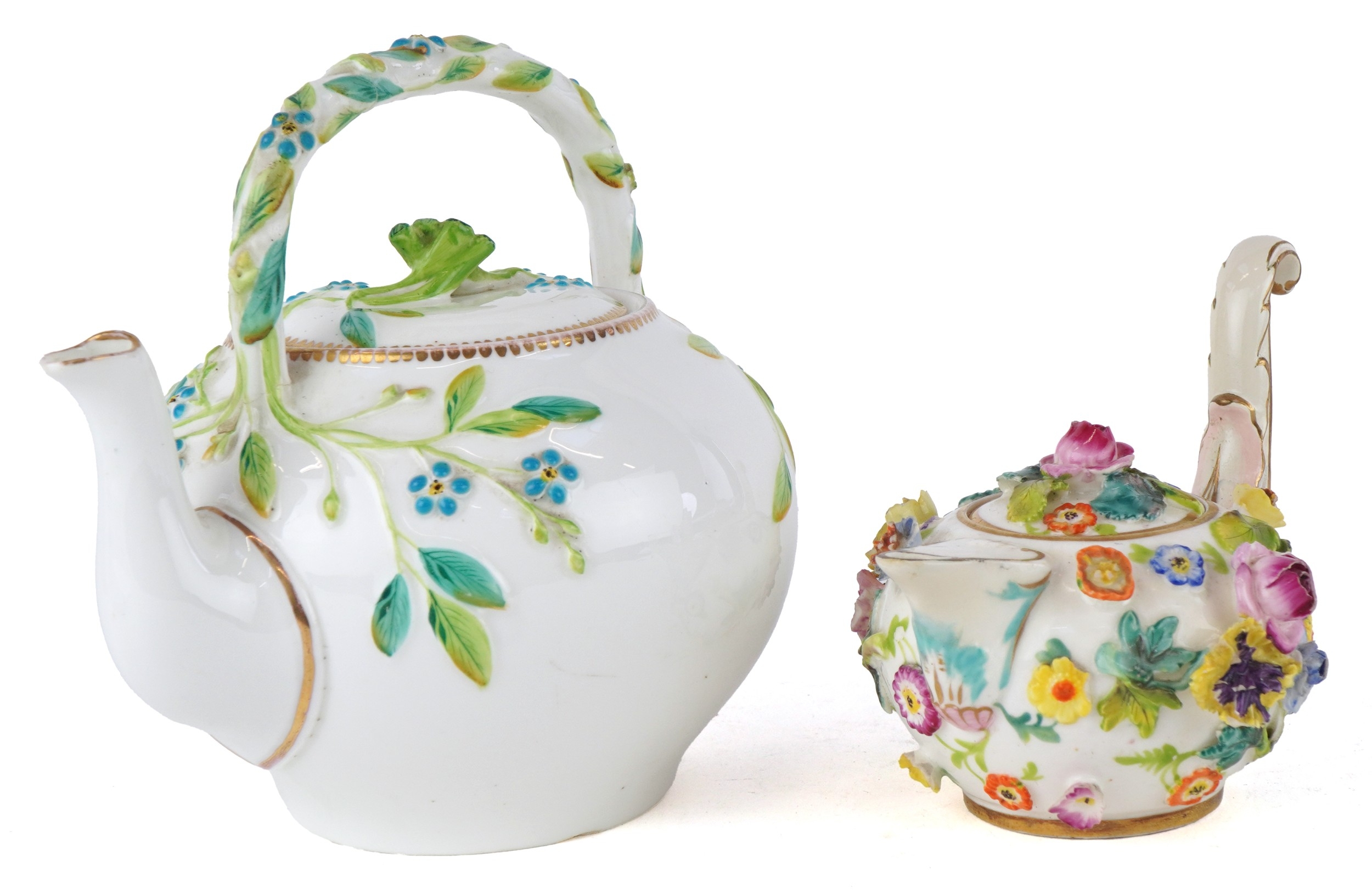 Two 19th century porcelain teapots including a Meissen style example profusely decorated in relief with flowers, the largest 14cm high.