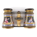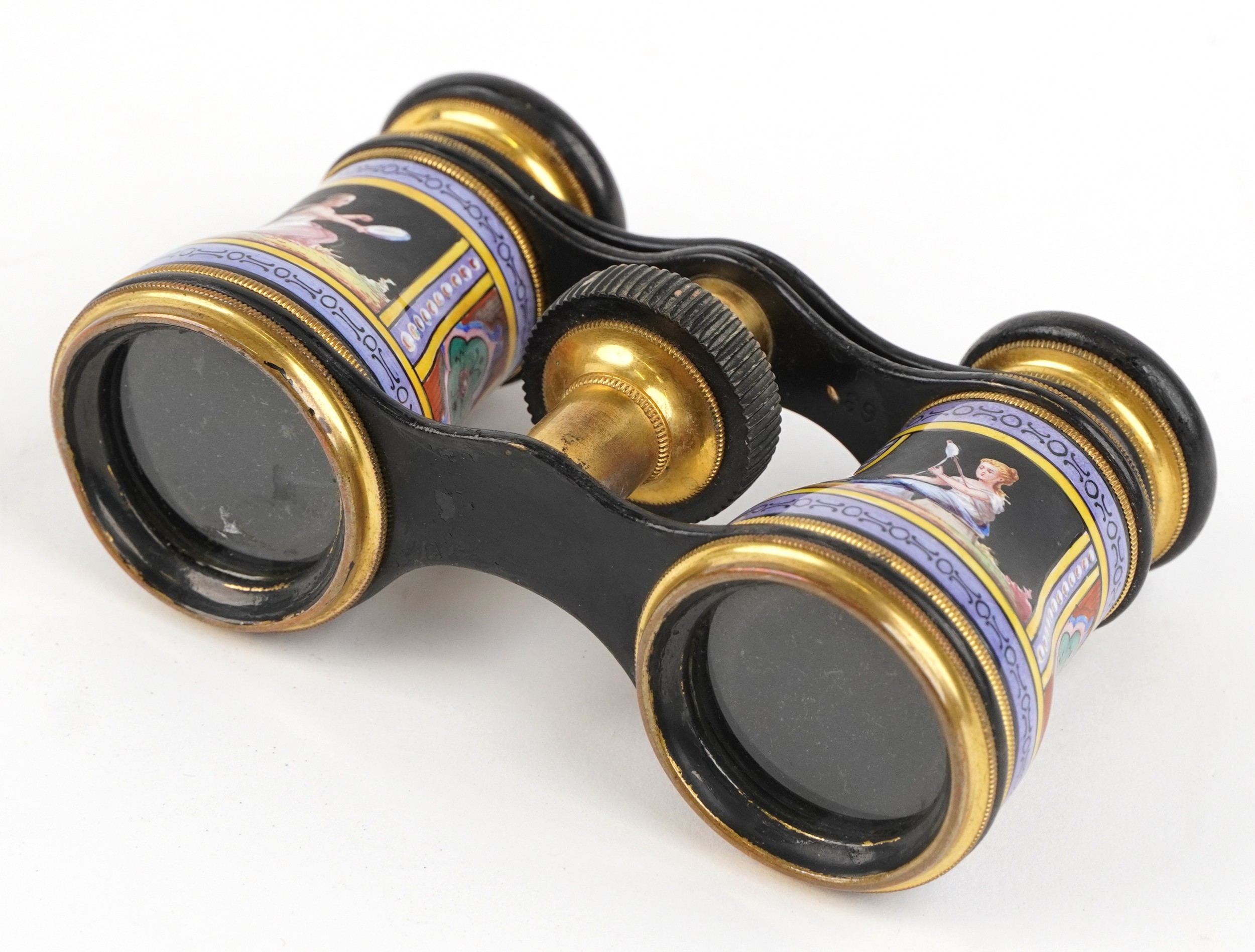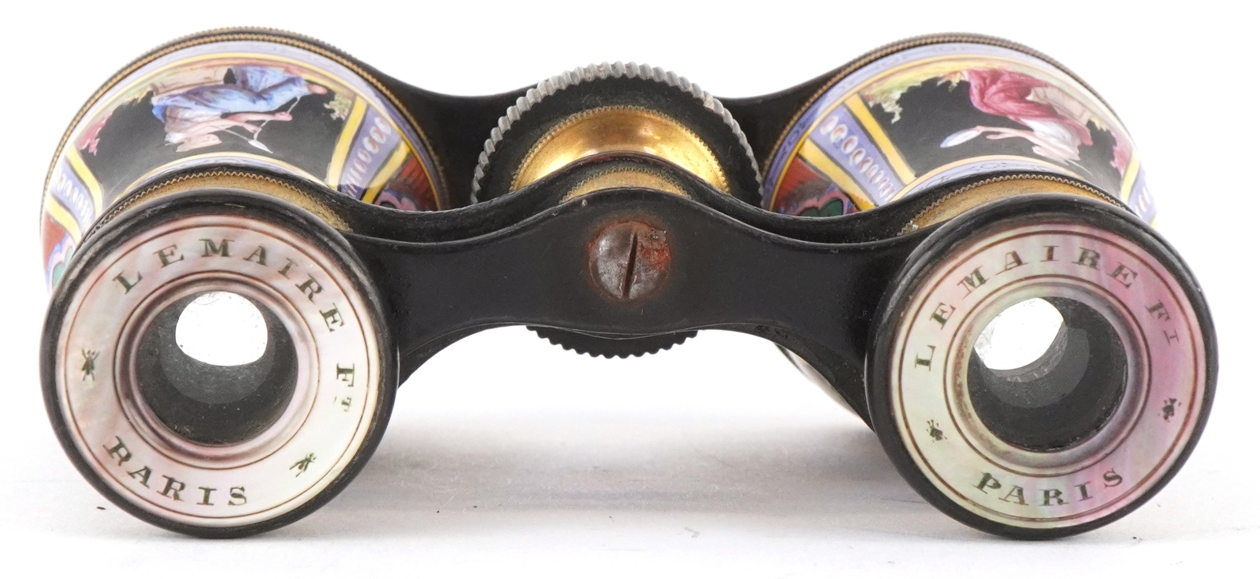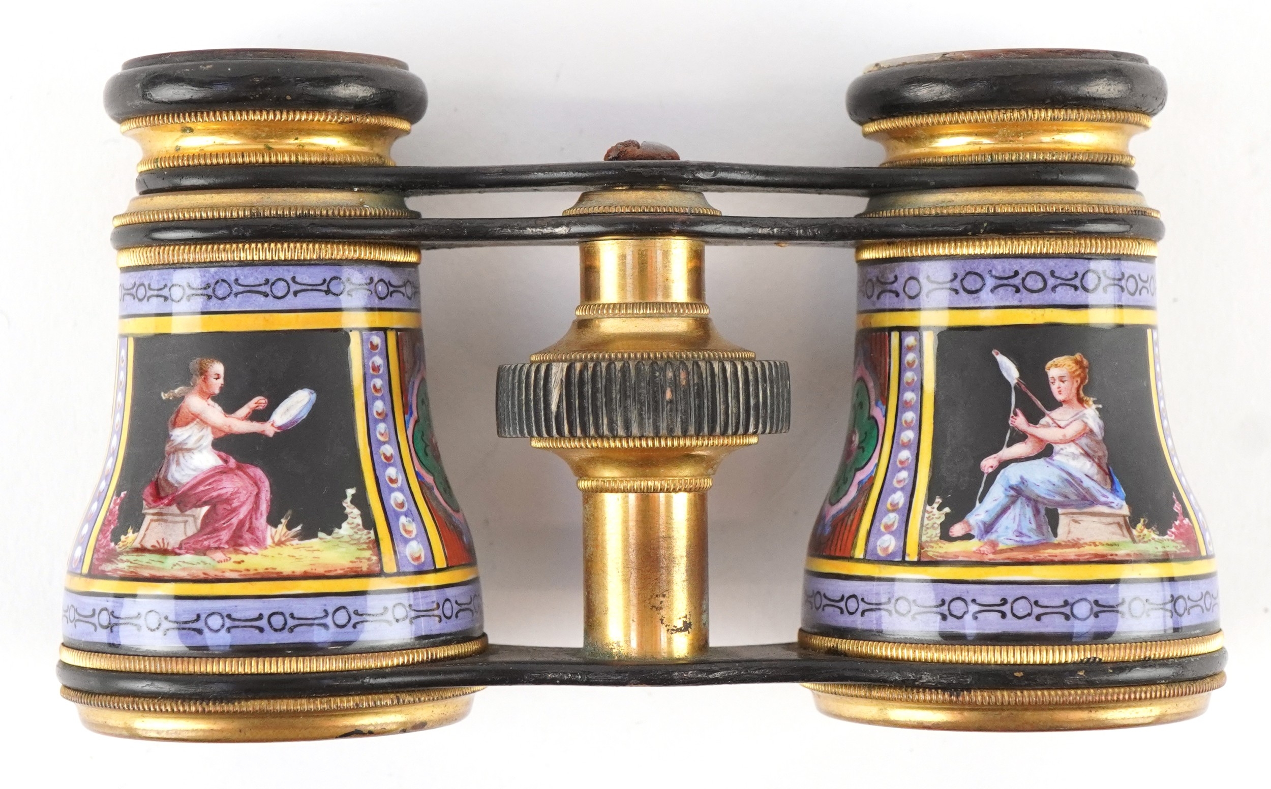 A pair of 19th century brass opera glasses with mother of pearl eyepieces and enamelled barrels finely hand painted with Neo-Classical maidens, inscribed Le Maire Paris, 10cm wide.