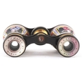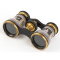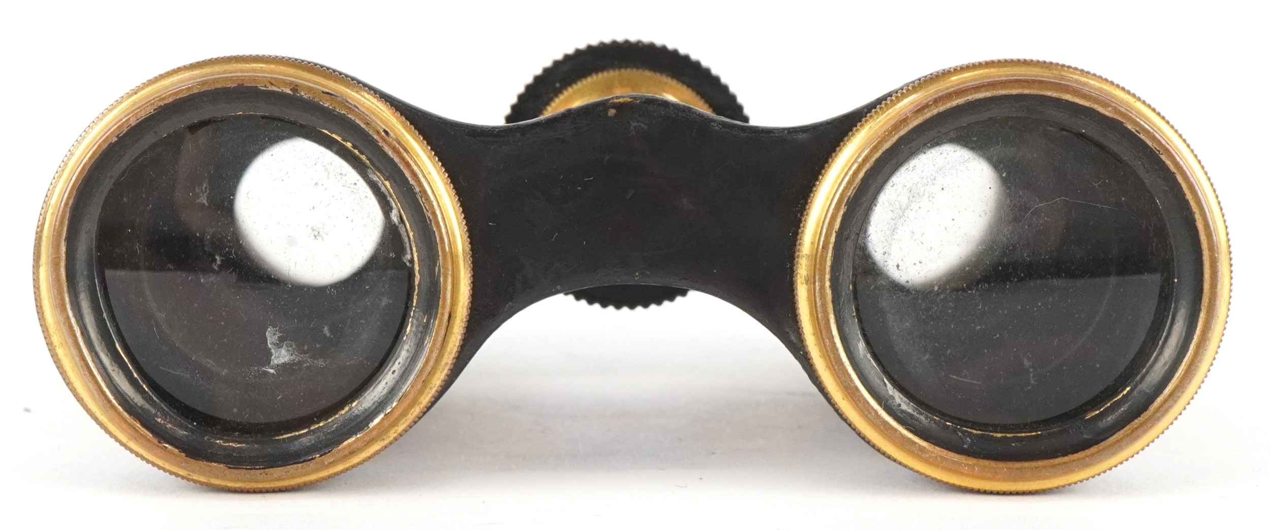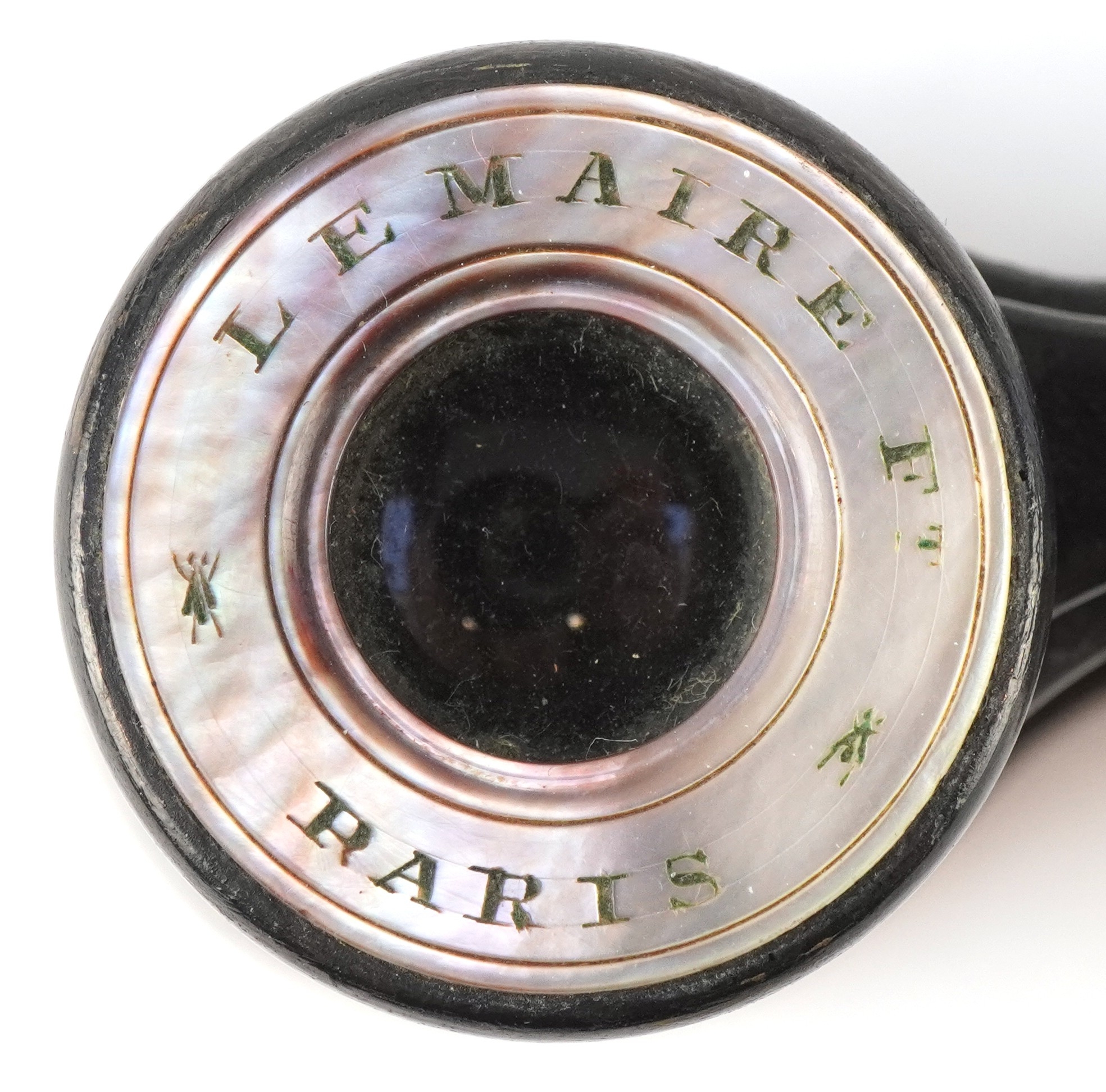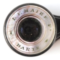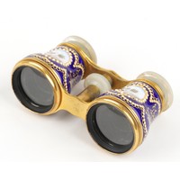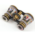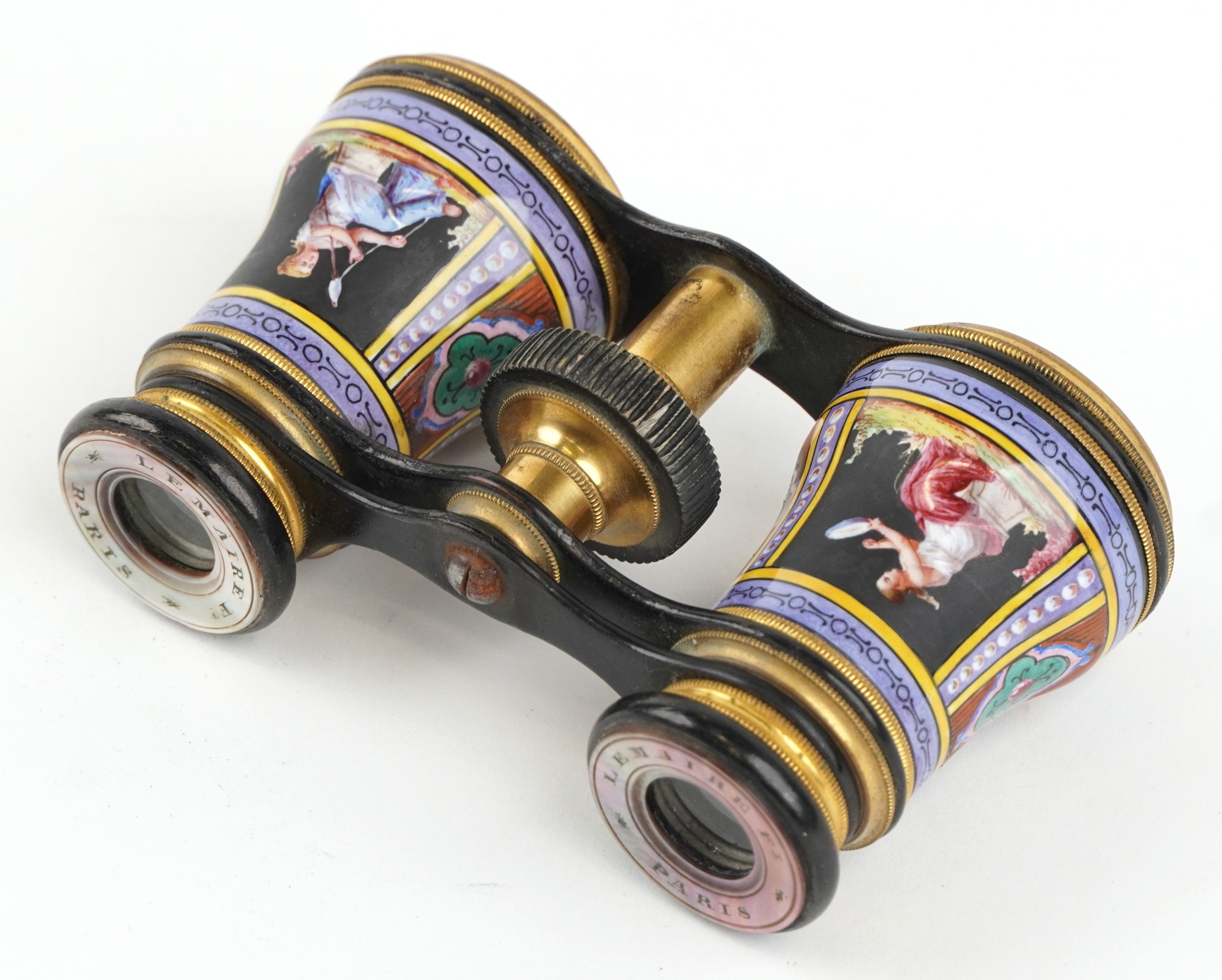 A pair of 19th century brass opera glasses with mother of pearl eyepieces and enamelled barrels finely hand painted with Neo-Classical maidens, inscribed Le Maire Paris, 10cm wide.
