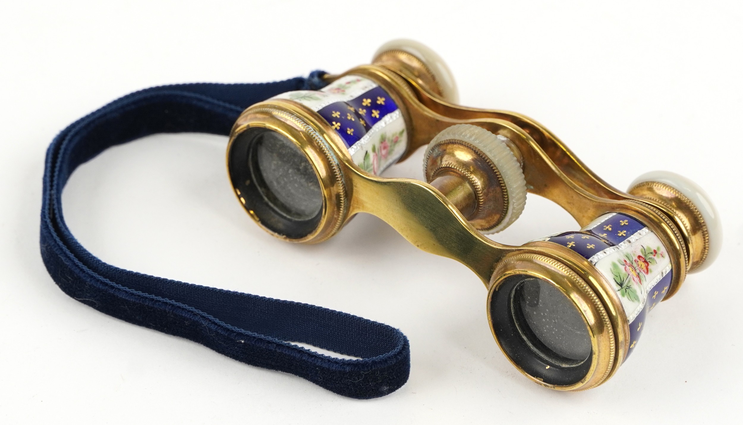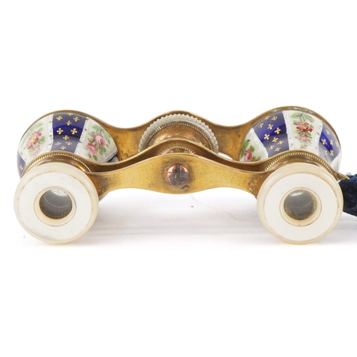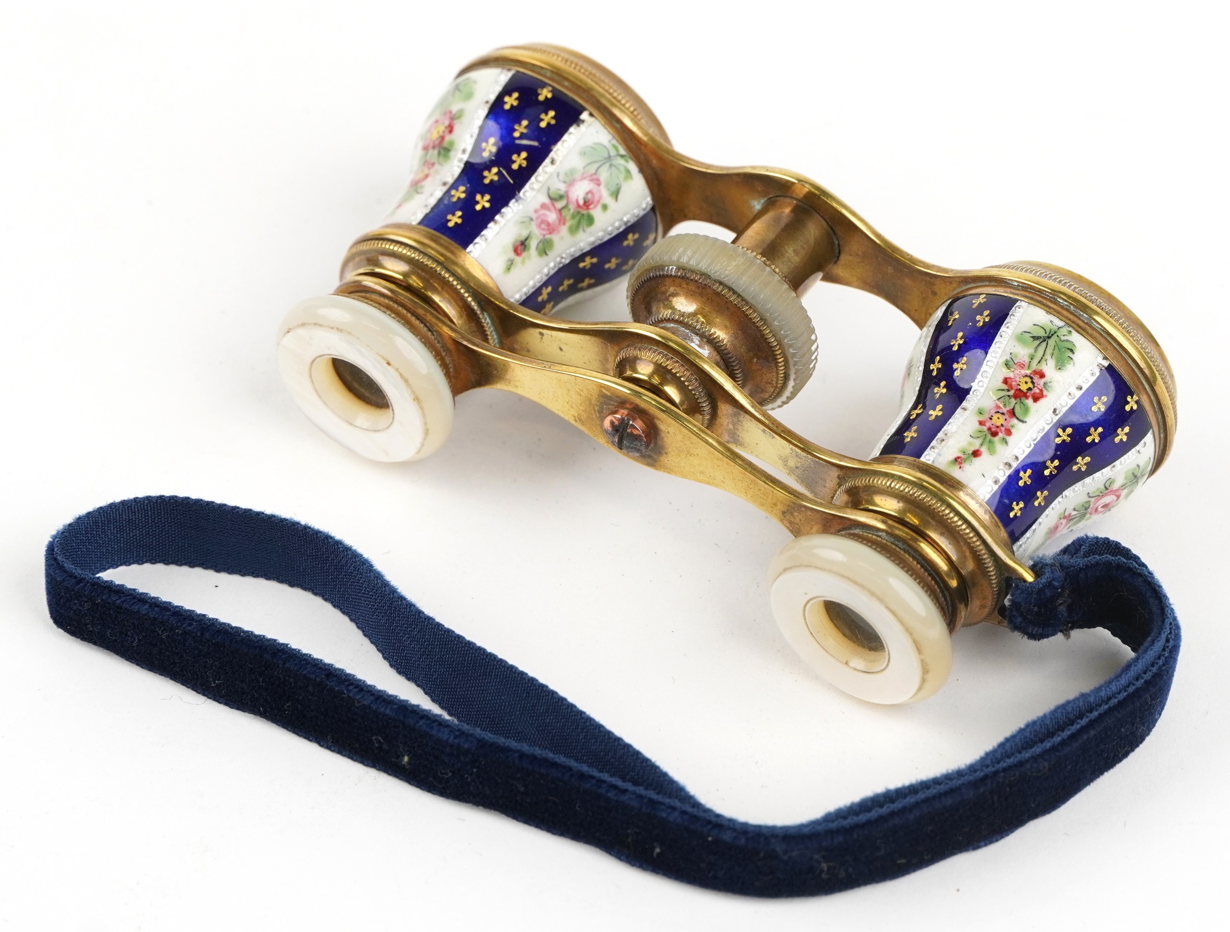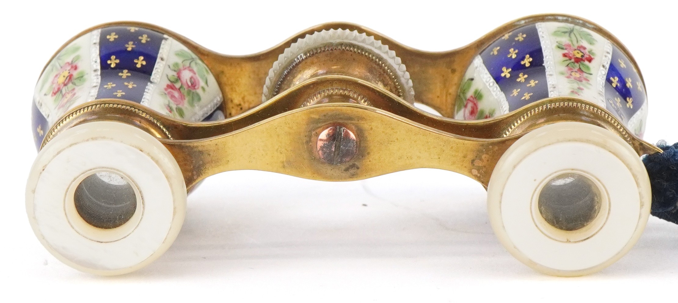 A pair of 19th century brass opera glasses with mother of pearl eyepieces and enamelled barrels finely hand painted with panels of flowers, 9cm wide.