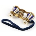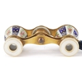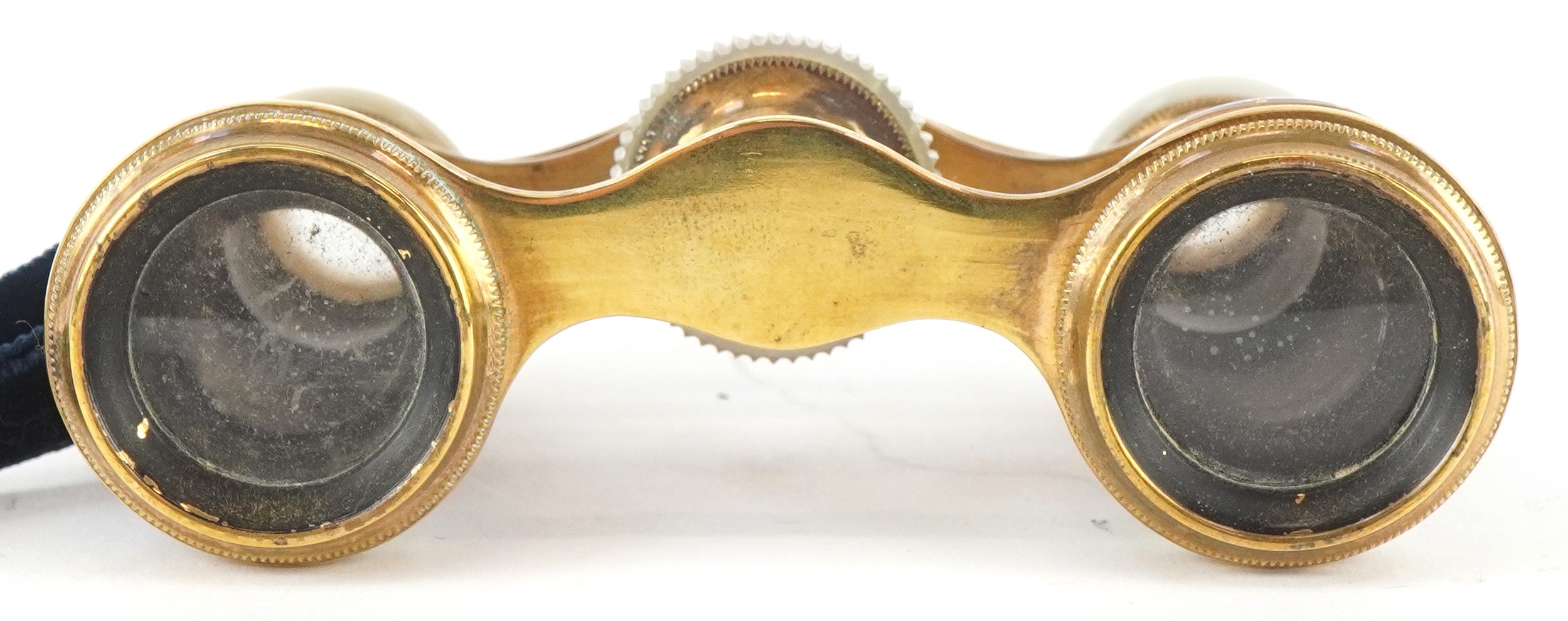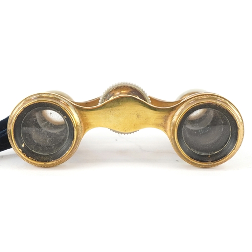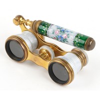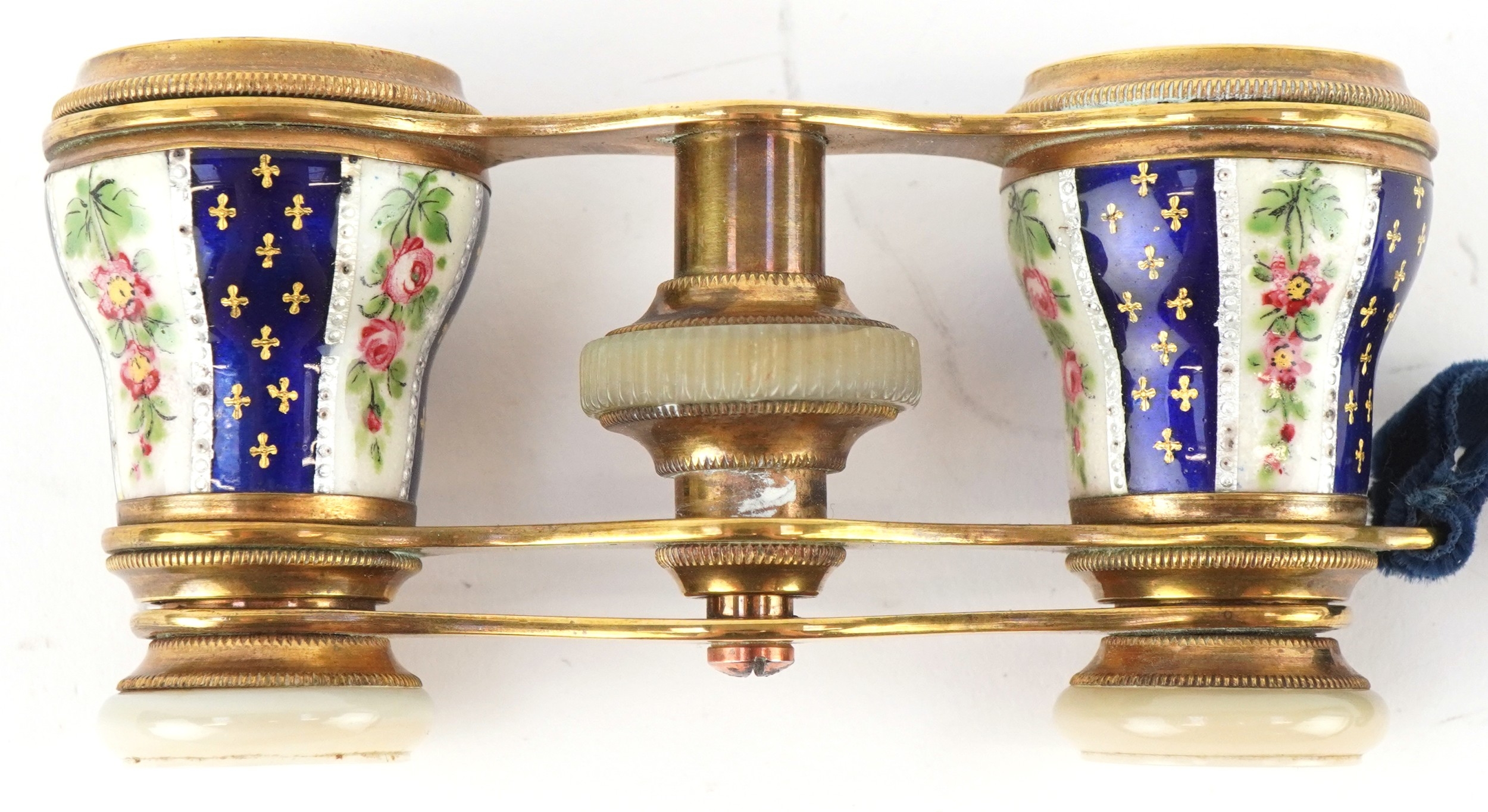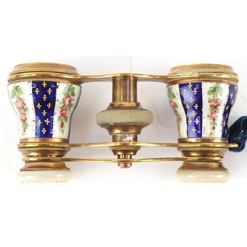 A pair of 19th century brass opera glasses with mother of pearl eyepieces and enamelled barrels finely hand painted with panels of flowers, 9cm wide.