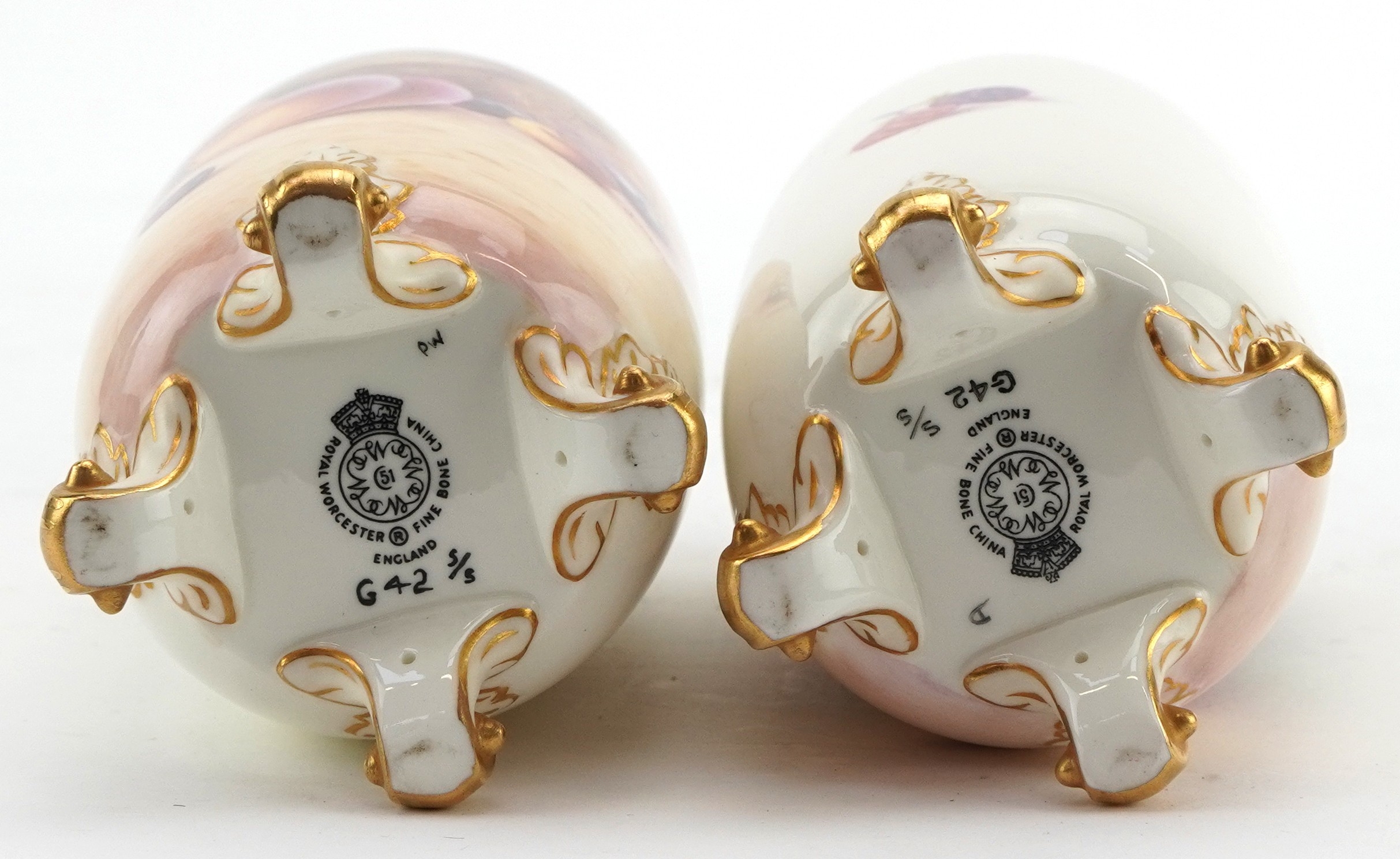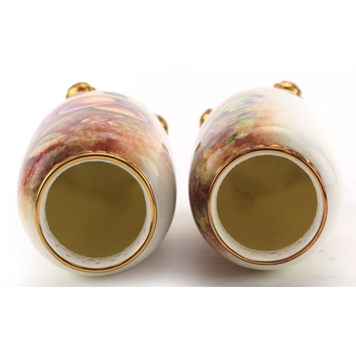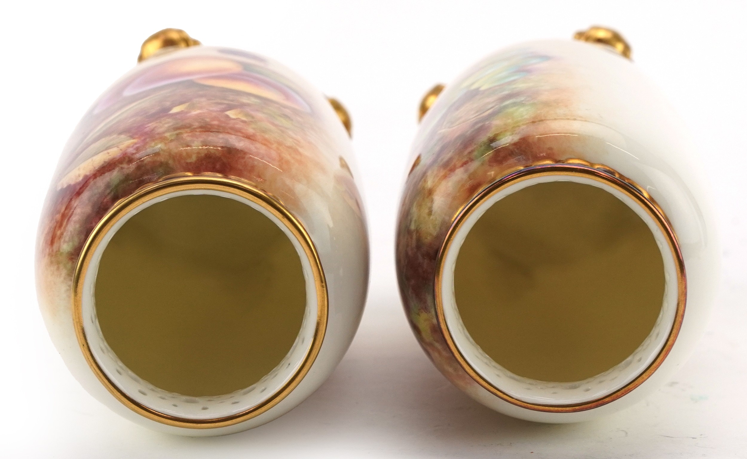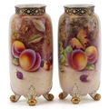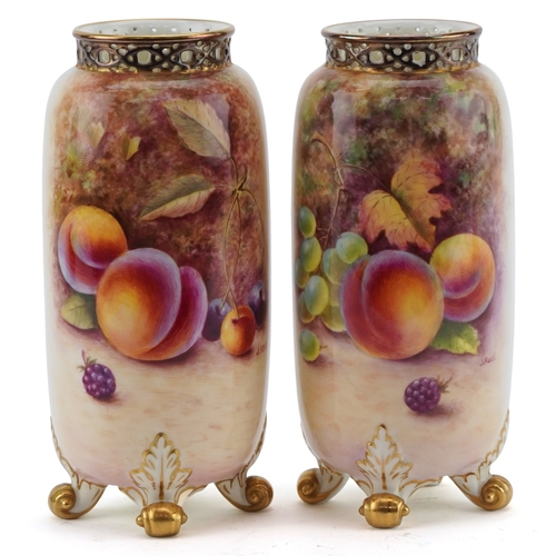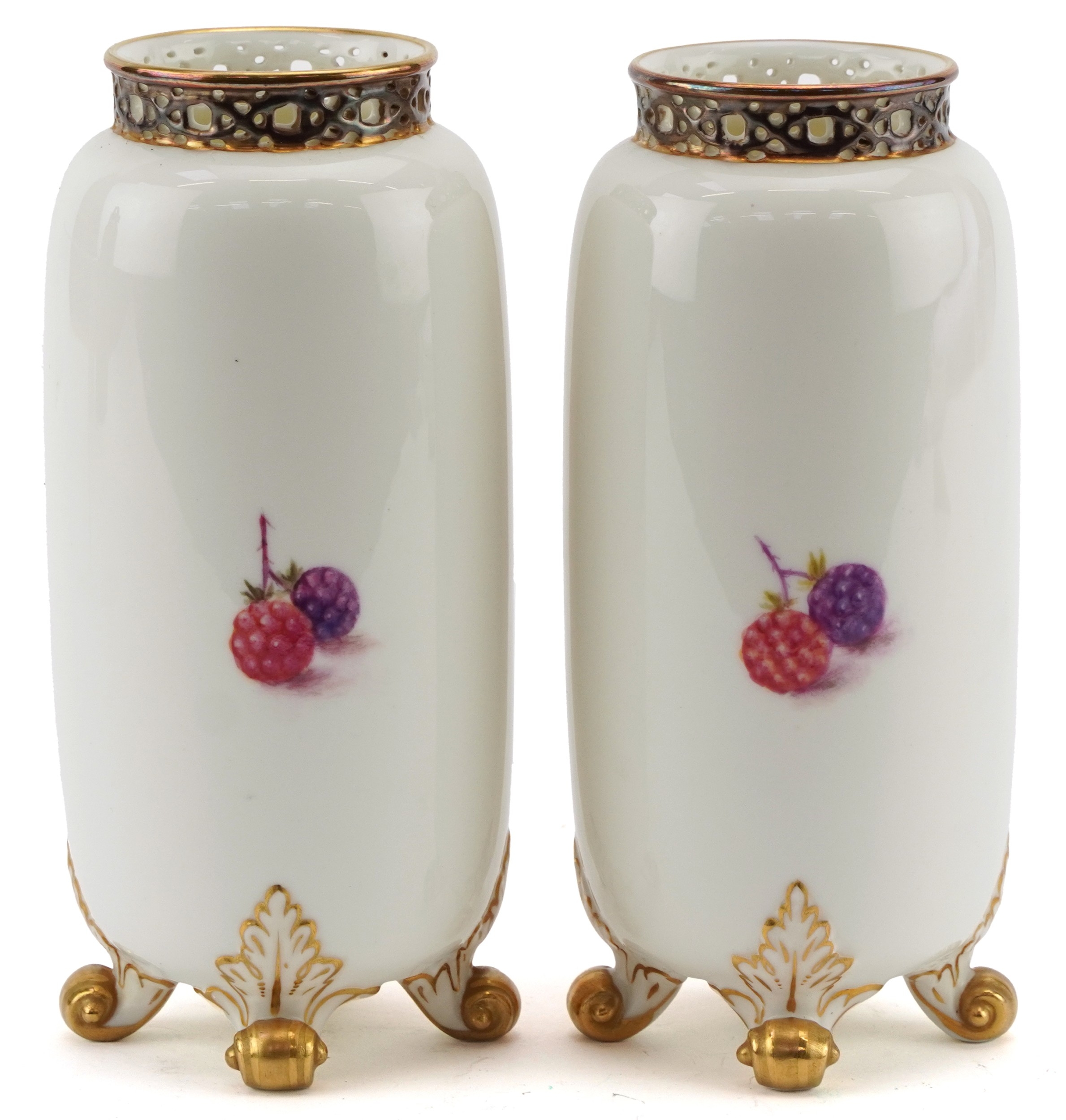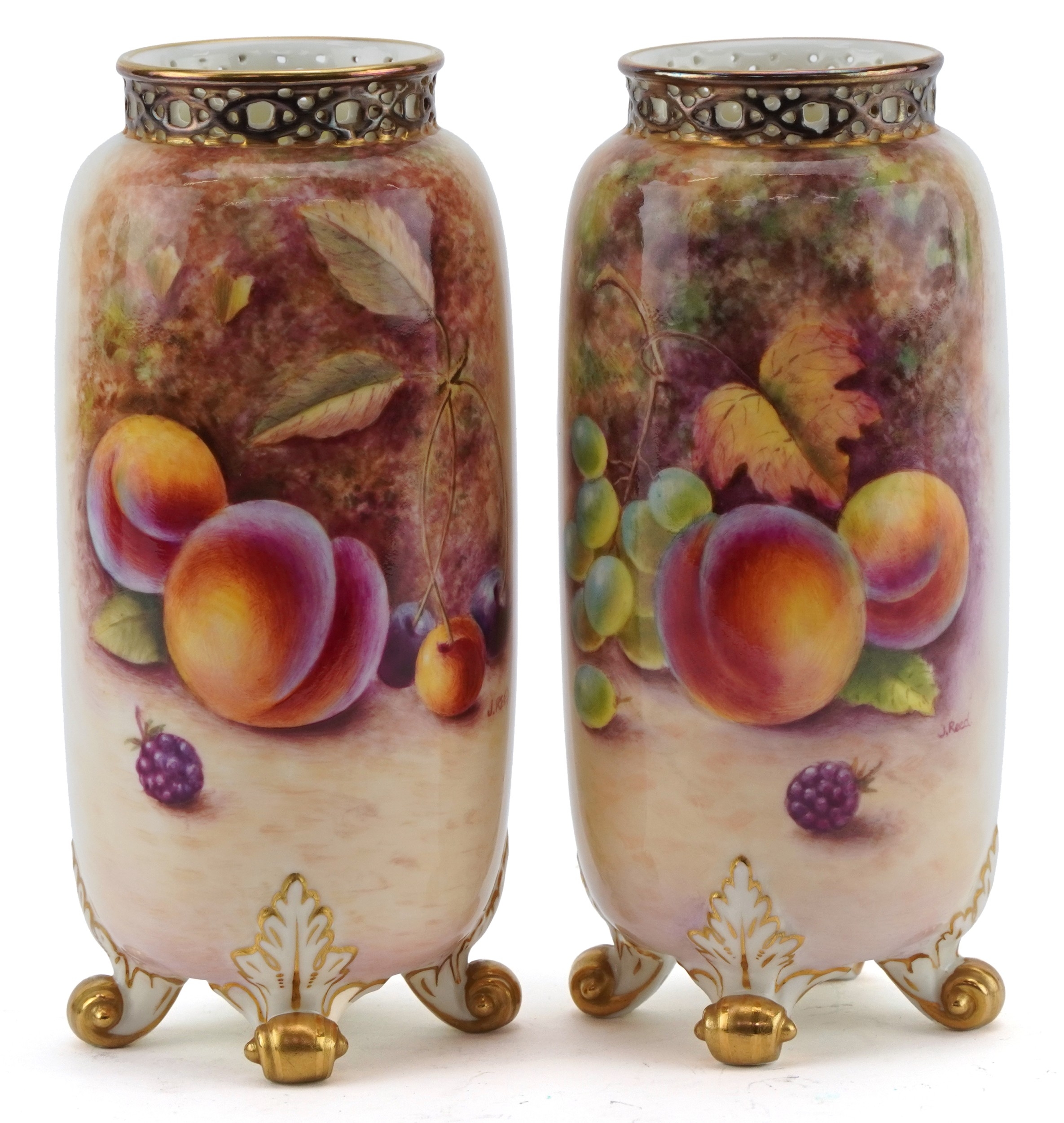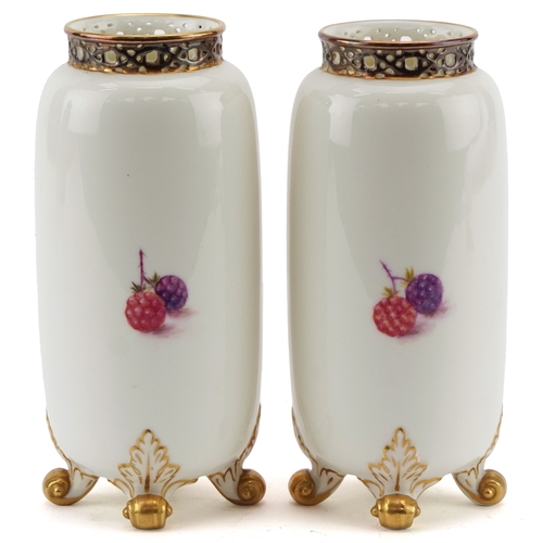 A matched pair of Royal Worcester porcelain spill vases, each hand painted by J Reed with fruit, the largest 14.5cm high.