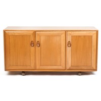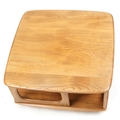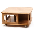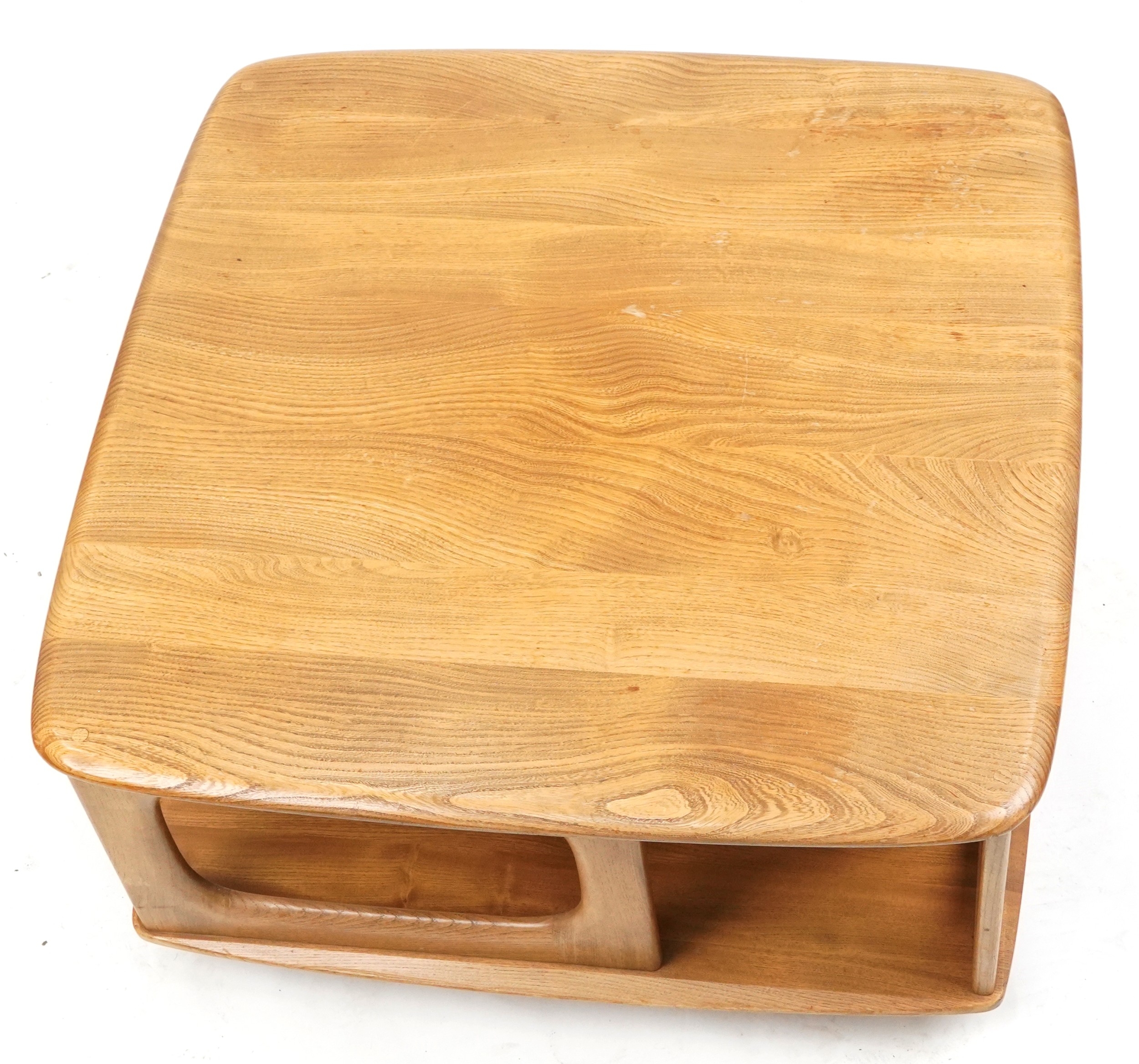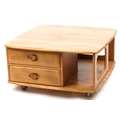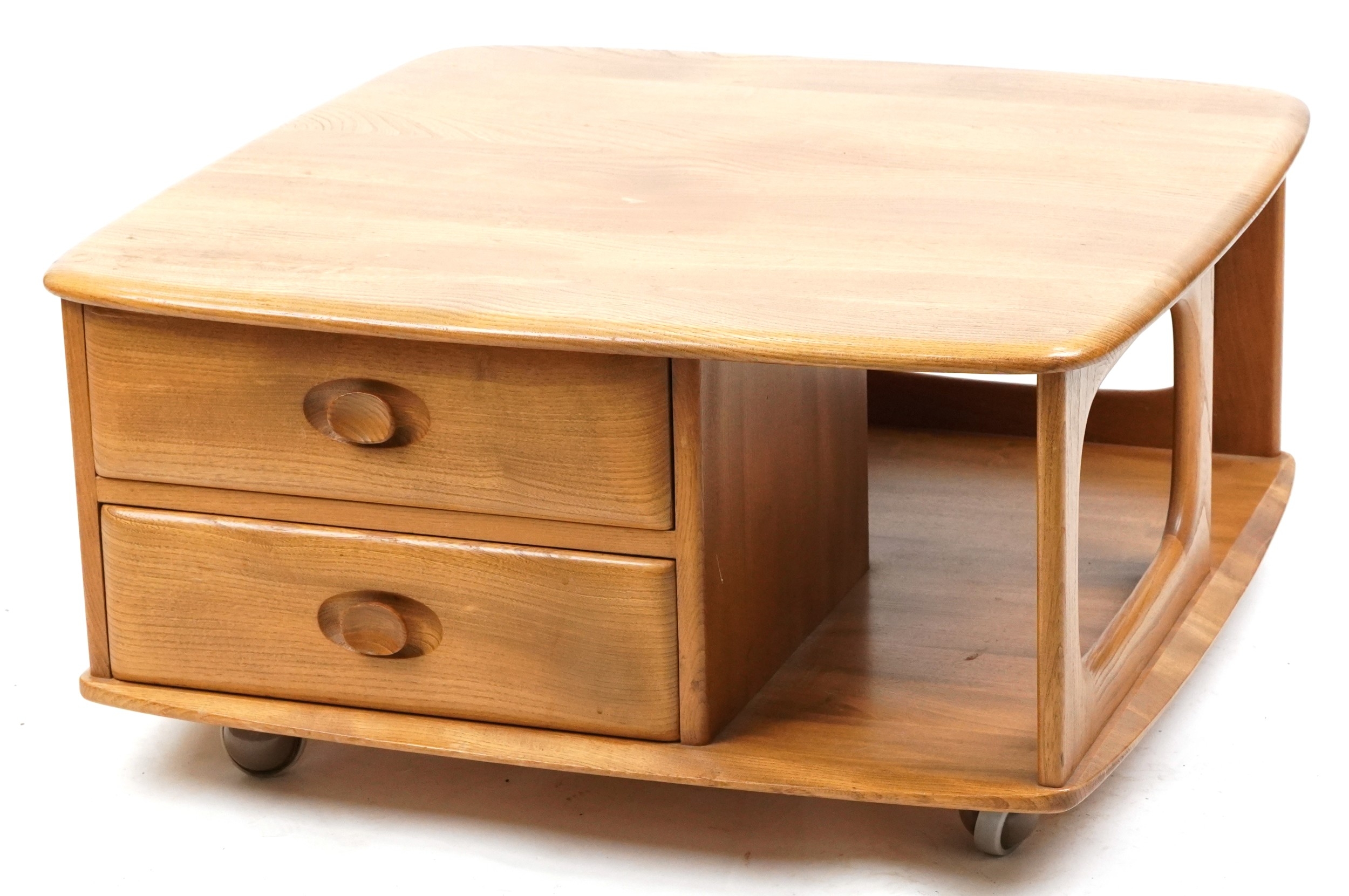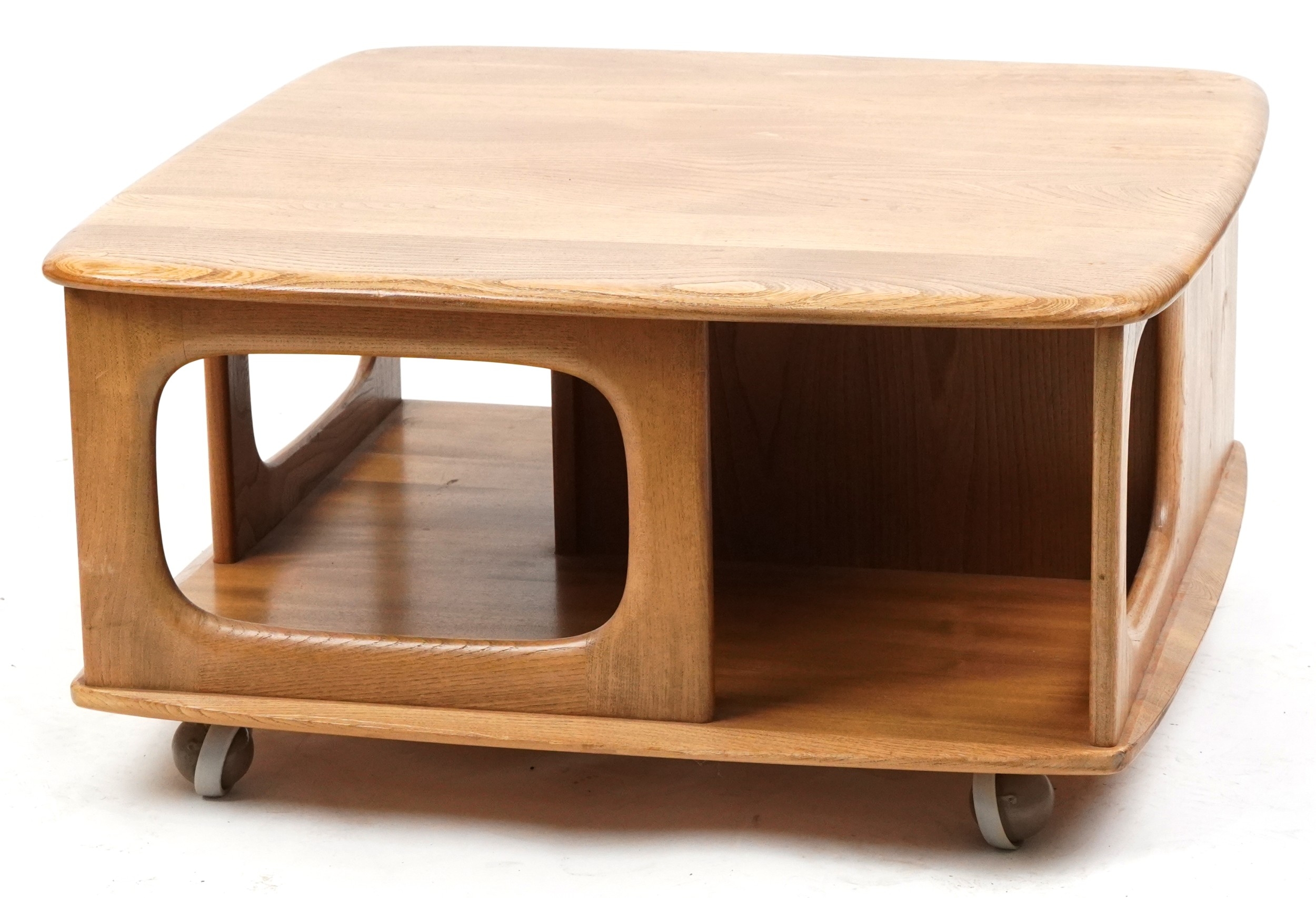 An Ercol elm square coffee table fitted with a drawer and open shelves, on casters, 41cm H x 78cm W x 78cm D.