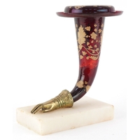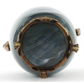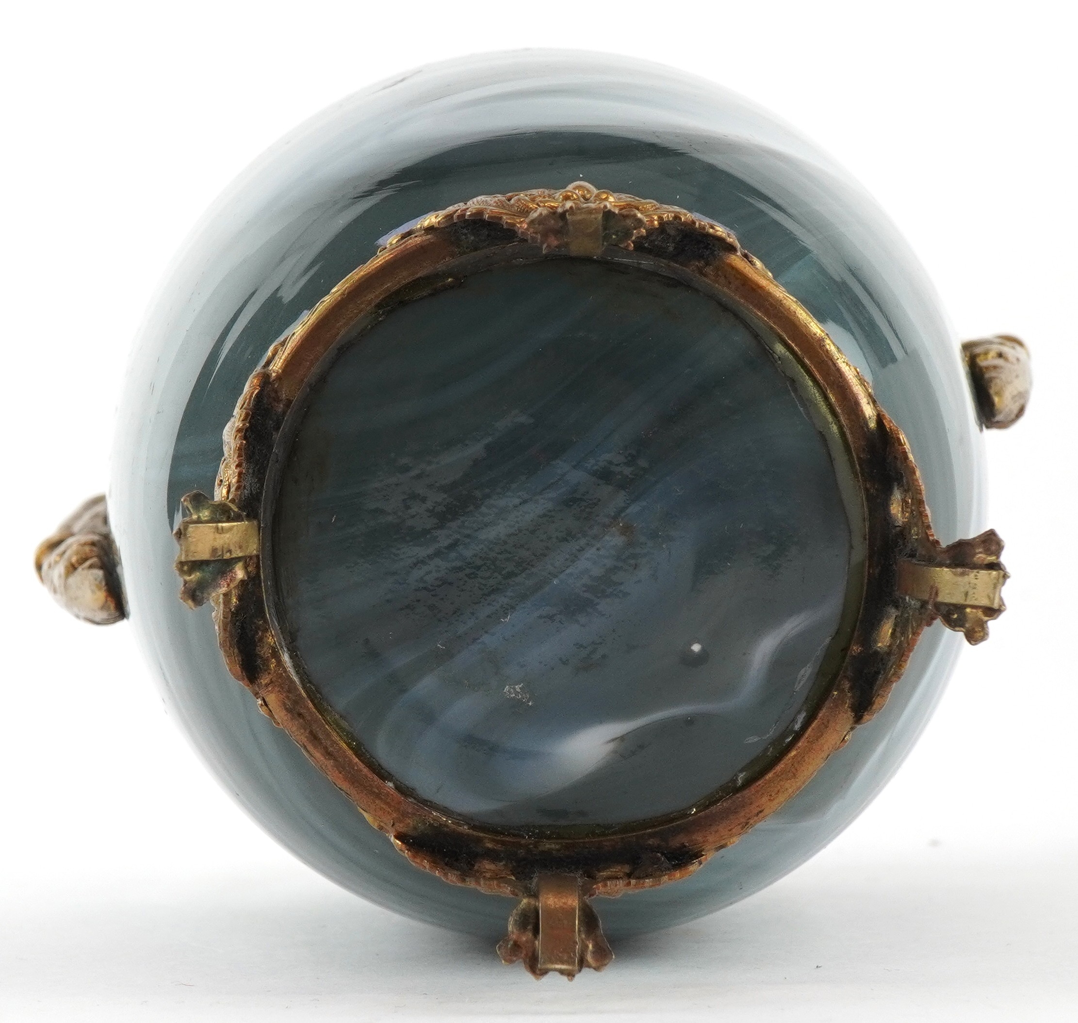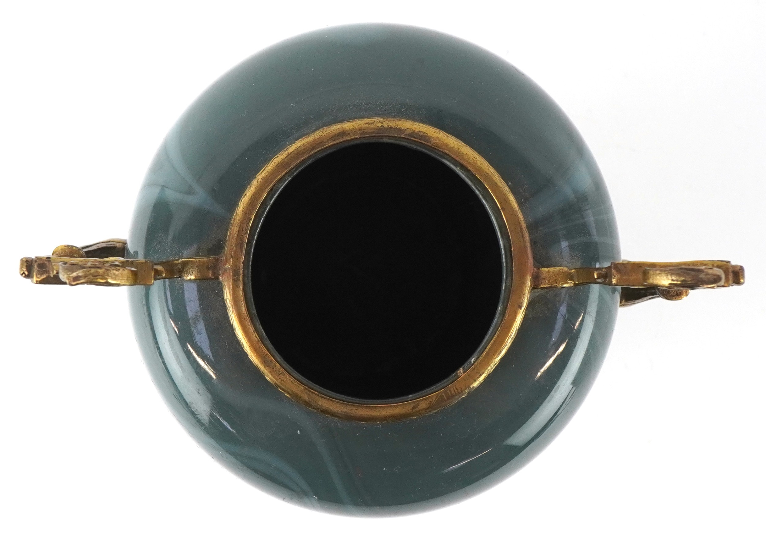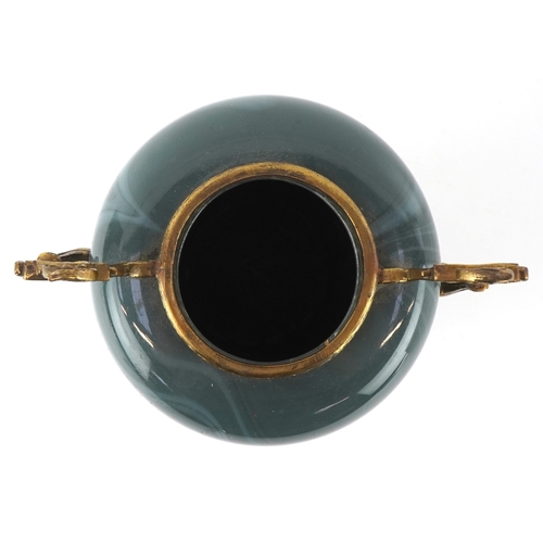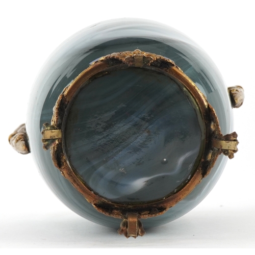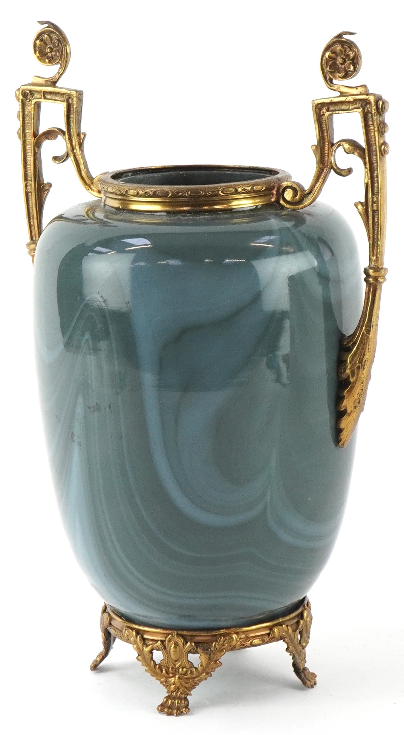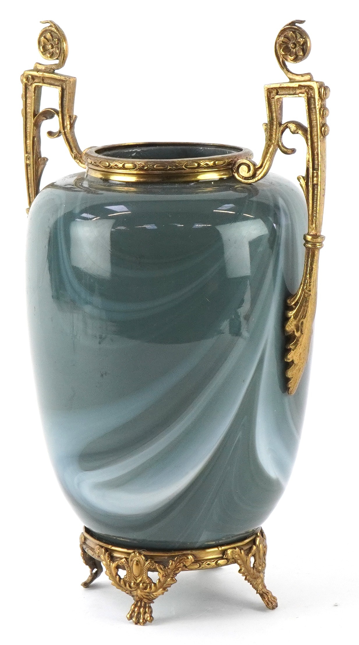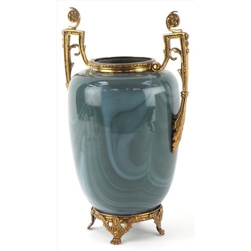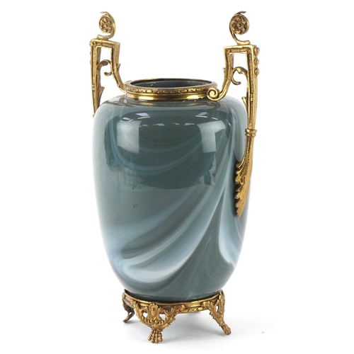 An early 20th century glass vase with gilt metal twin handles, raised on paw feet, 23cm high.