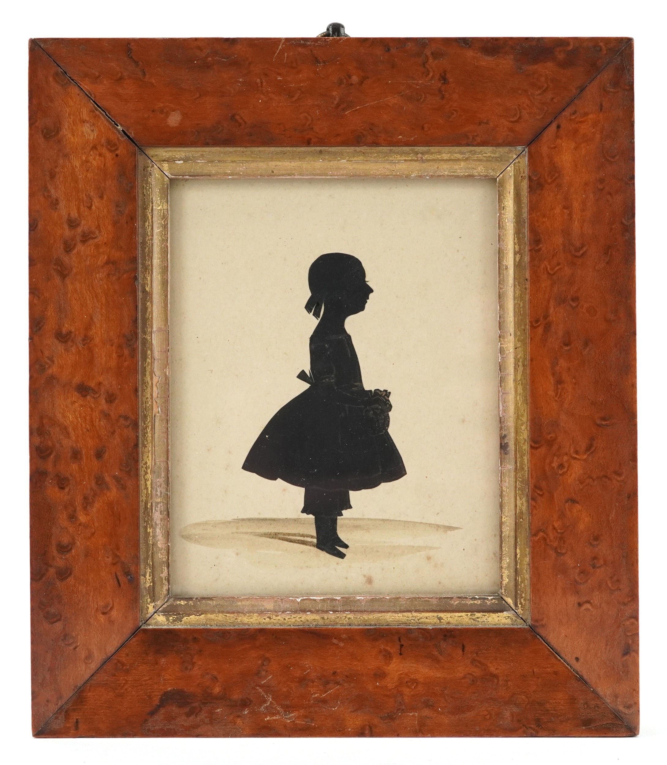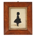 A Georgian hand painted silhouette of a young female, within in a maple frame, 11cm x 9cm.