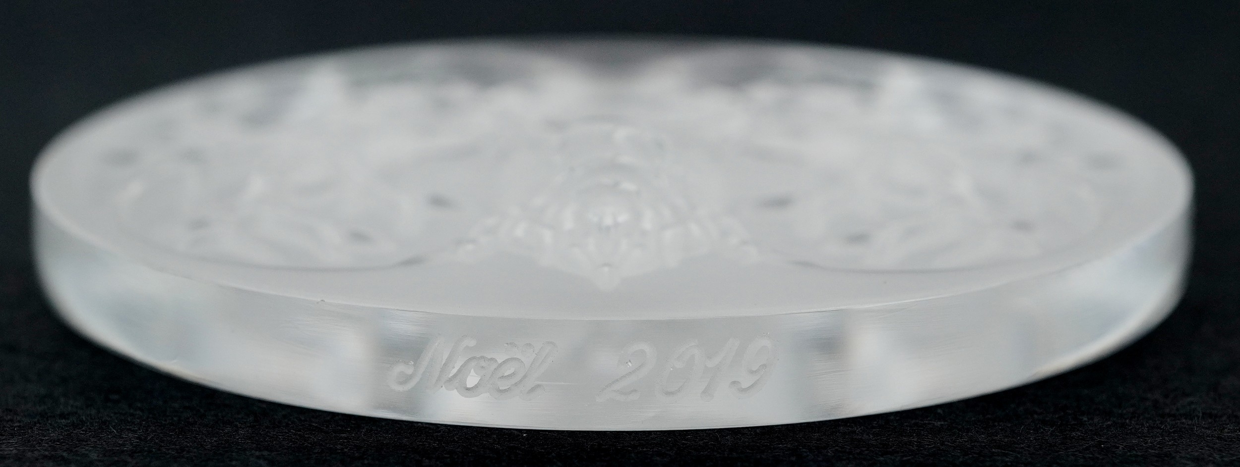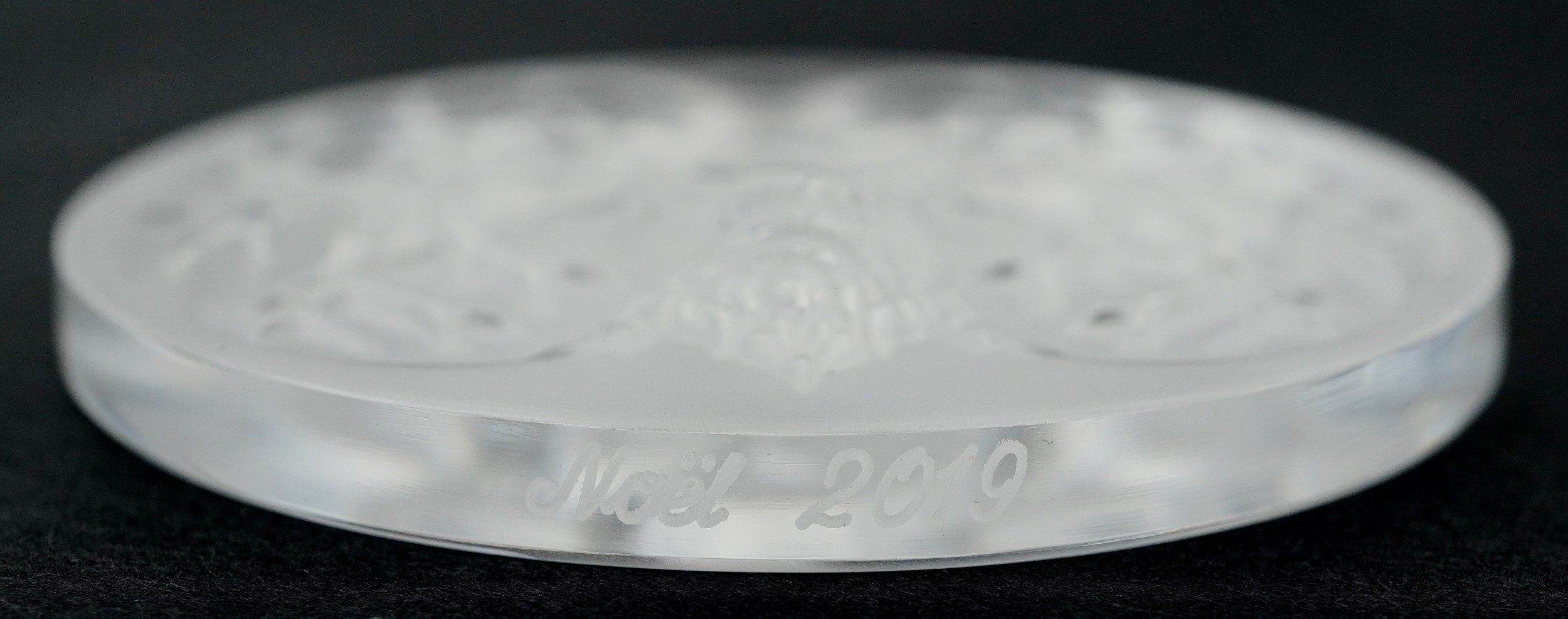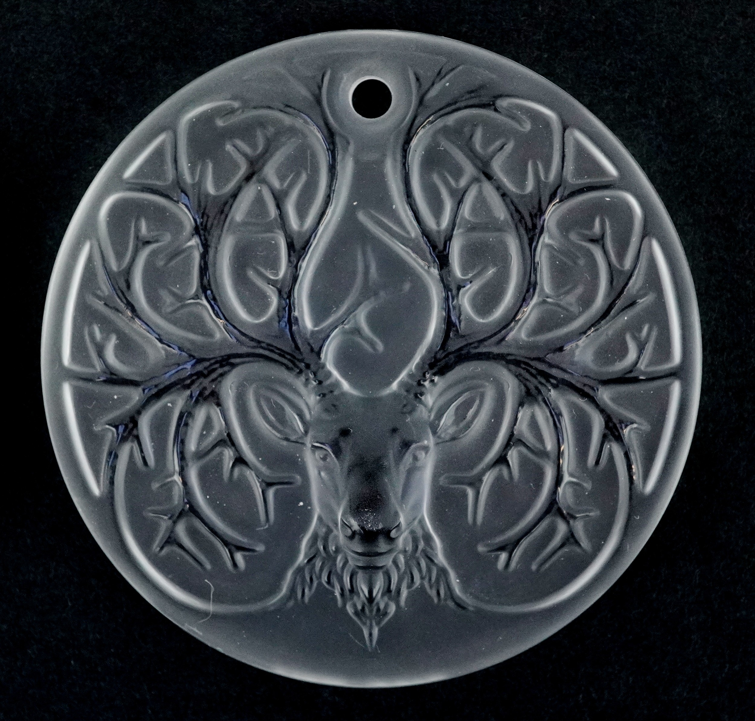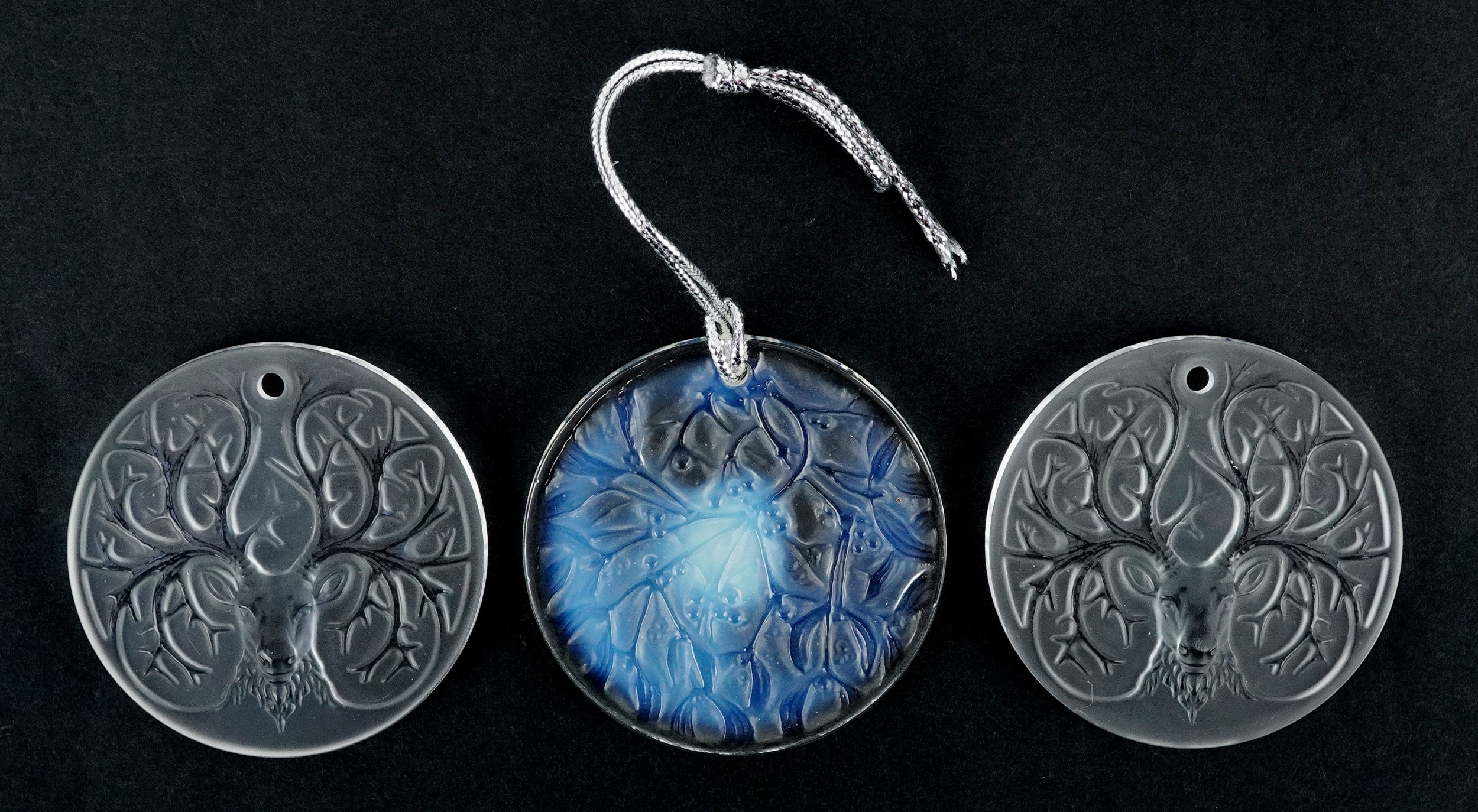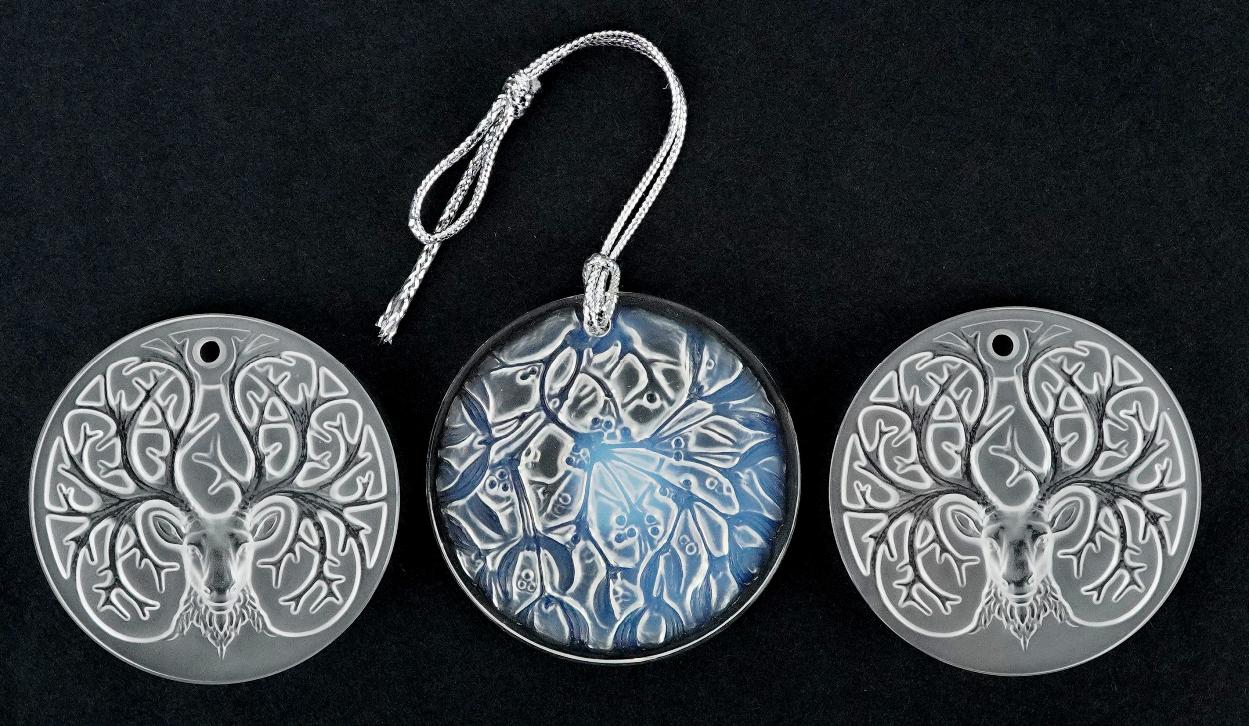 Lalique France, three crystal Christmas tree decorations comprising two reindeer and opalescent mistletoe, 6.5cm in diameter, each boxed.
