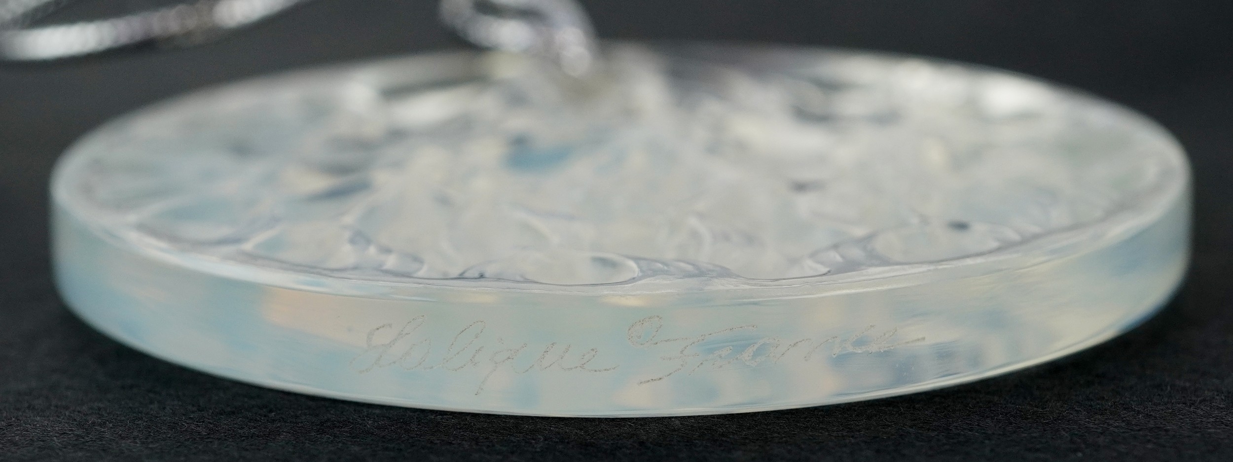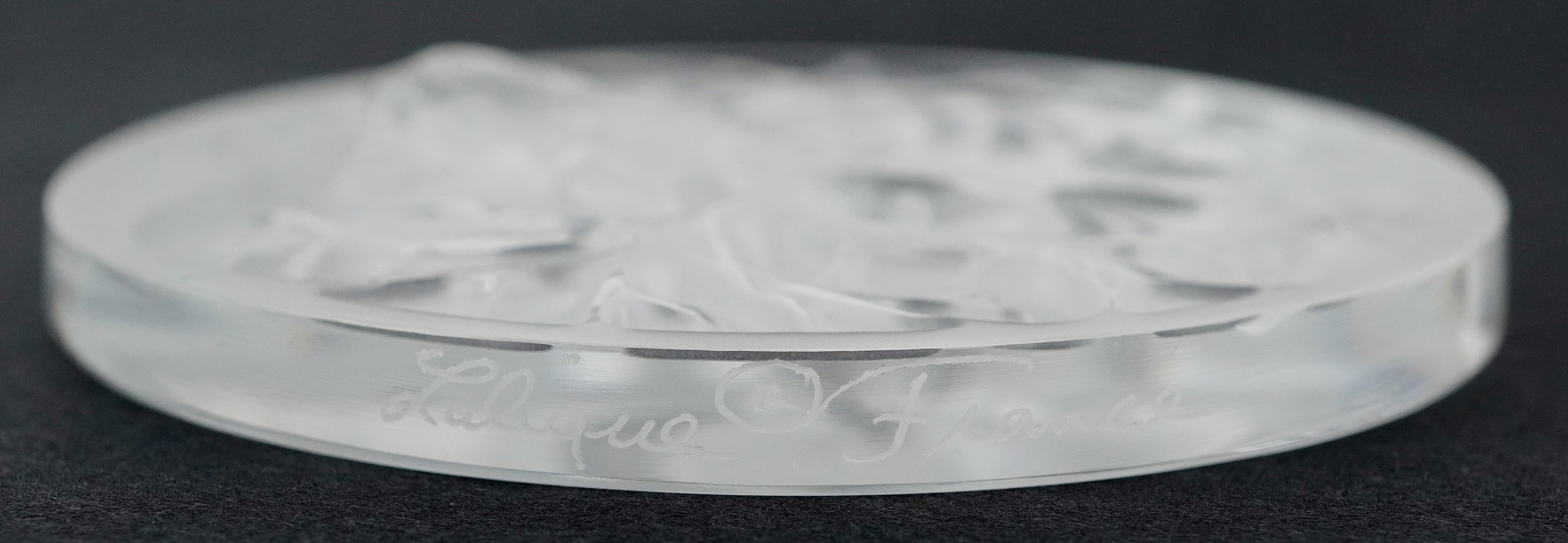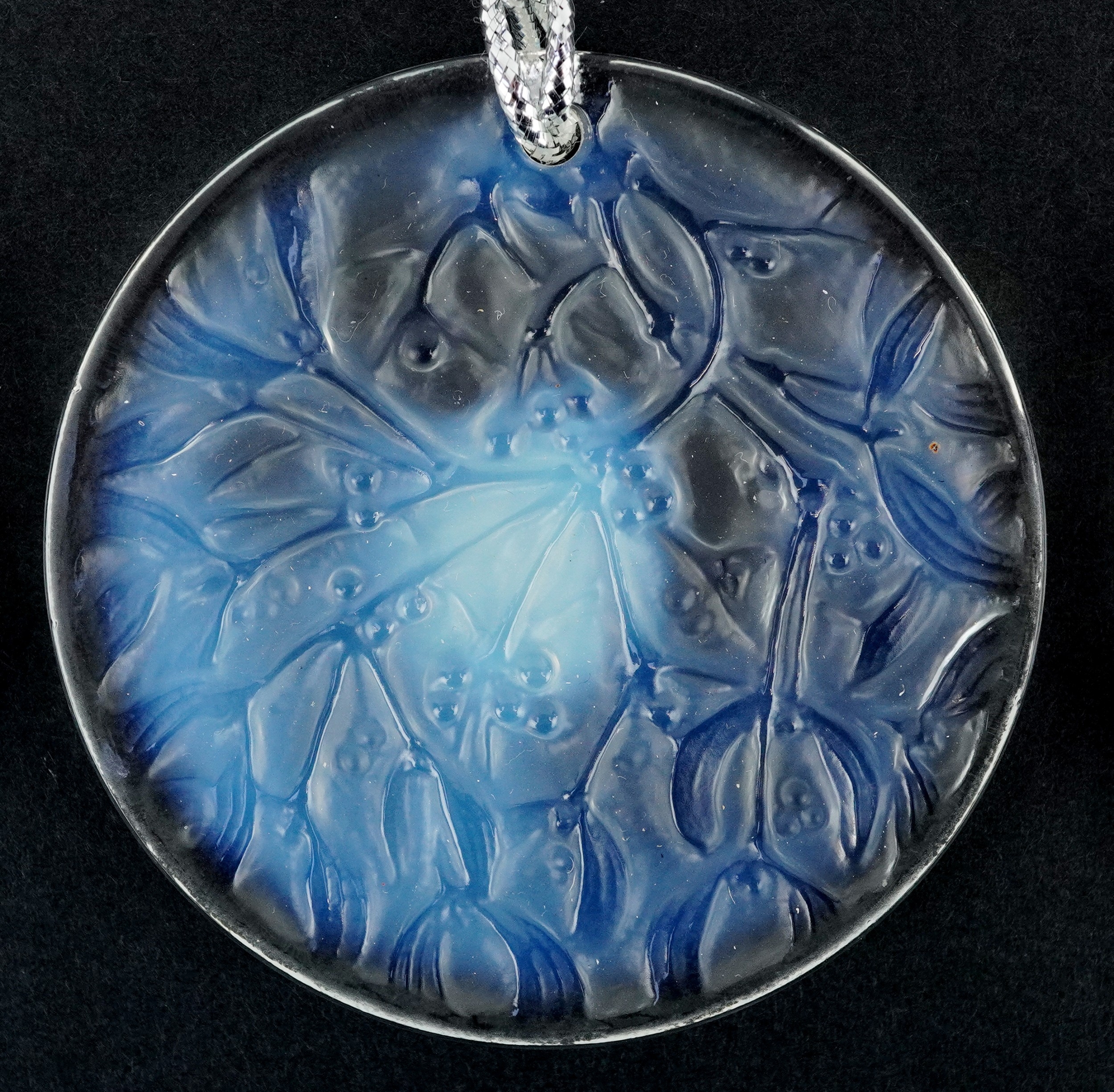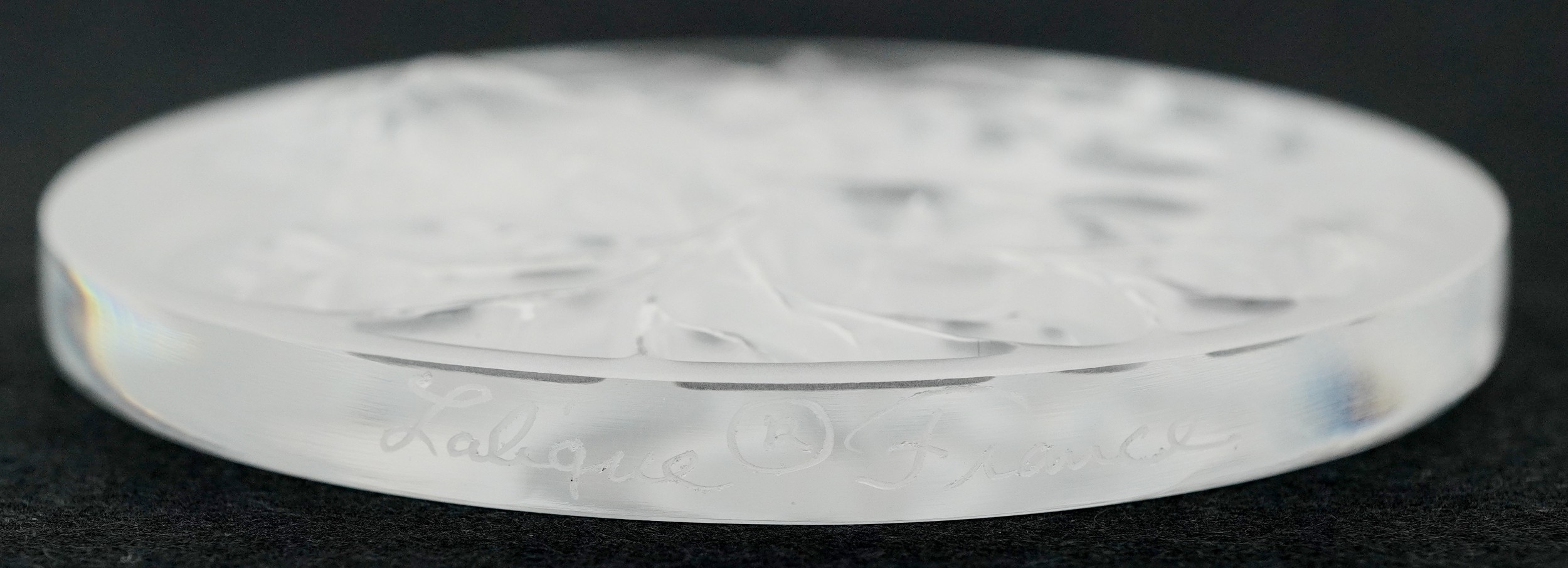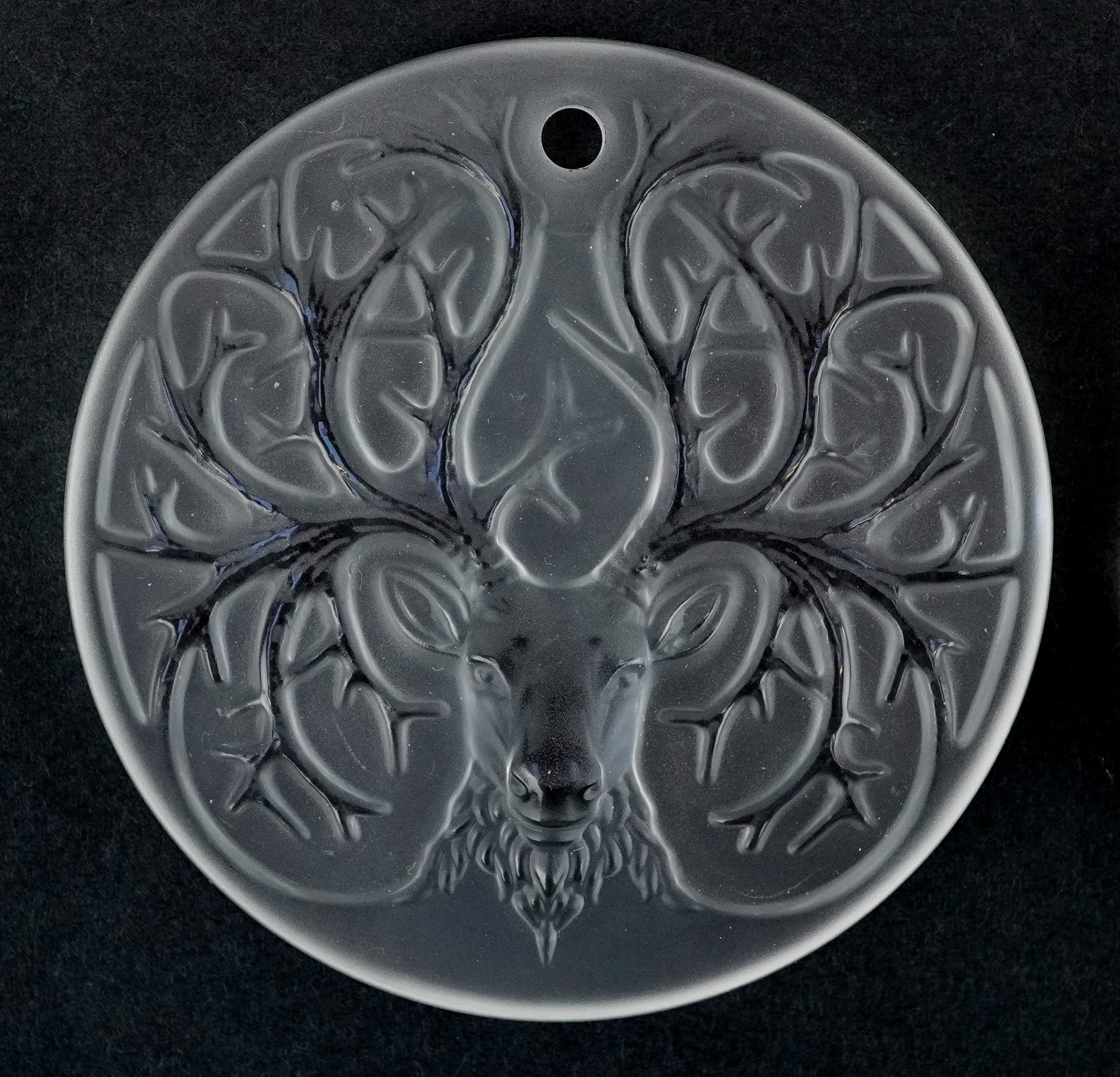 Lalique France, three crystal Christmas tree decorations comprising two reindeer and opalescent mistletoe, 6.5cm in diameter, each boxed.