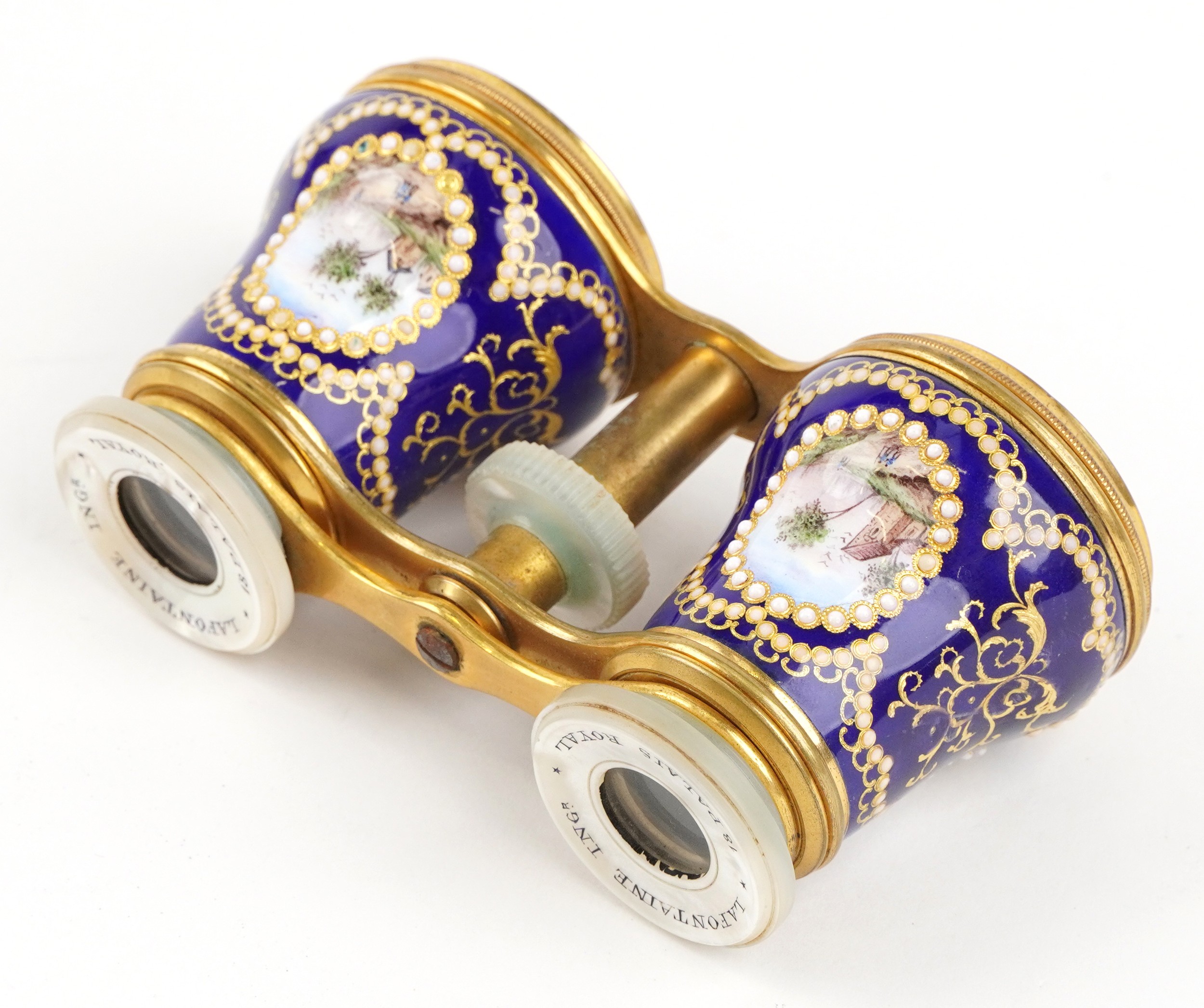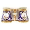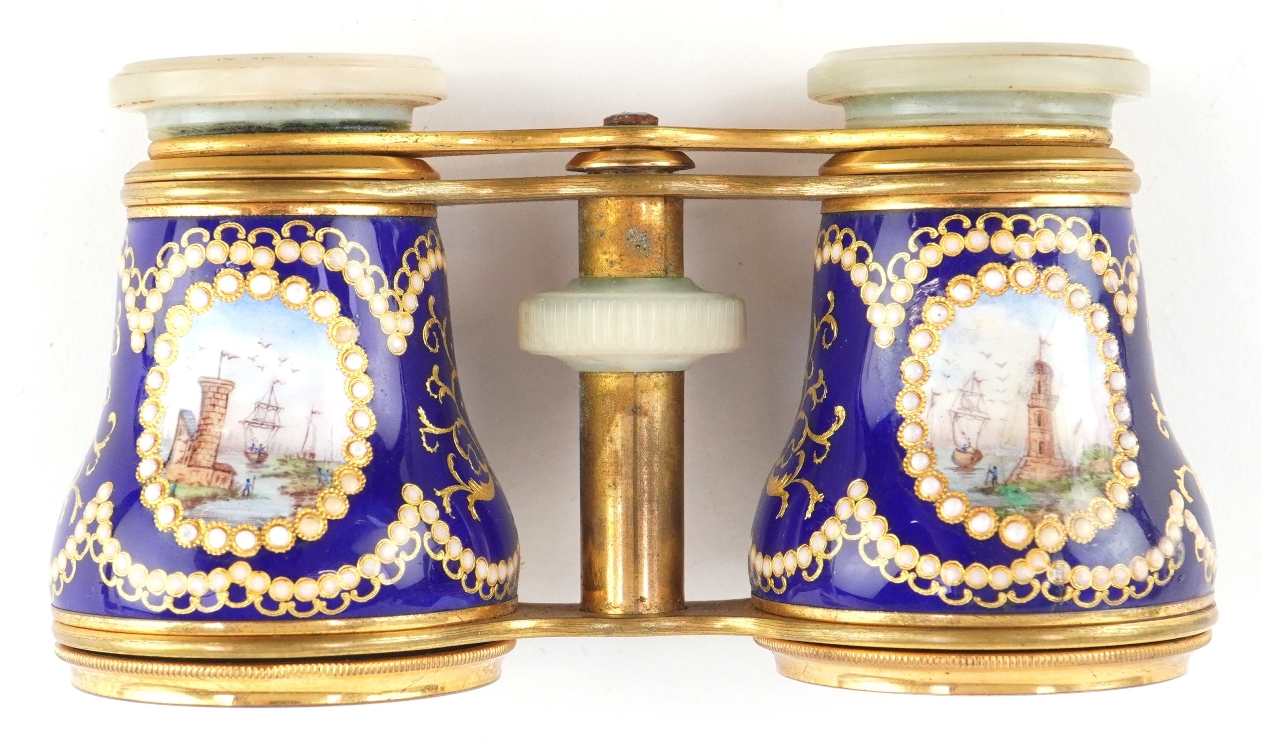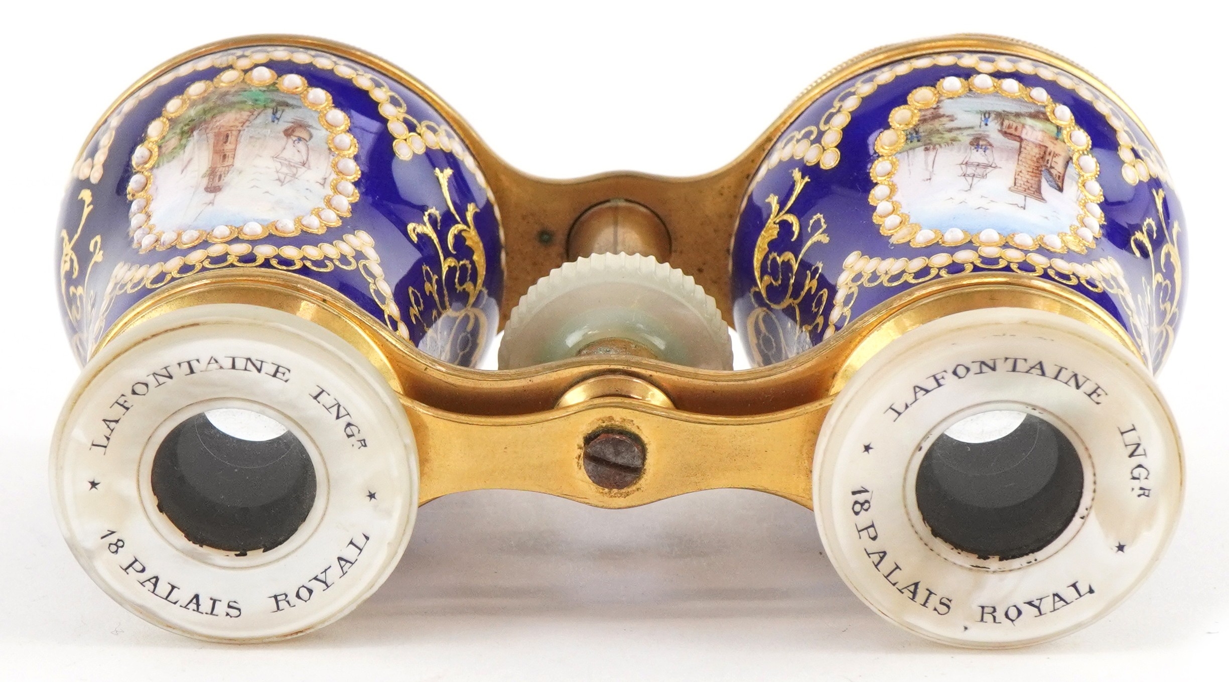 A pair of 19th century Lafontaine gilt brass opera glasses with mother of pearl eyepieces and enamelled barrels finely hand painted with rural French landscapes and ships, inscribed 18 Palais Royal, 11cm wide.