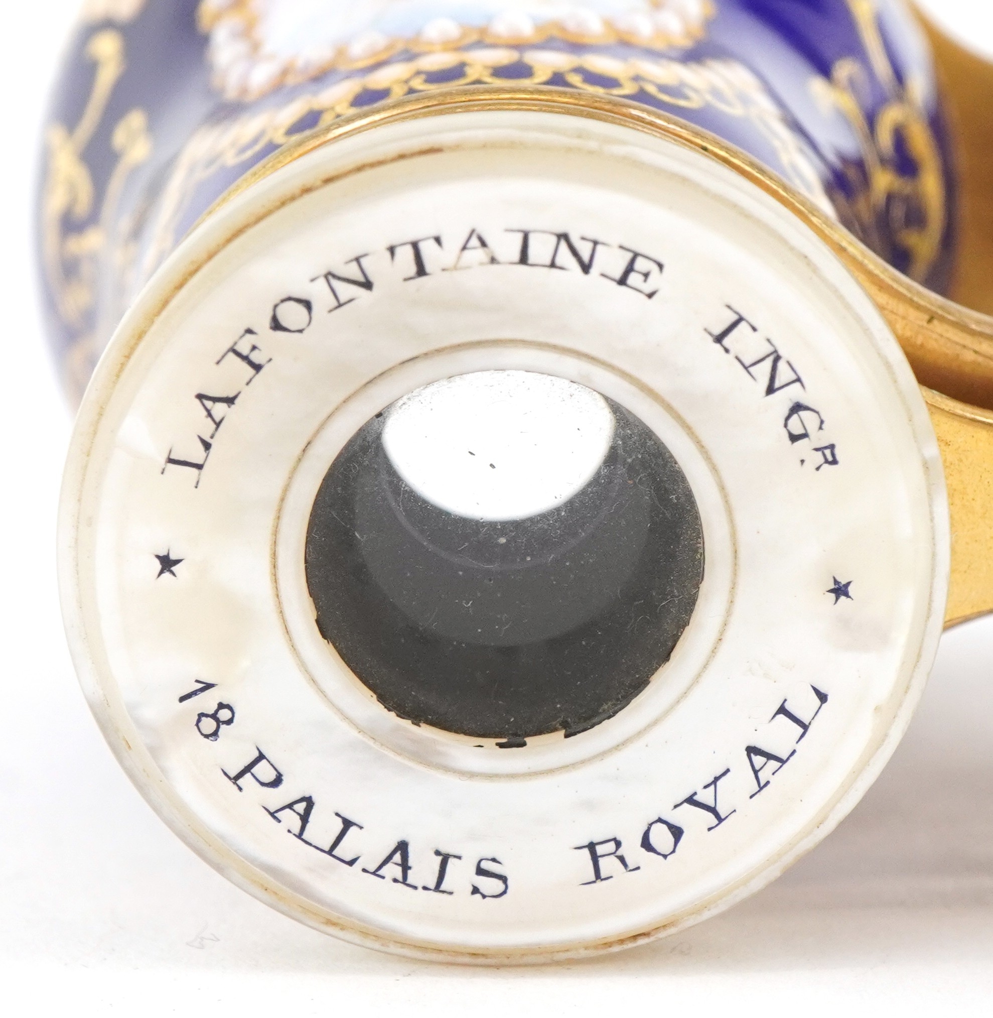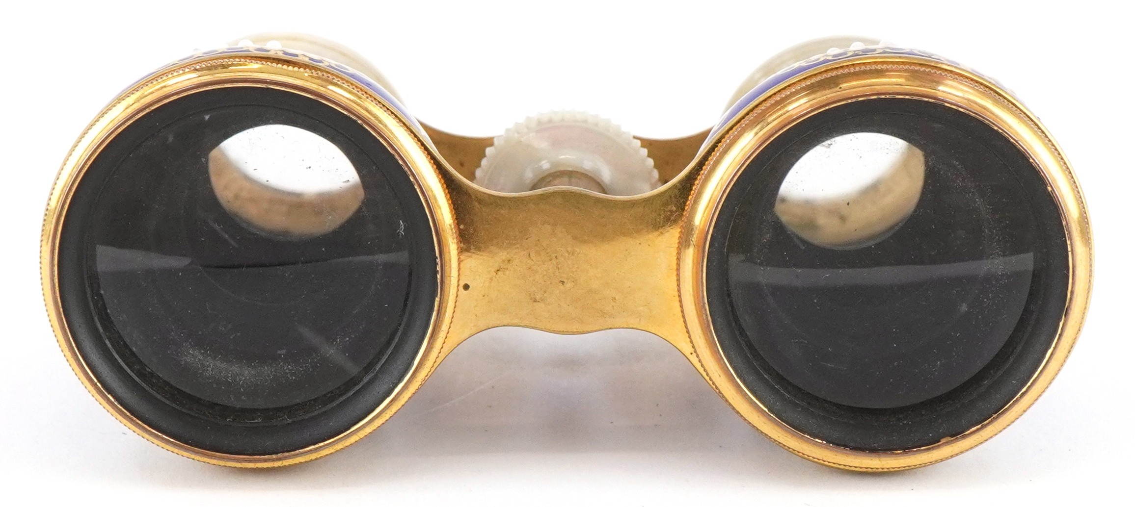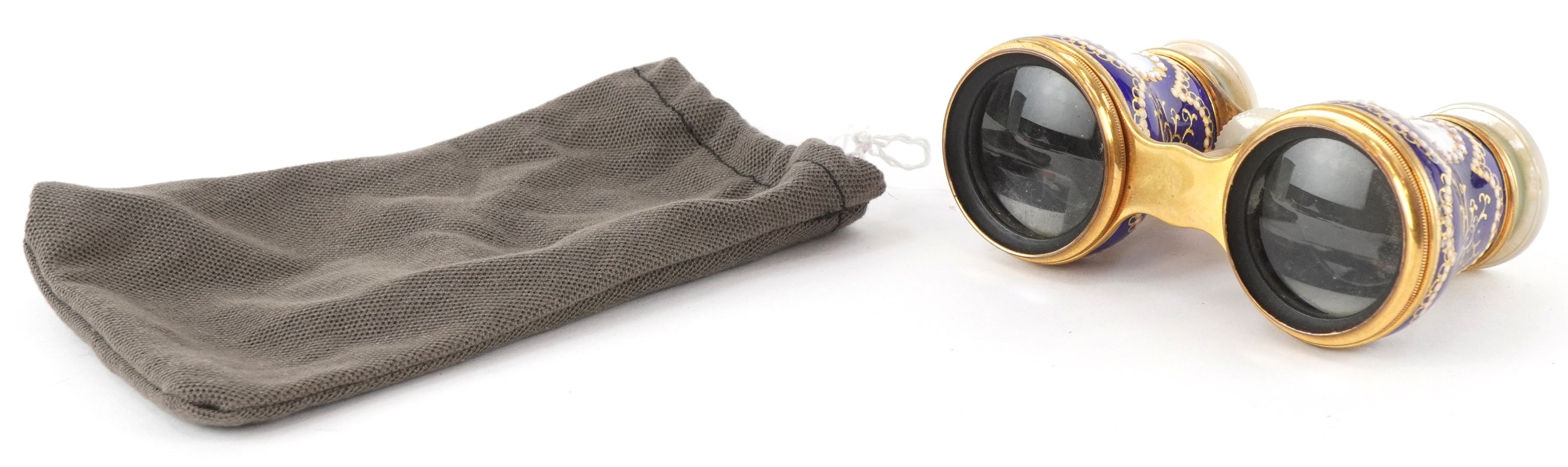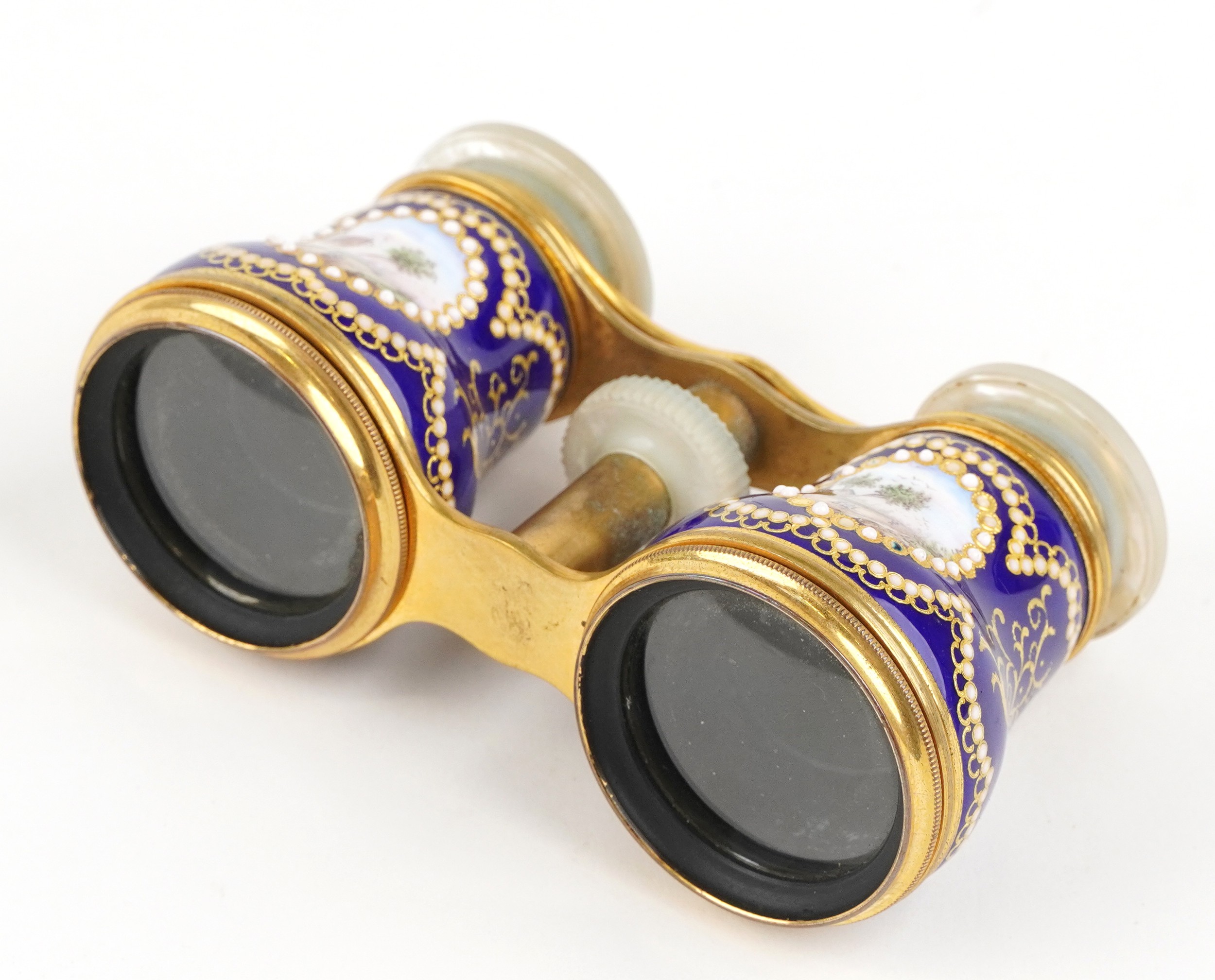 A pair of 19th century Lafontaine gilt brass opera glasses with mother of pearl eyepieces and enamelled barrels finely hand painted with rural French landscapes and ships, inscribed 18 Palais Royal, 11cm wide.