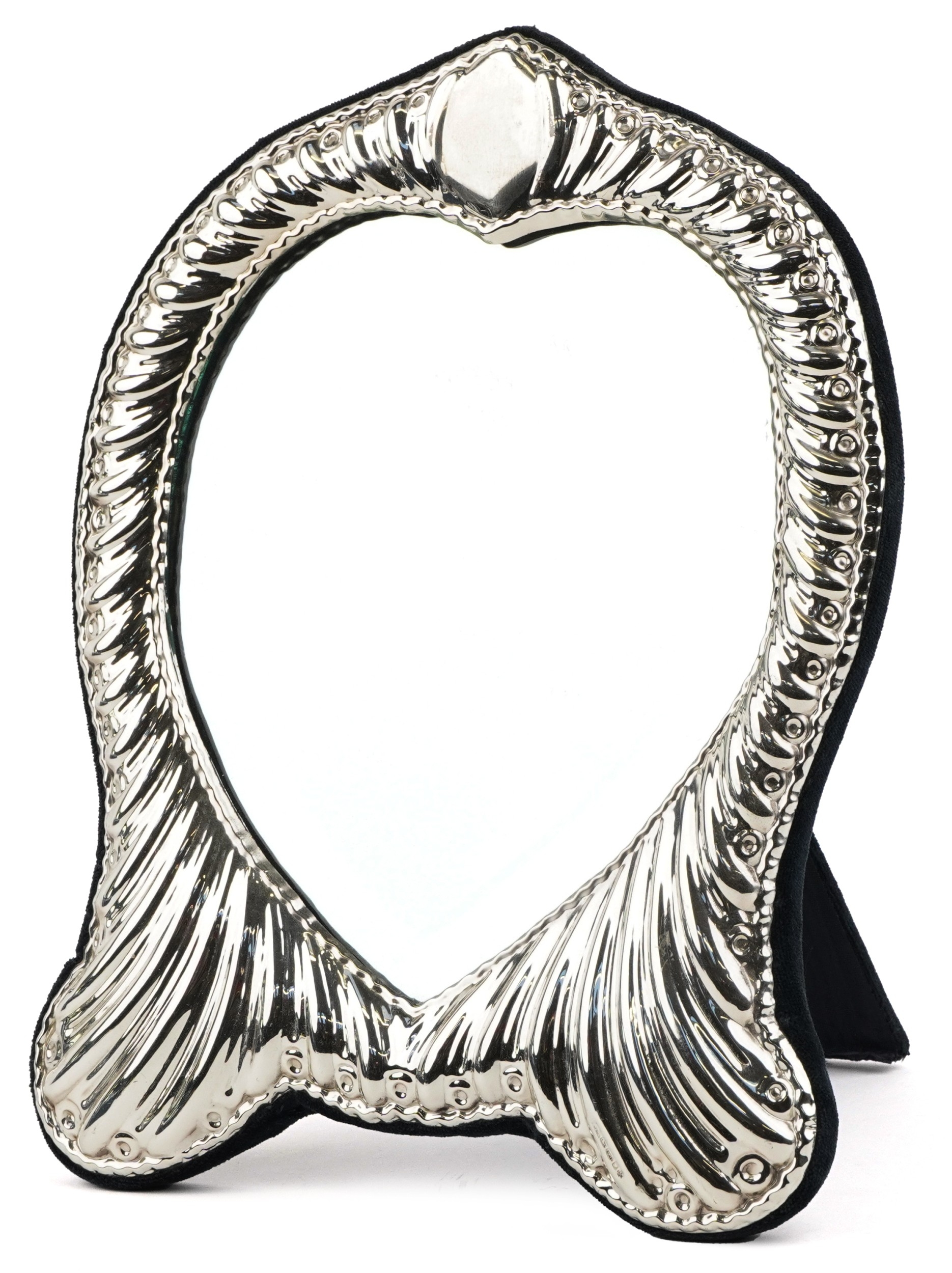 J C, an Elizabeth II silver easel mirror with bevelled glass and embossed decoration, London 2000, 26cm high x 20cm wide.