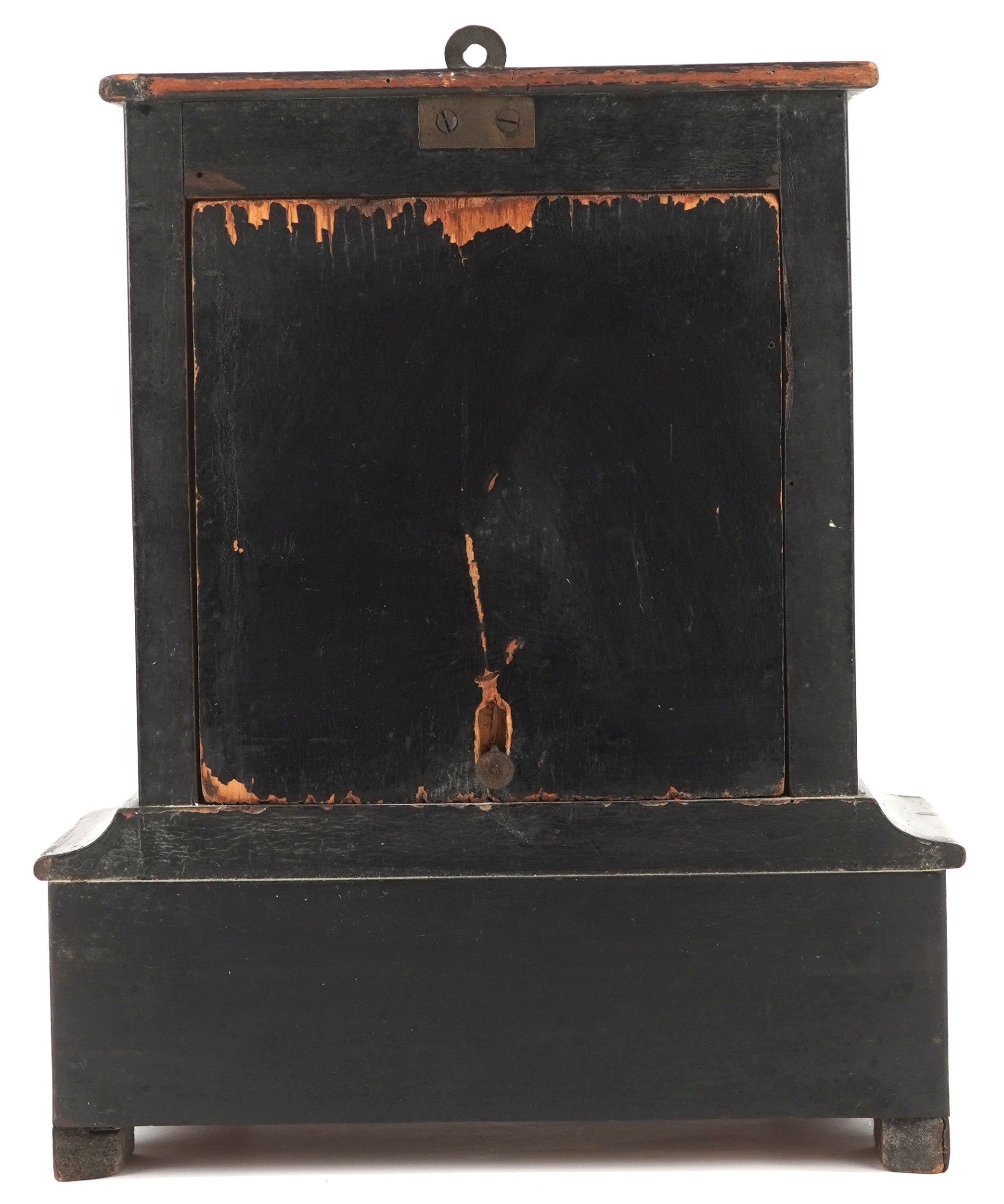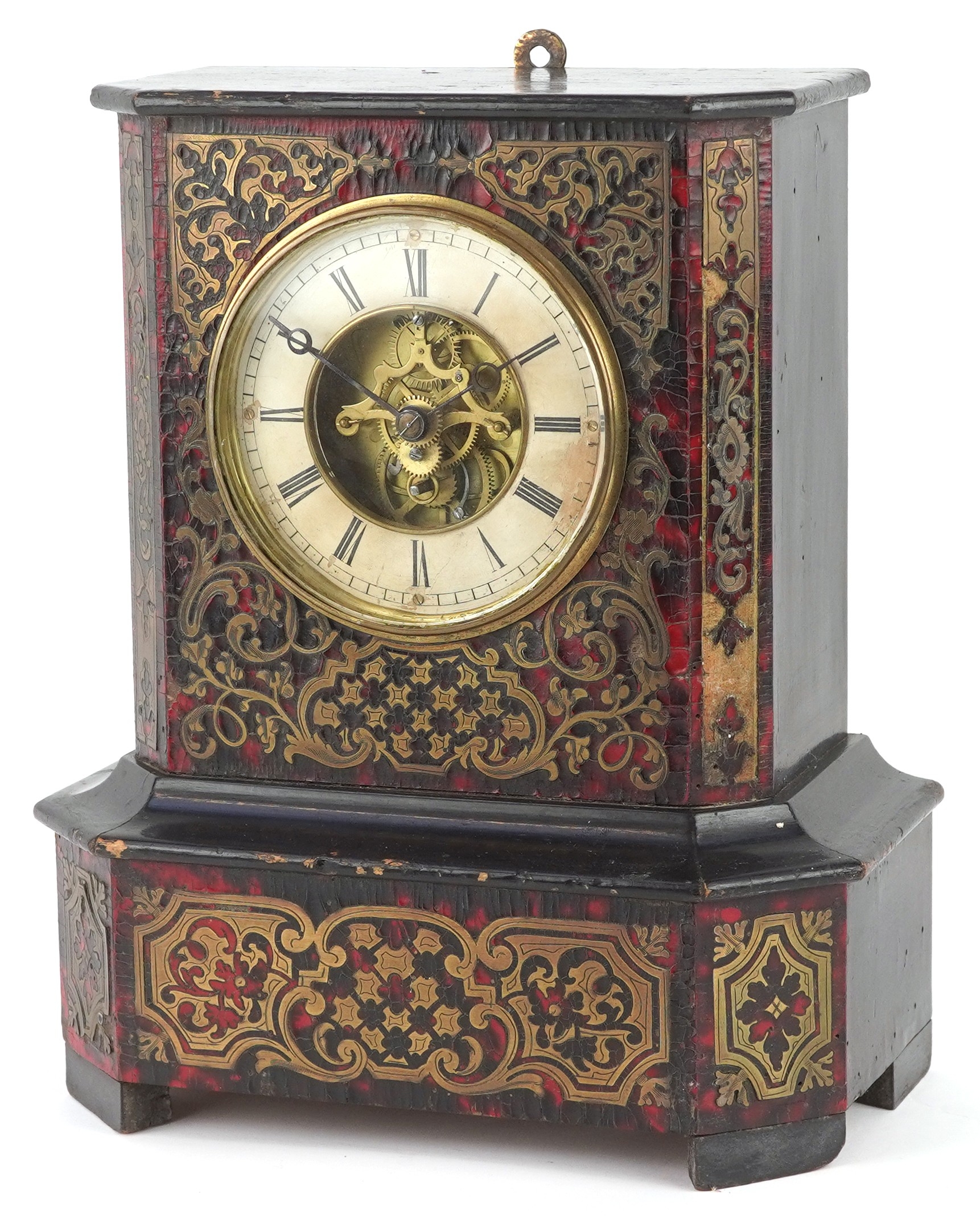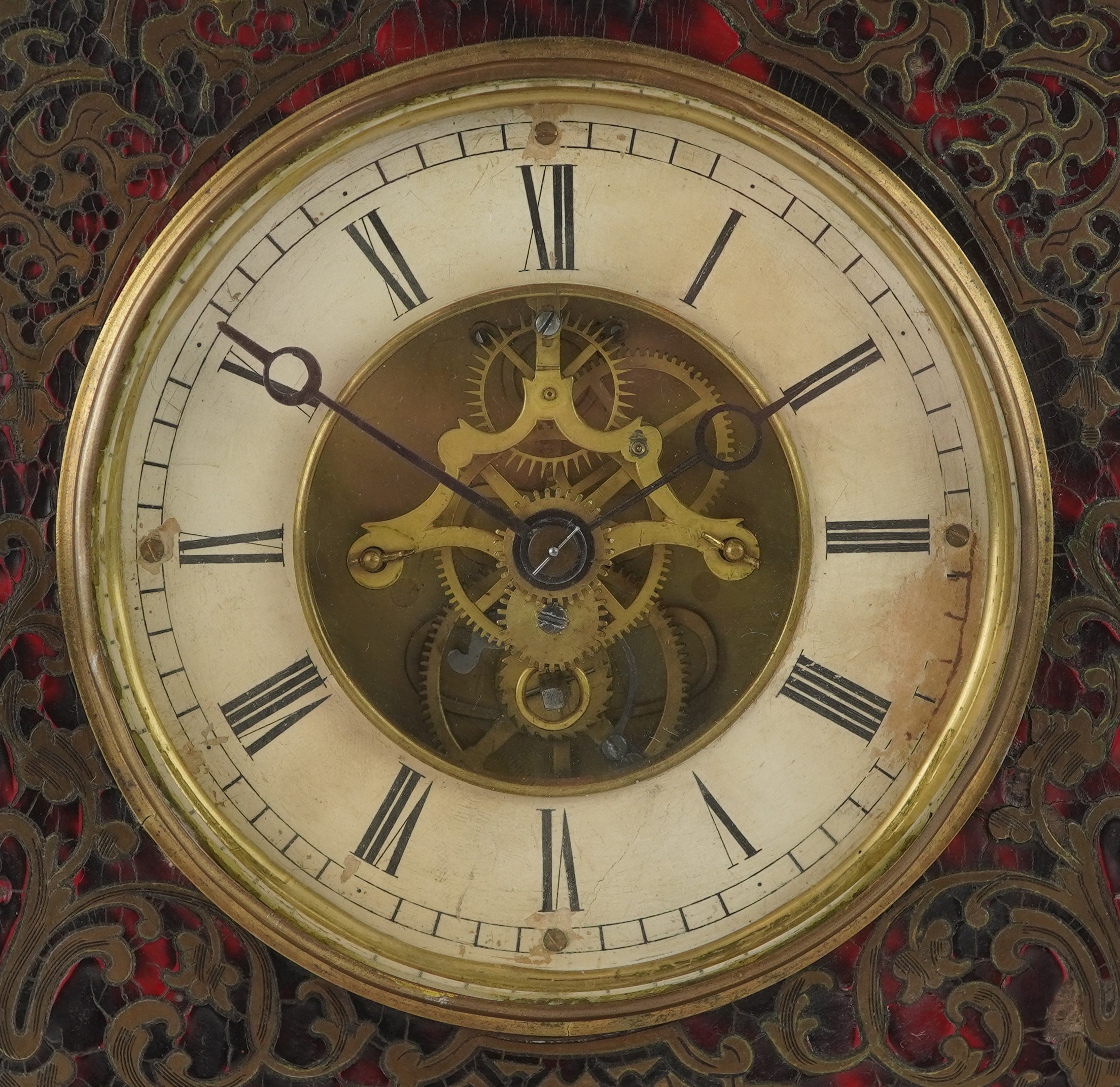 A 19th century boulle work and tortoiseshell mantle clock, the ebonised case with a circular white enamelled dial having black Roman numerals, 29cm H x 25cm W x 14cm D.