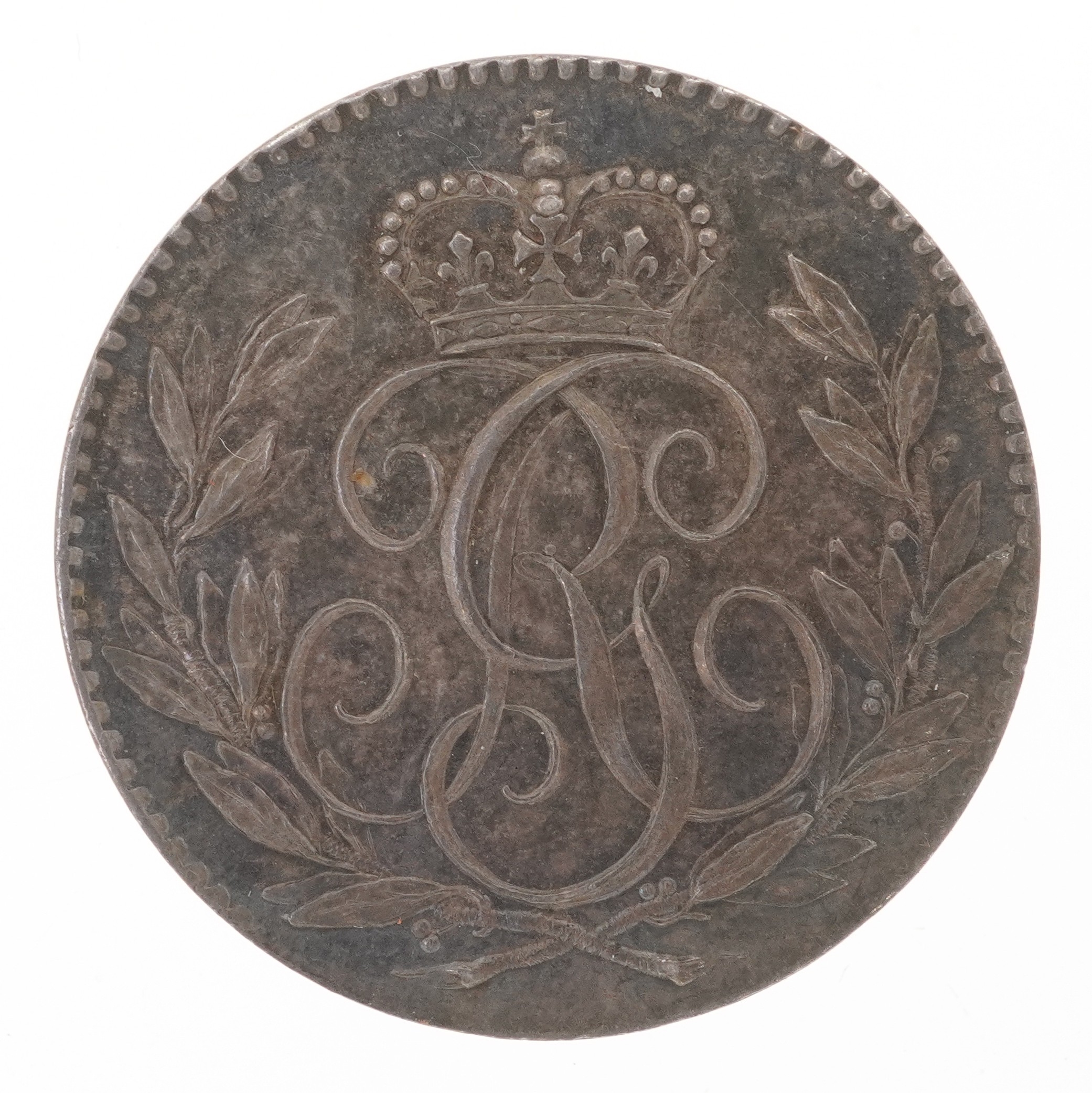 A 1791 King George III Britannia pattern sixpence, the obverse having a royal cypher interlinked G & R surrounded by laurel branches and a crown above GR. The reverse showing seated Britannia facing left with Britannia above in letters, dated 1791 below, 20.6cm in diameter, 2.70g.