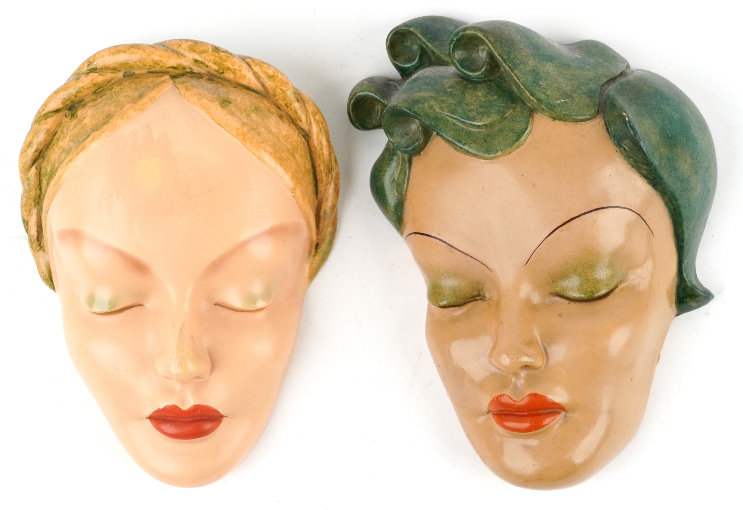 Two Art Deco pottery female wall masks, one by Leonardene Co., the largest 26cm high.