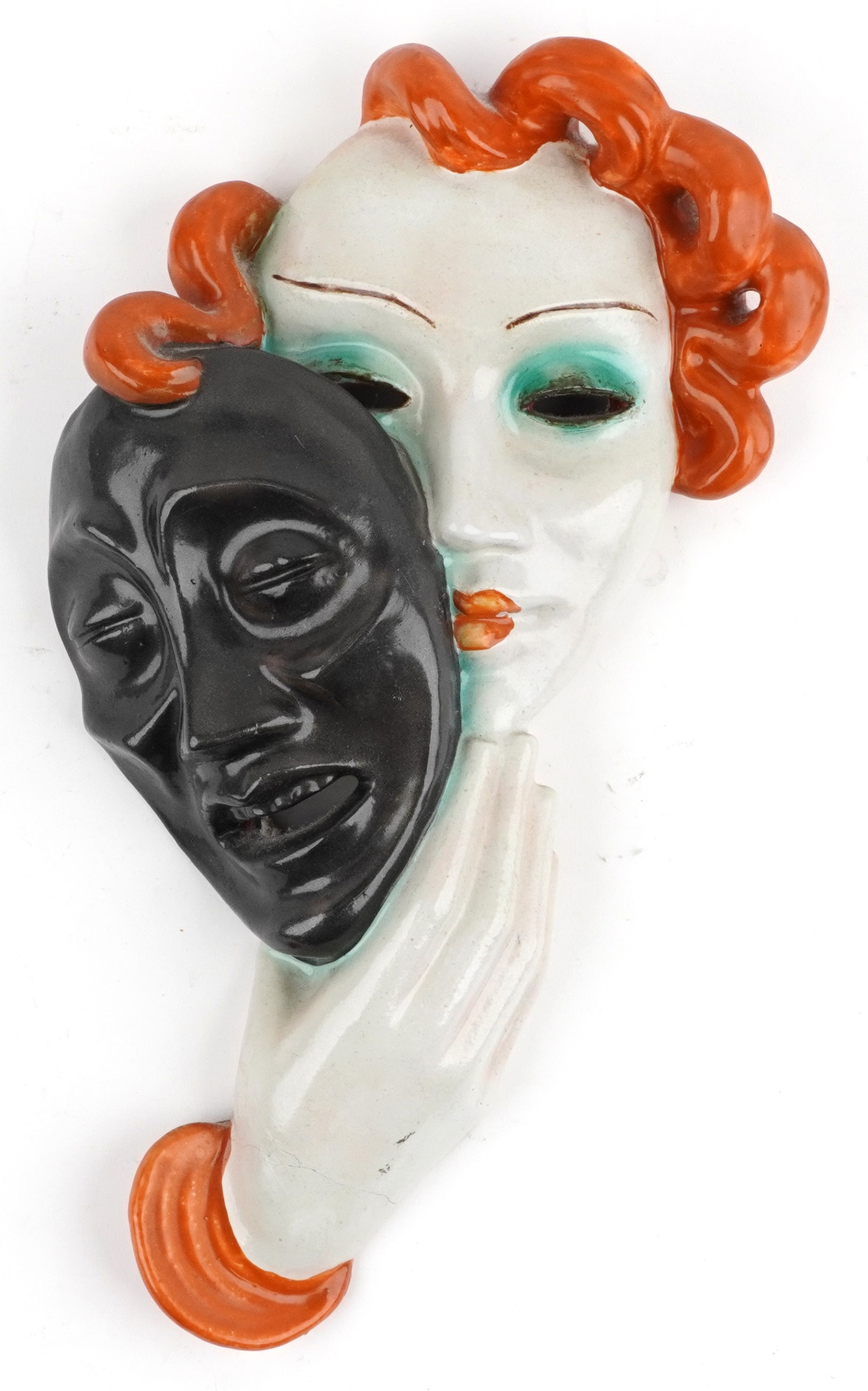 An Art Deco terracotta 'tragedy' wall mask of a female behind a mask, probably Goldscheider, 36cm high.