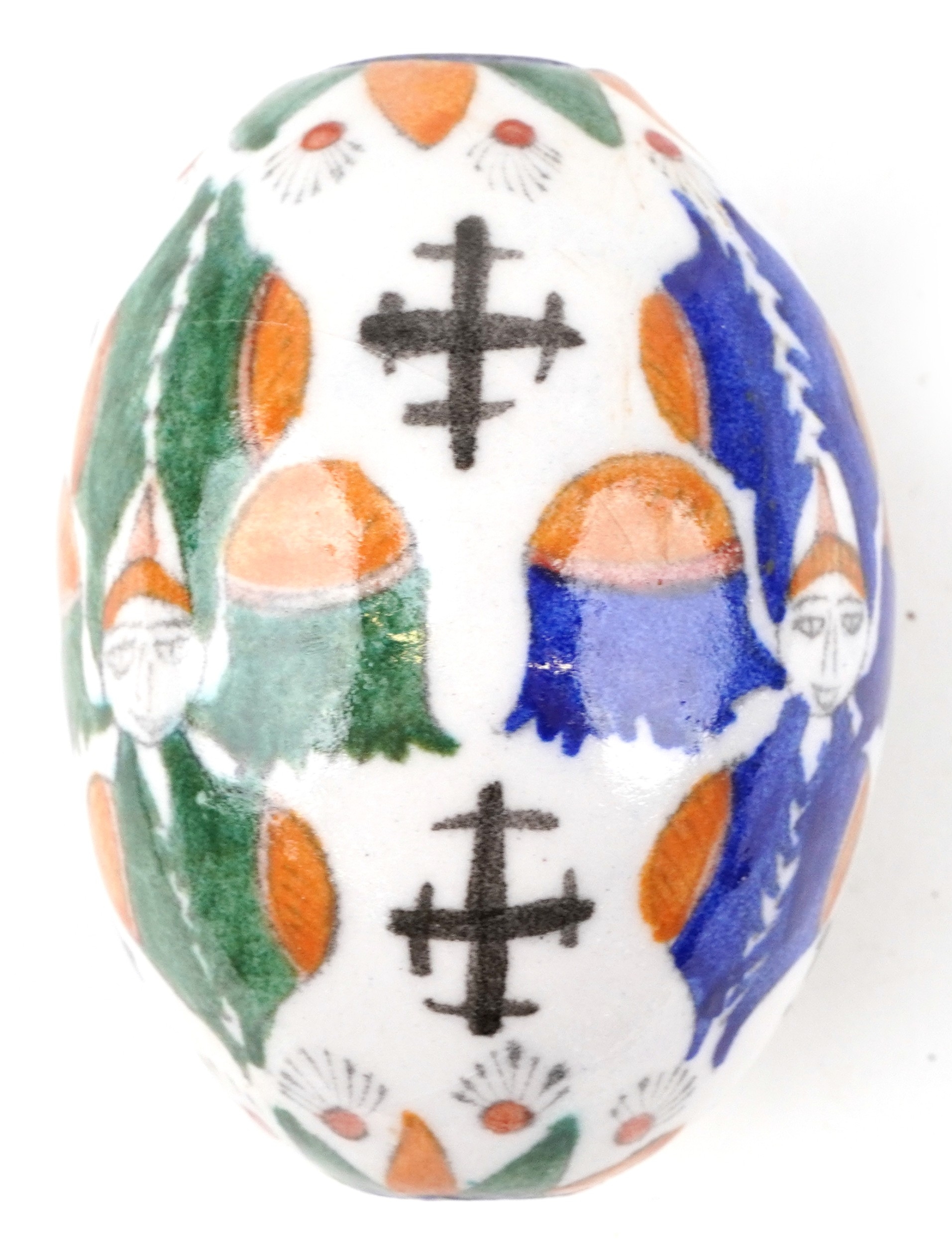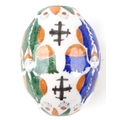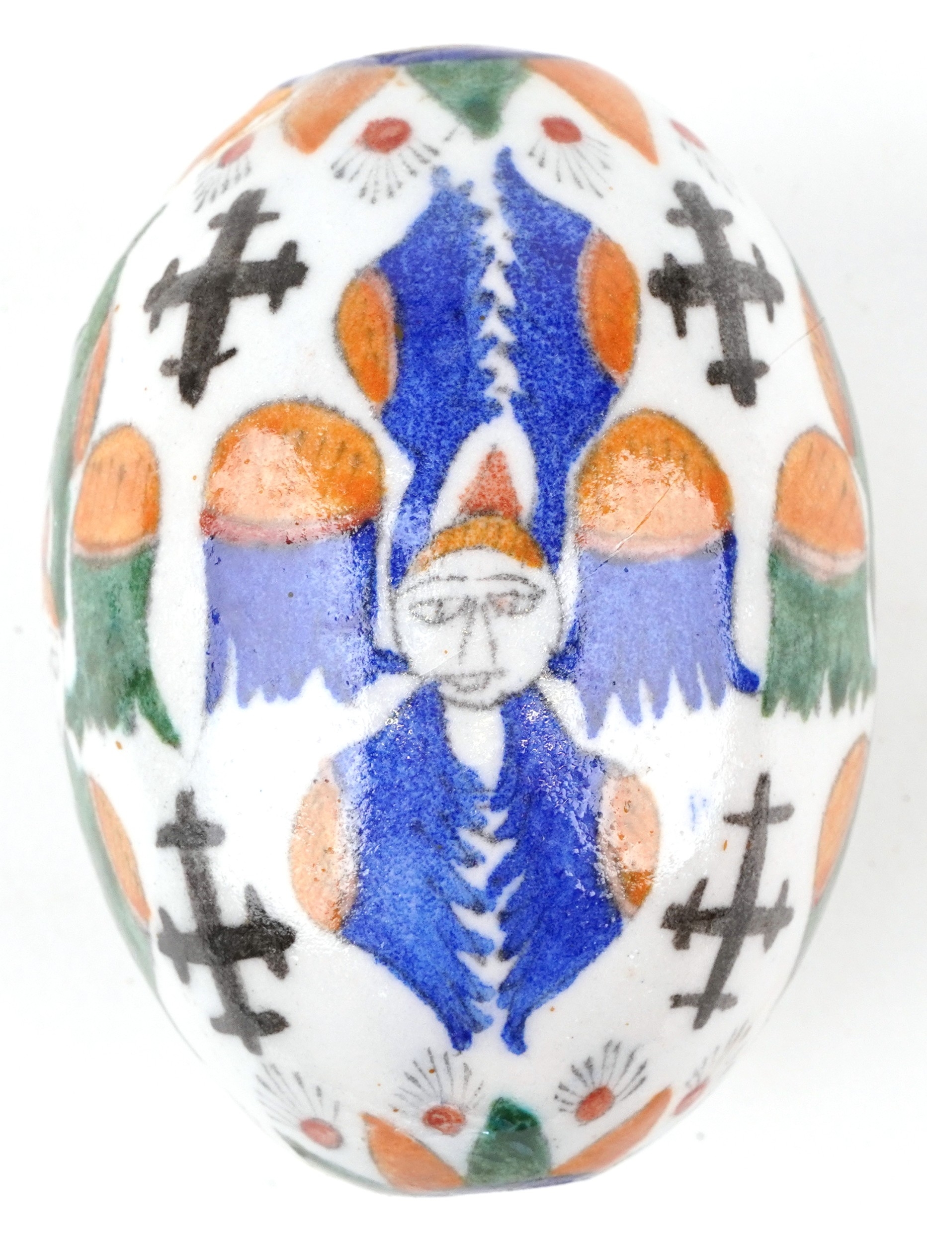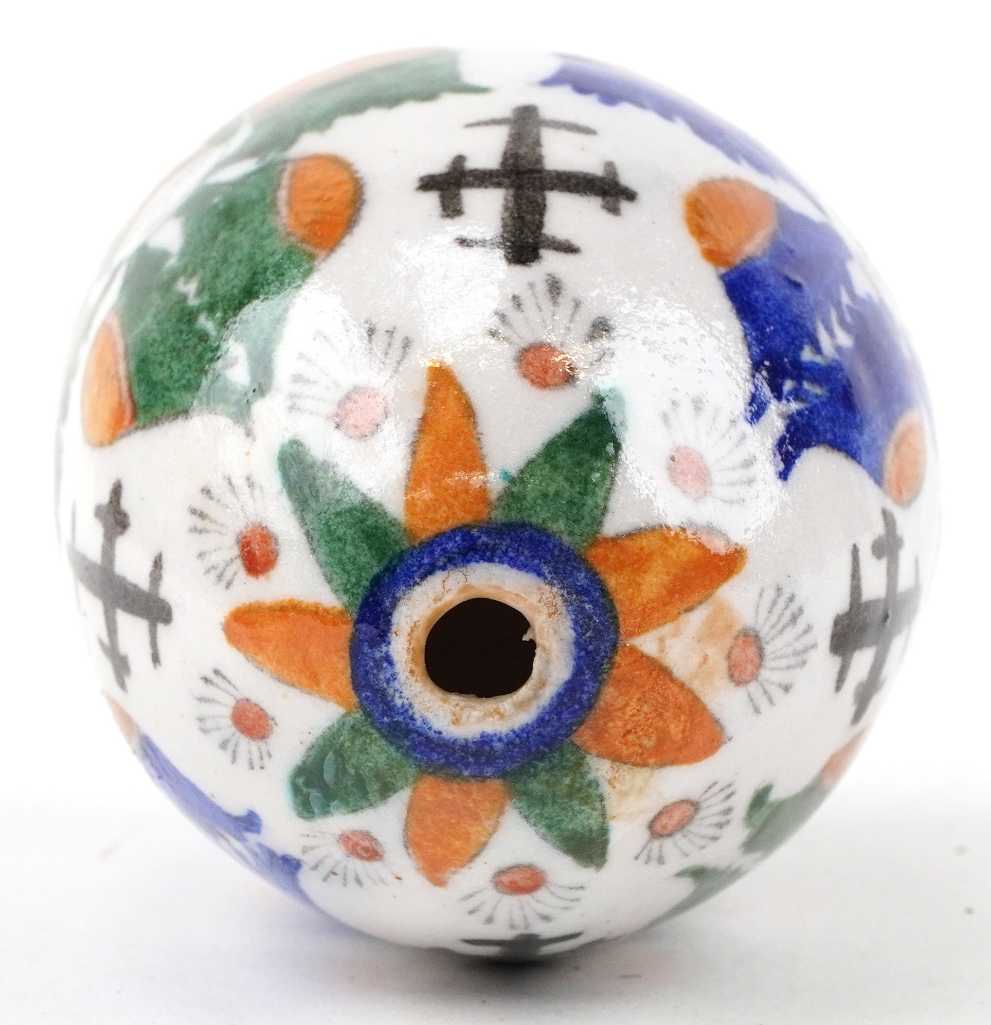 A Turkish Armenian pottery hanging ball hand painted with mythical faces and motifs, 10cm high.