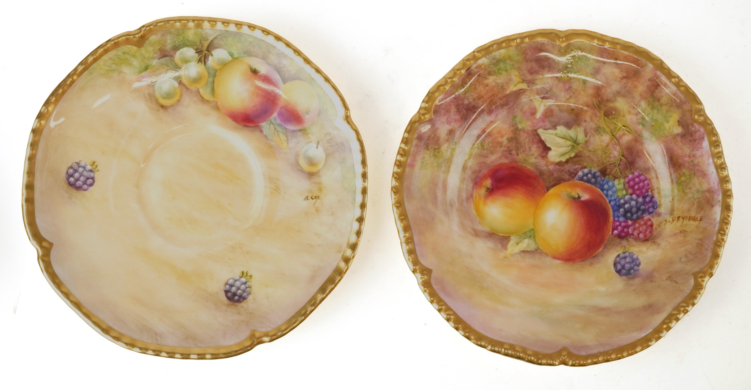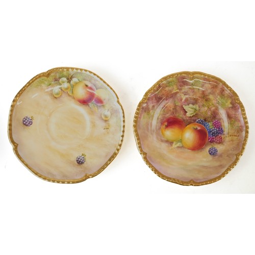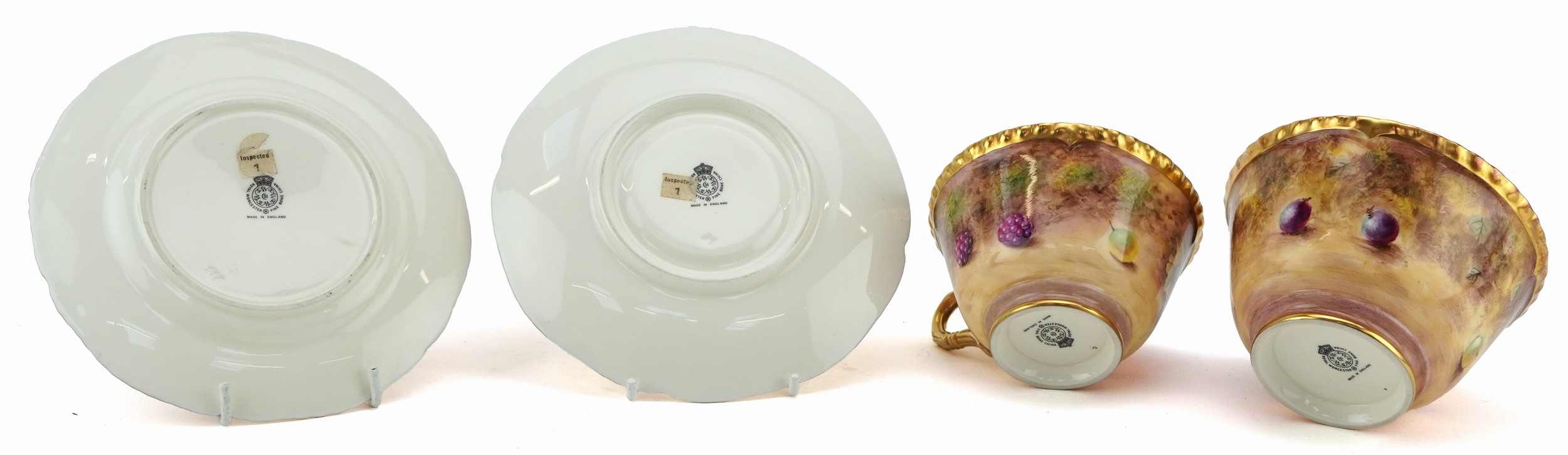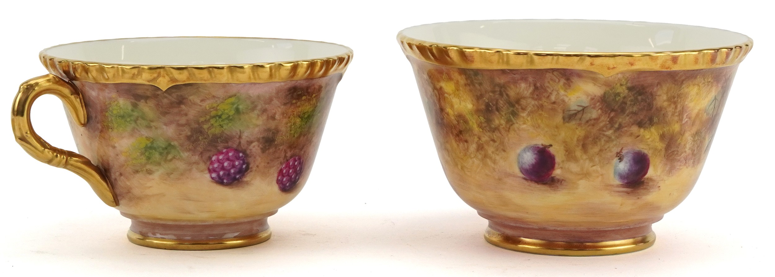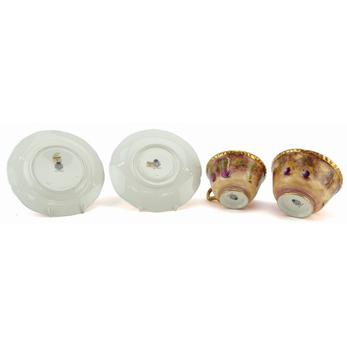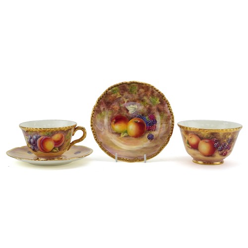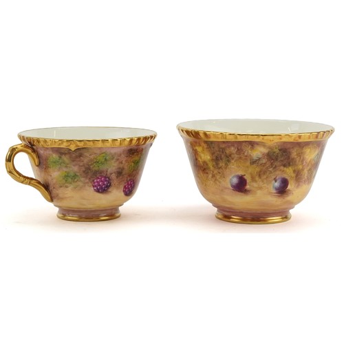 Royal Worcester porcelain comprising a teacup, two saucers and a bowl, each hand painted with fruit by R price, S Drysdale, B Cox and S Weston, the largest 7cm high x 11.5cm in diameter.