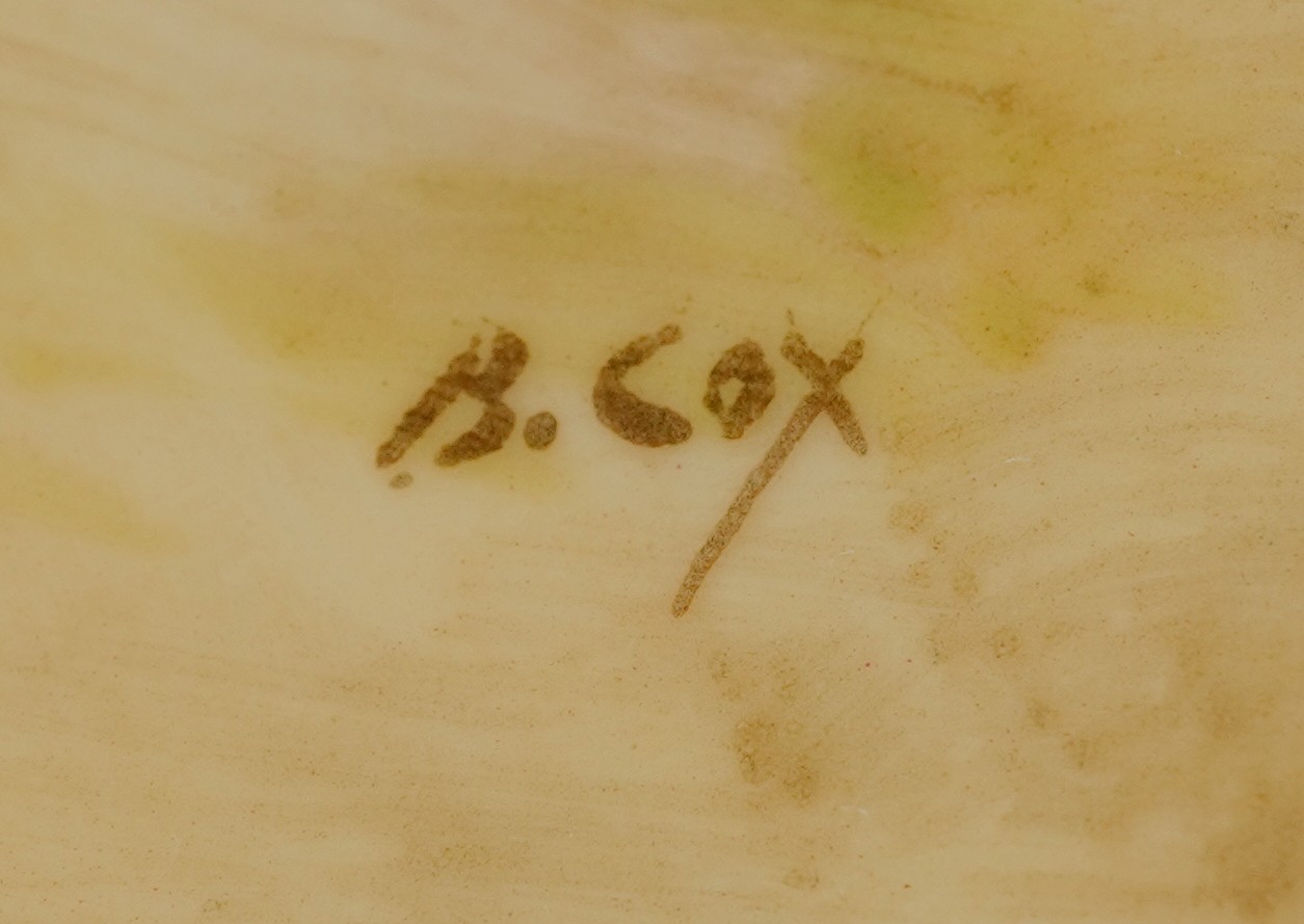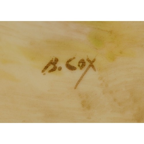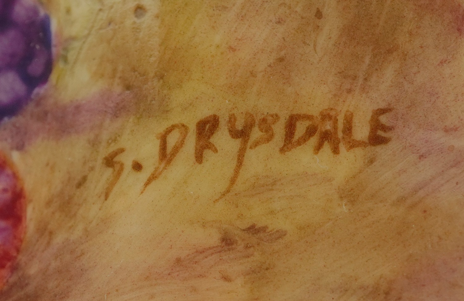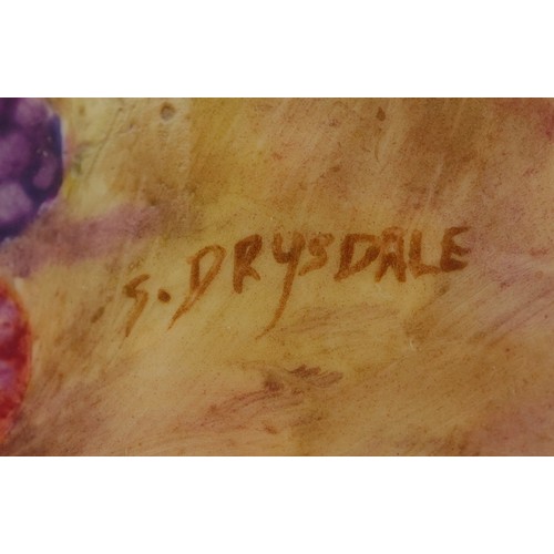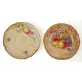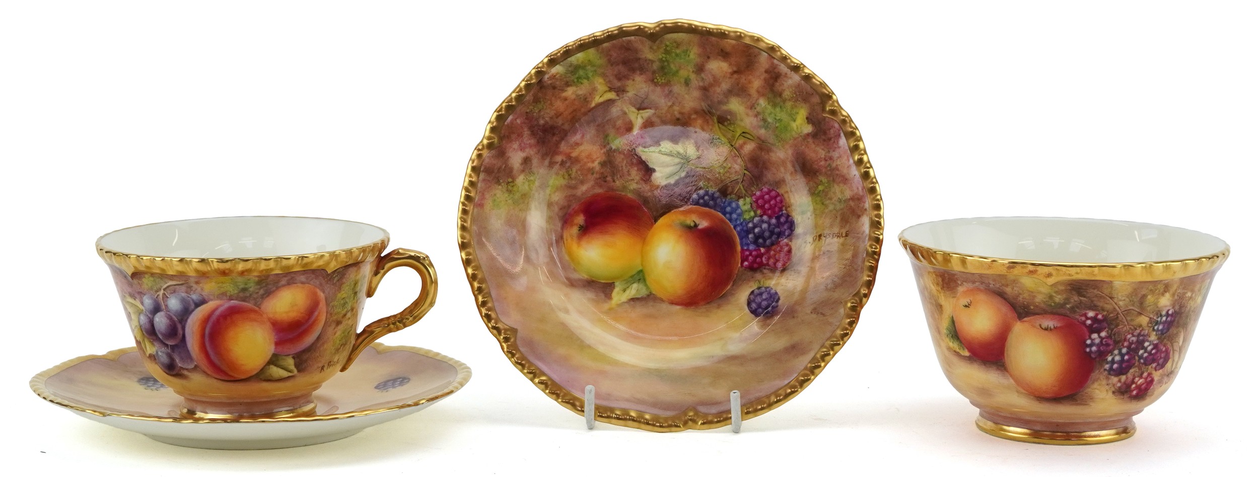 Royal Worcester porcelain comprising a teacup, two saucers and a bowl, each hand painted with fruit by R price, S Drysdale, B Cox and S Weston, the largest 7cm high x 11.5cm in diameter.