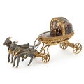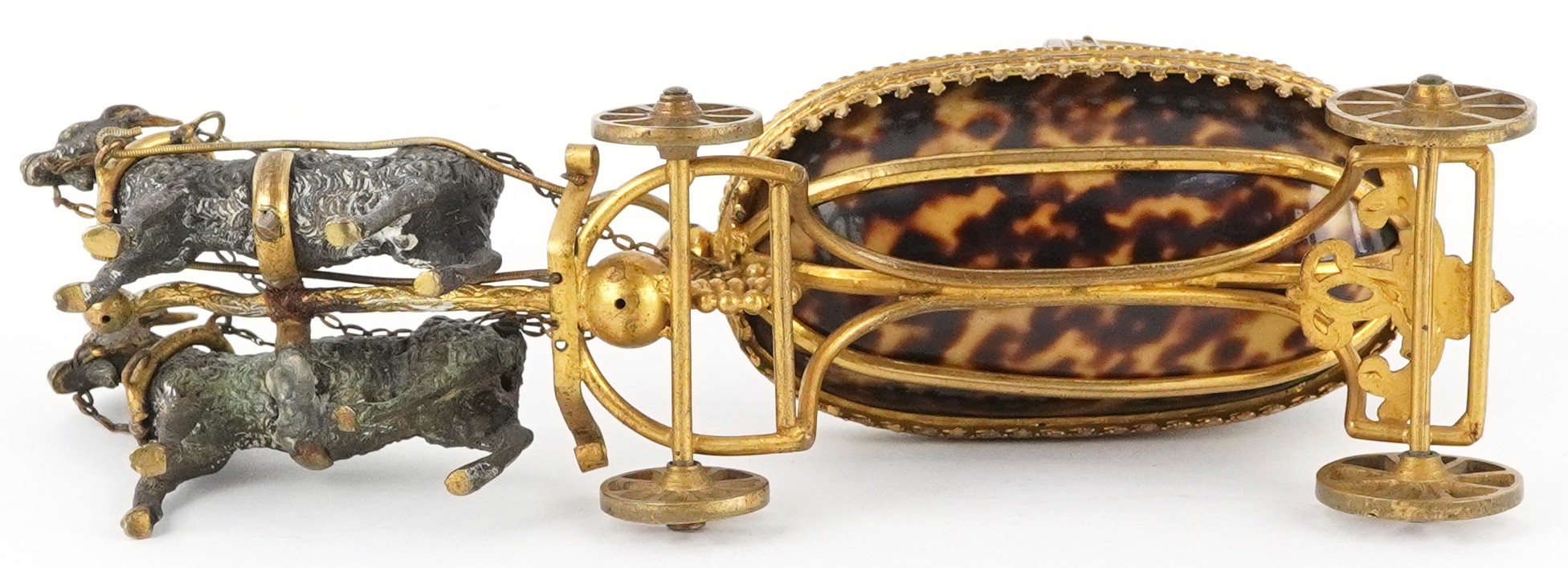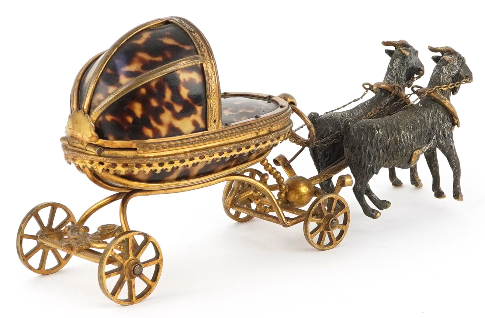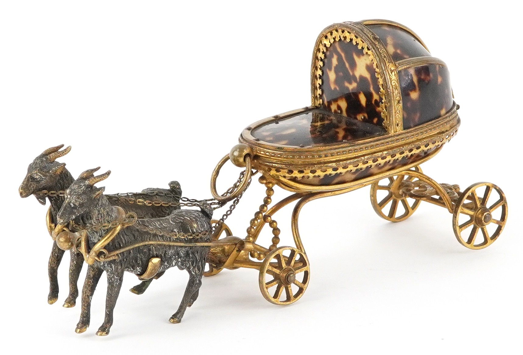 A 19th century French gilt brass and tortoiseshell trinket in the form of two goats pulling a cart, 19cm in length.