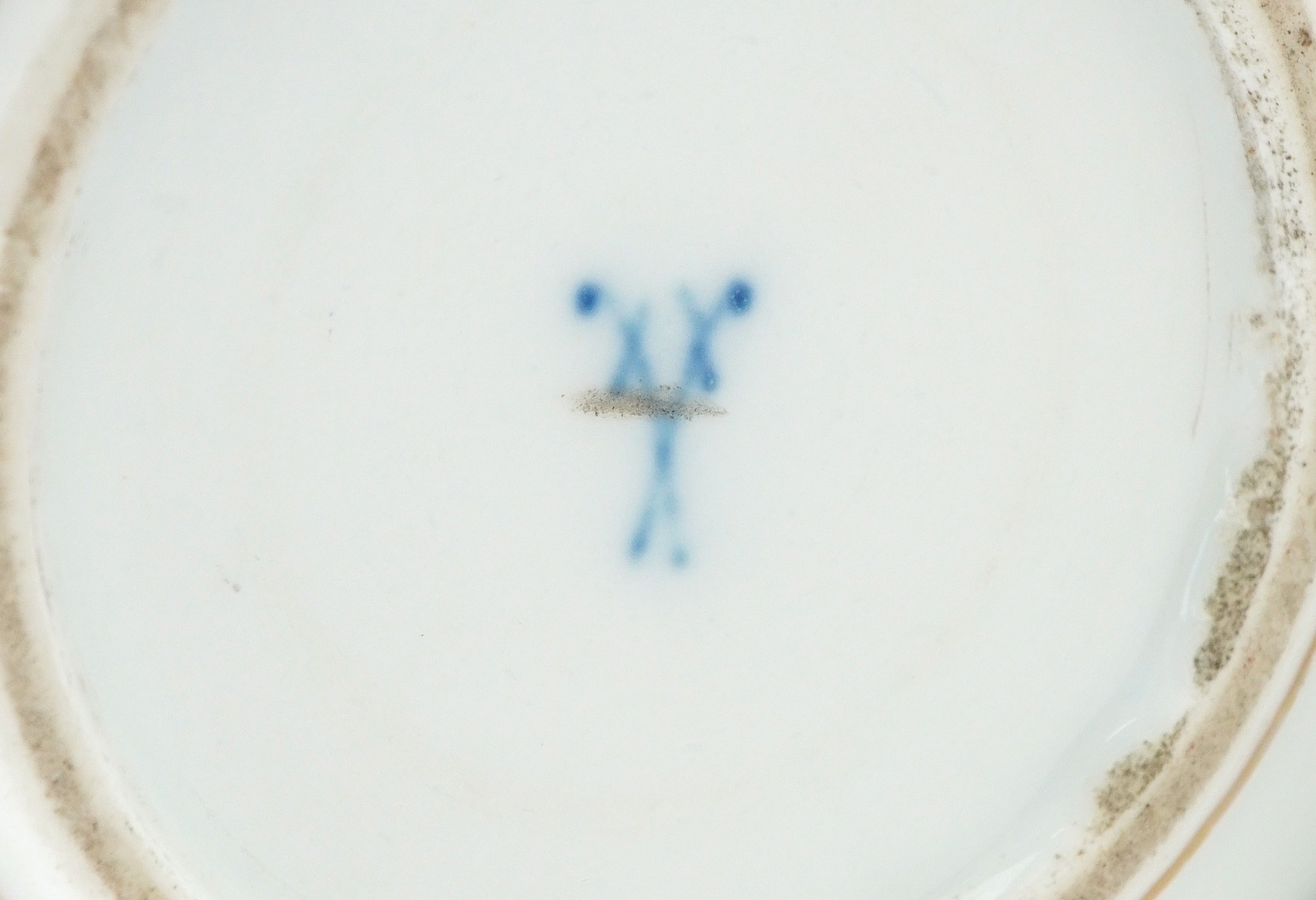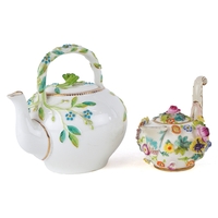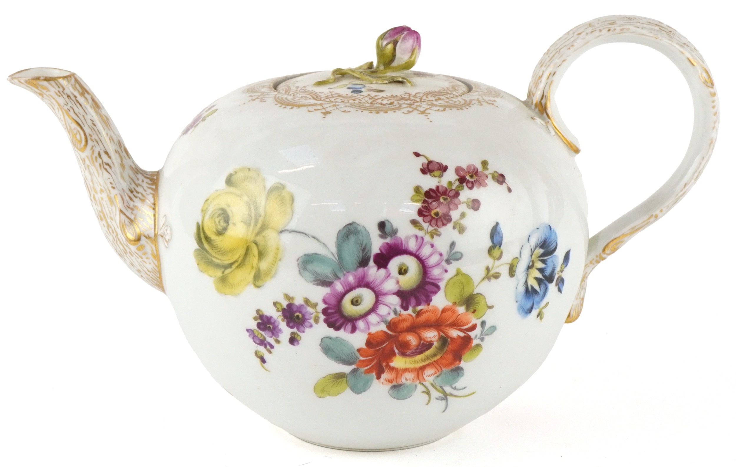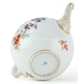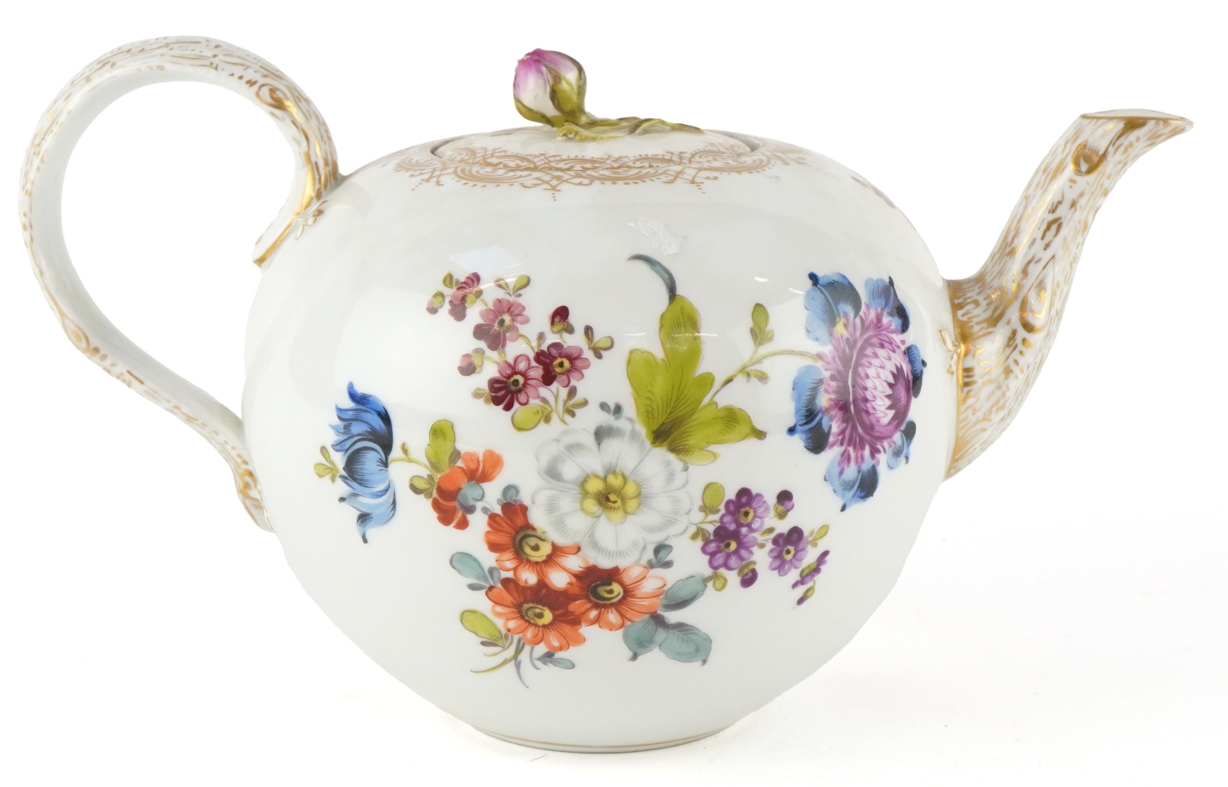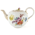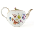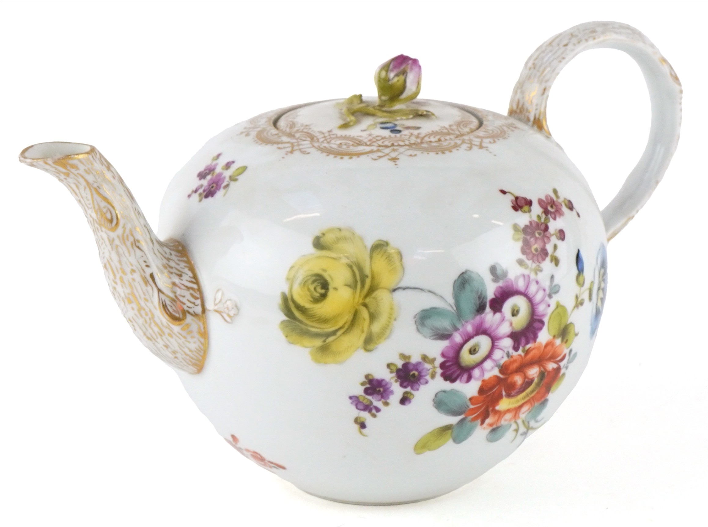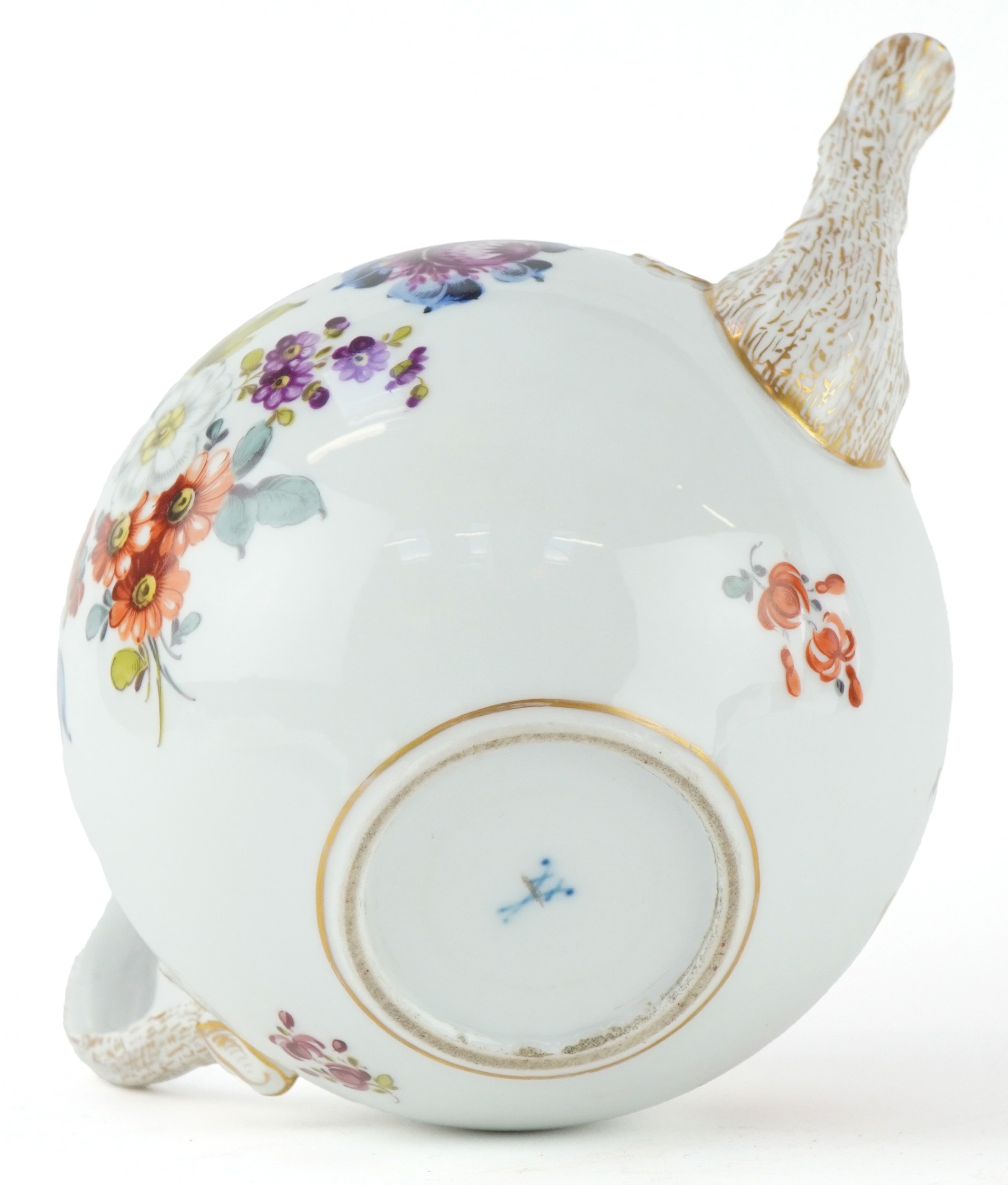 A Meissen 19th century German porcelain teapot hand painted with flowers and a bark design spout and handle, blue crossed sword marks to the base, 14cm high x 24cm wide.