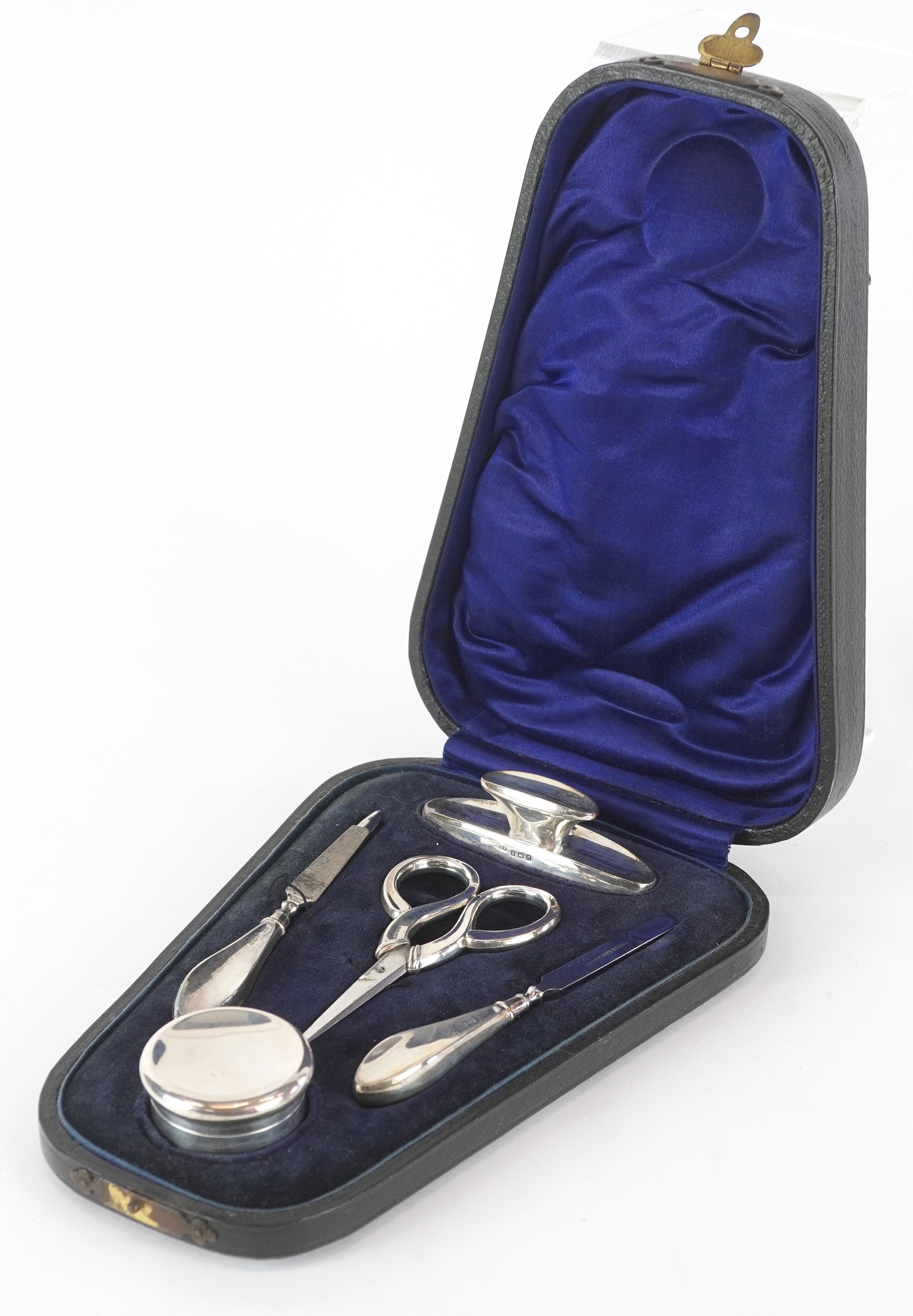 Crisford & Norris, a Victorian and silver manicure set, various Birmingham date marks, housed in a fitted case, overall 20cm wide.