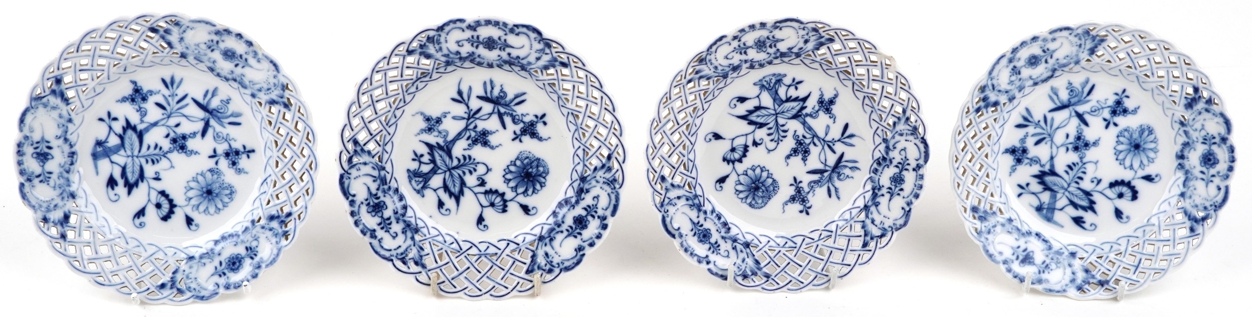 A set of four Meissen Blue Onion pattern pierced side plates, each bearing blue under glazed crossed sword marks to the the reverse, 15cm in diameter.