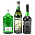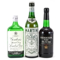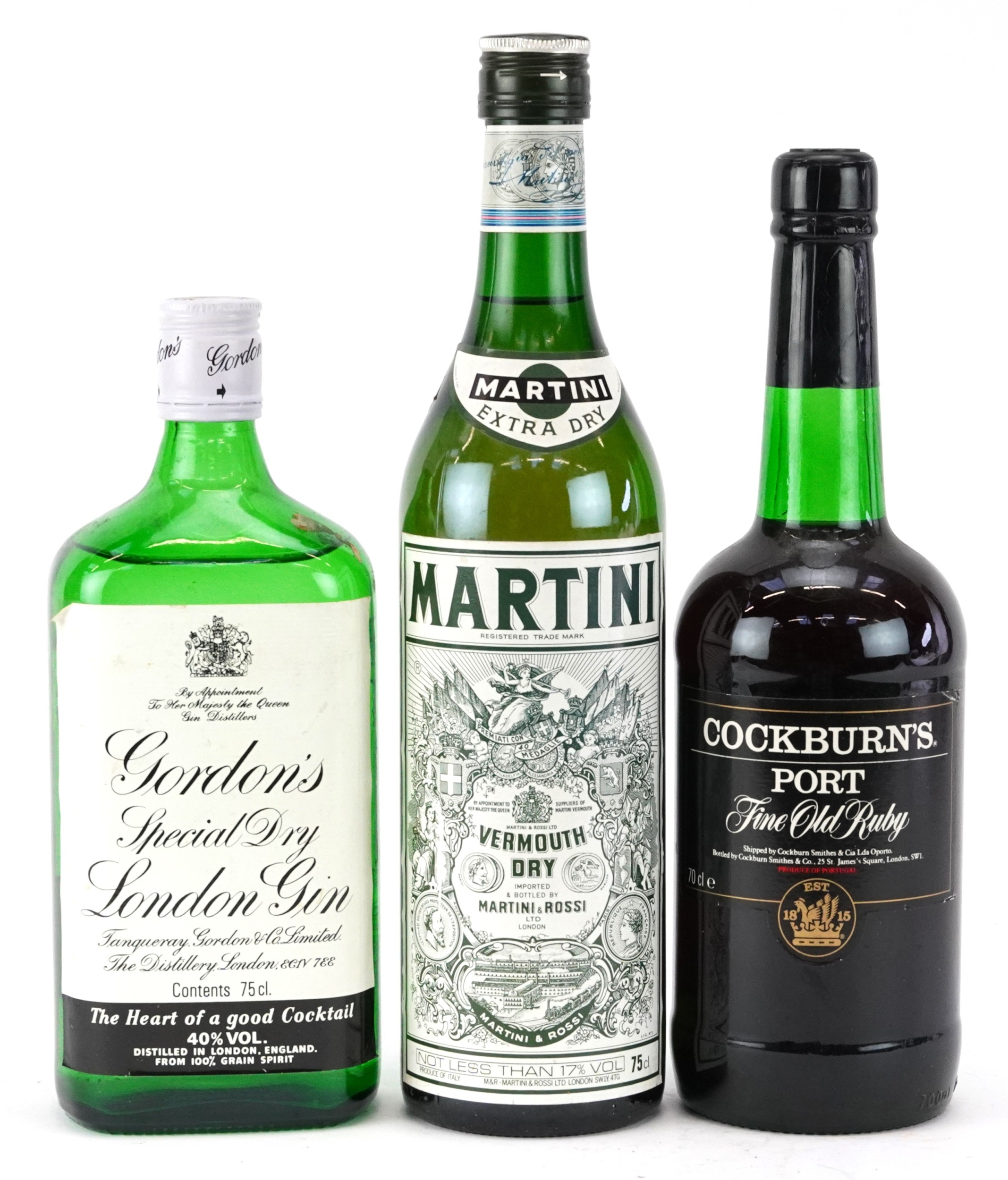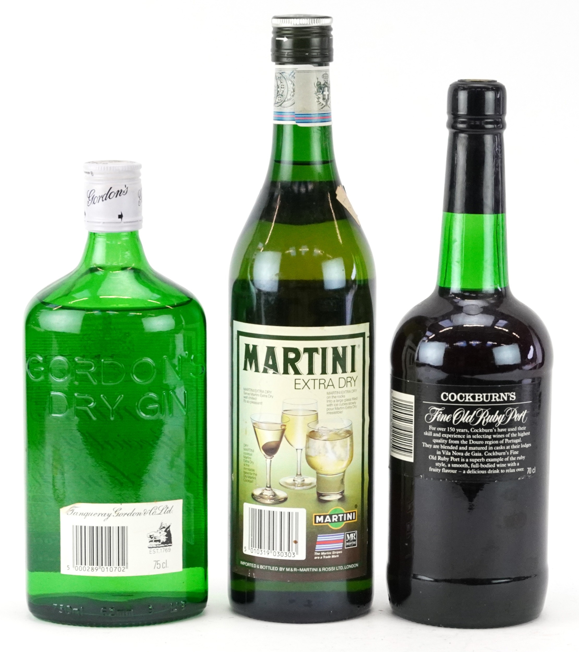 Three bottles of alcohol comprising Cockburn's Fine Old Ruby port, Gordon's Special Dry London gin and Extra Dry Martini.