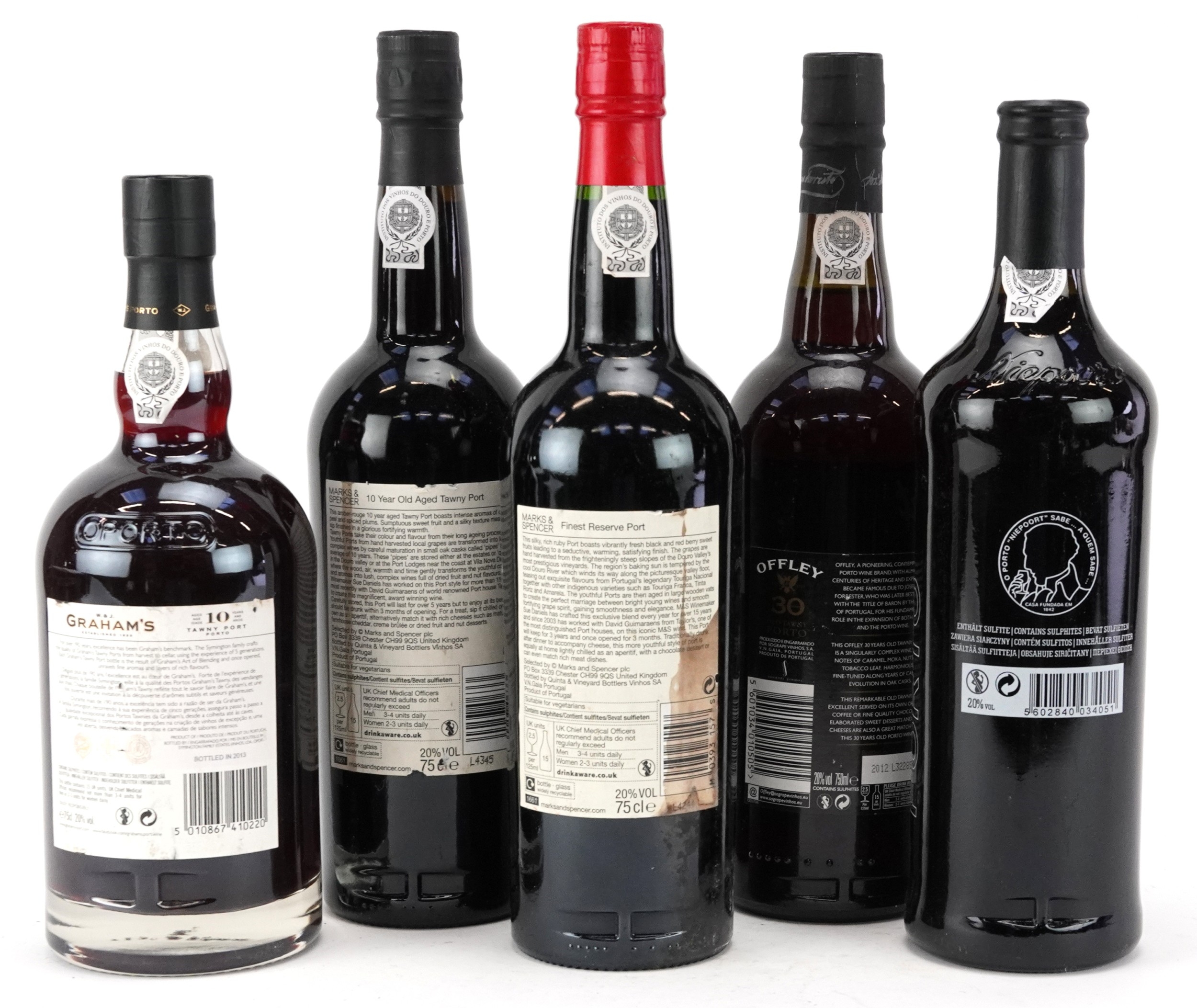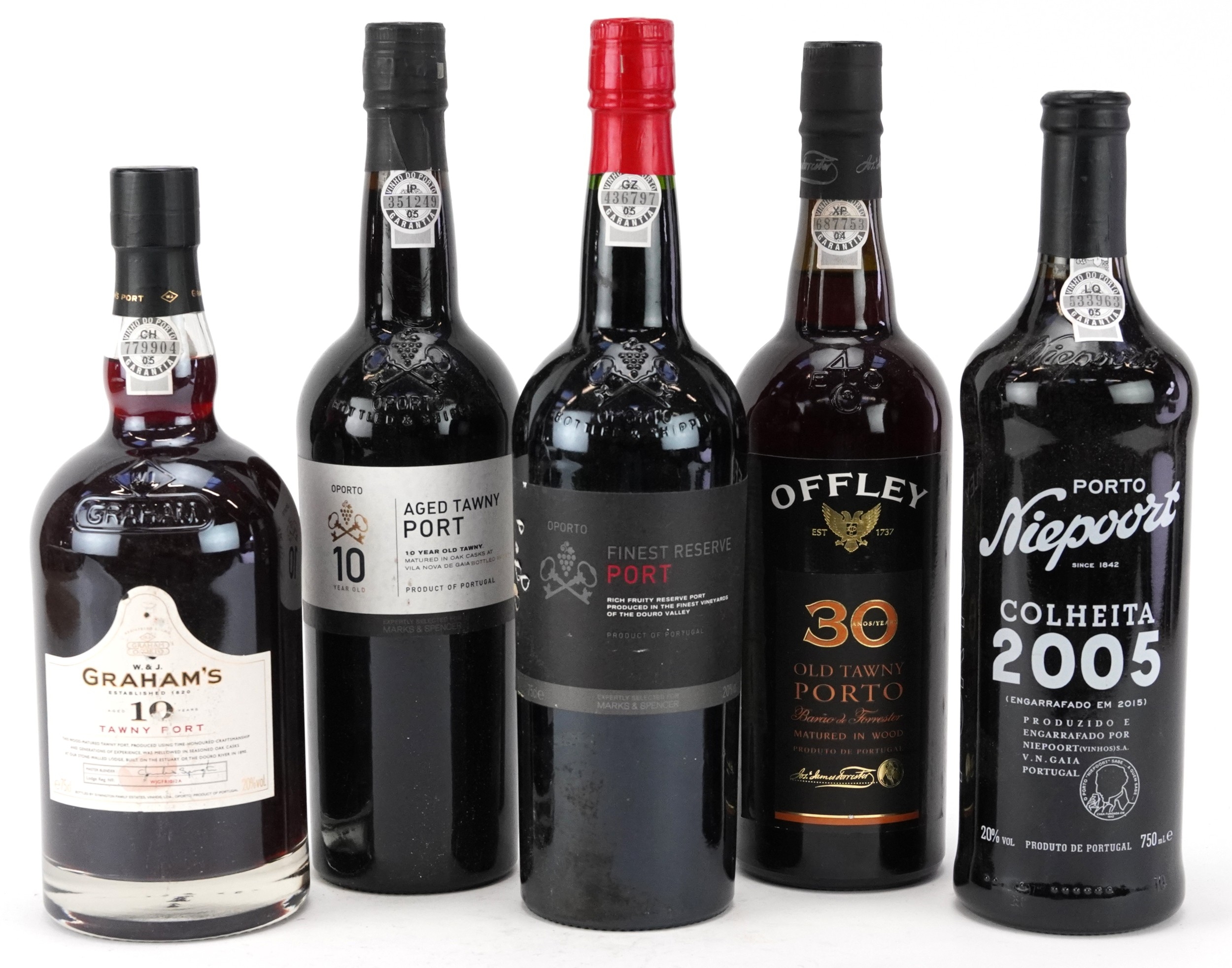 Five bottles of port including 2005 Colheita, Offley 30 Year Old Tawny port and Graham's 10 Year Tawny port.