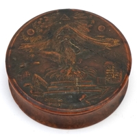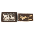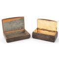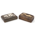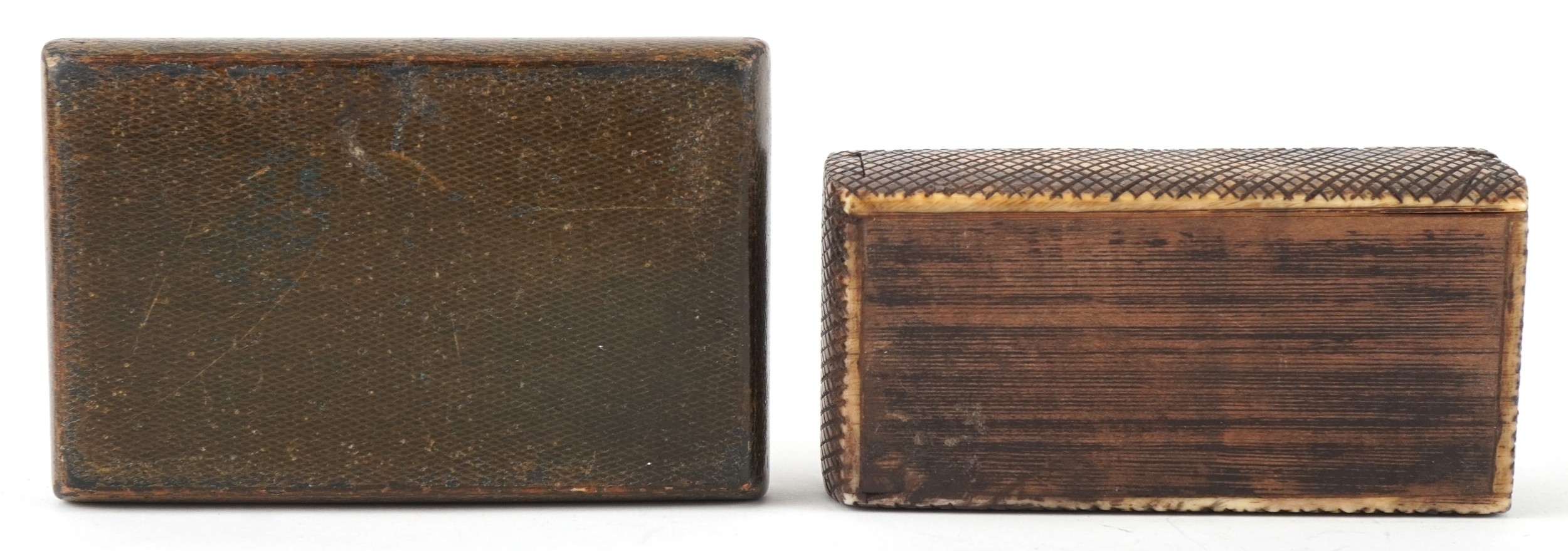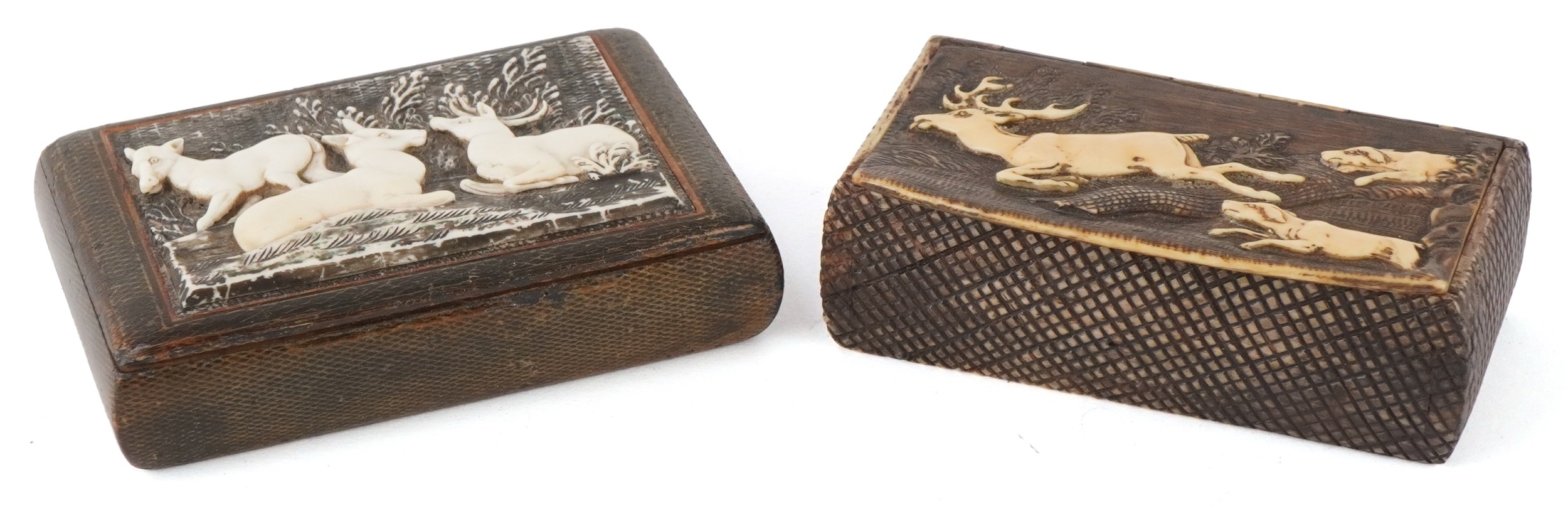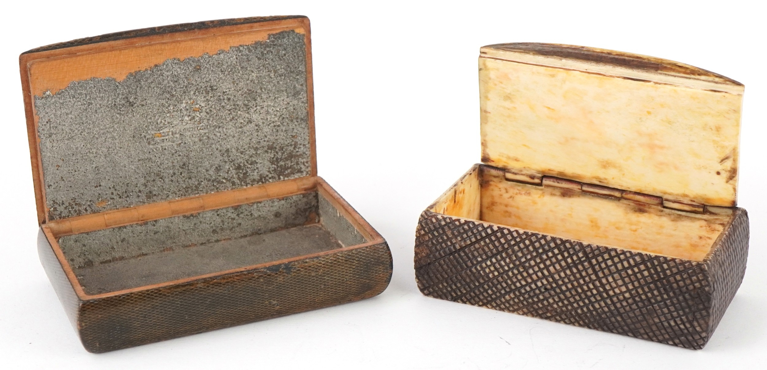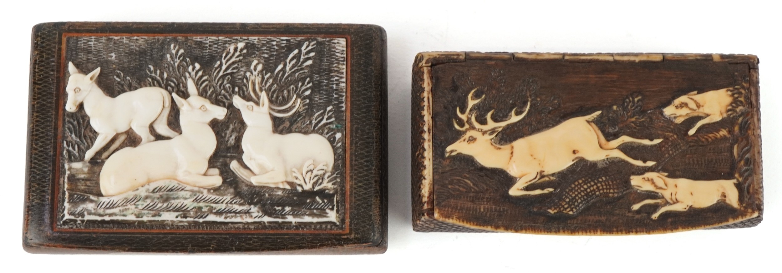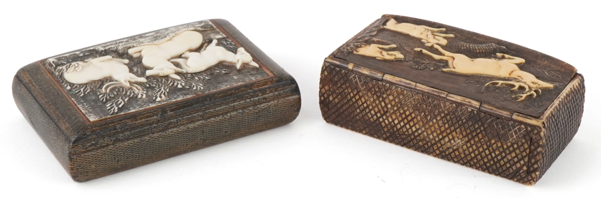 Two 19th century snuff boxes including a carved staghorn example, the largest 8.5cm wide.
