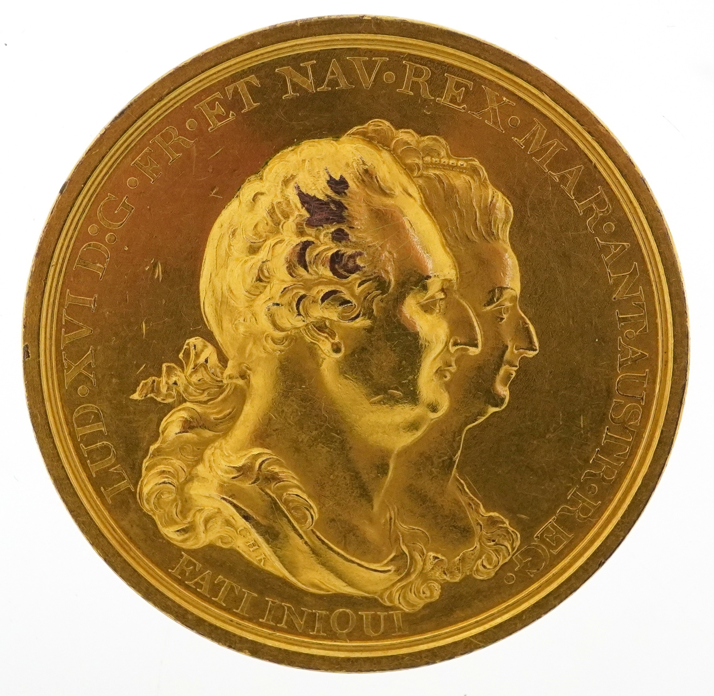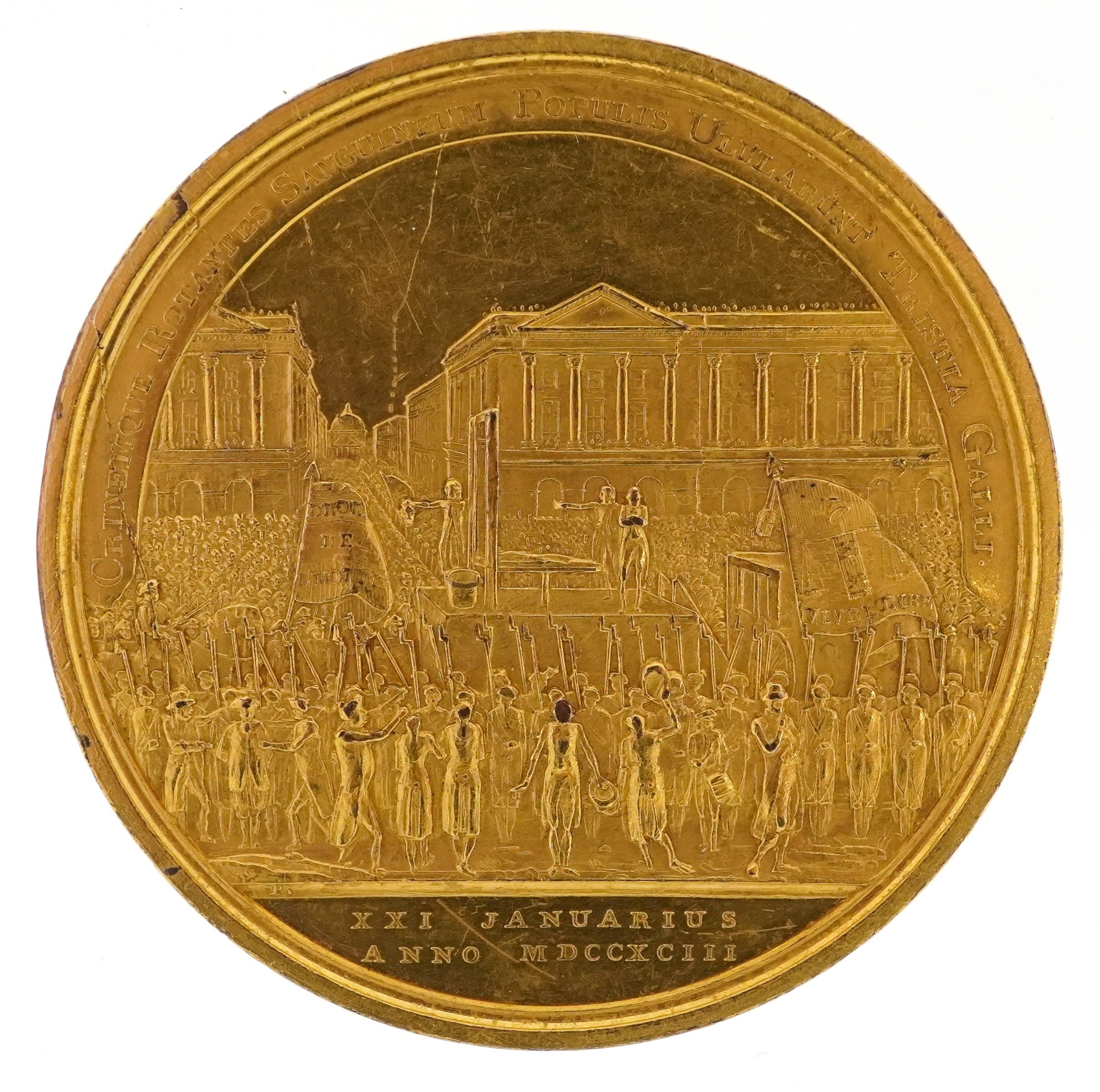 A large gilt bronze medal commemorating the Execution of King Louis XVI during the French Revolution. The Obverse has a bust of King Louis XVI and Marie Antoinette facing right. The Reverse having the public execution by guillotine on Jan 21st 1795. 51.0mm diameter, 67.57g.