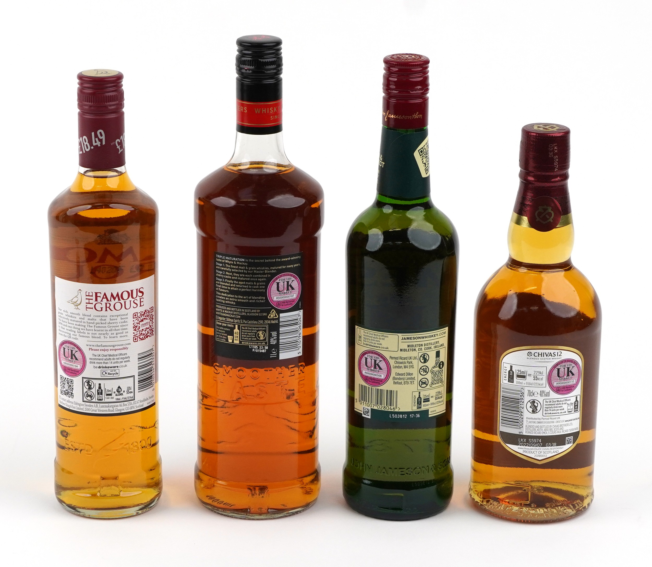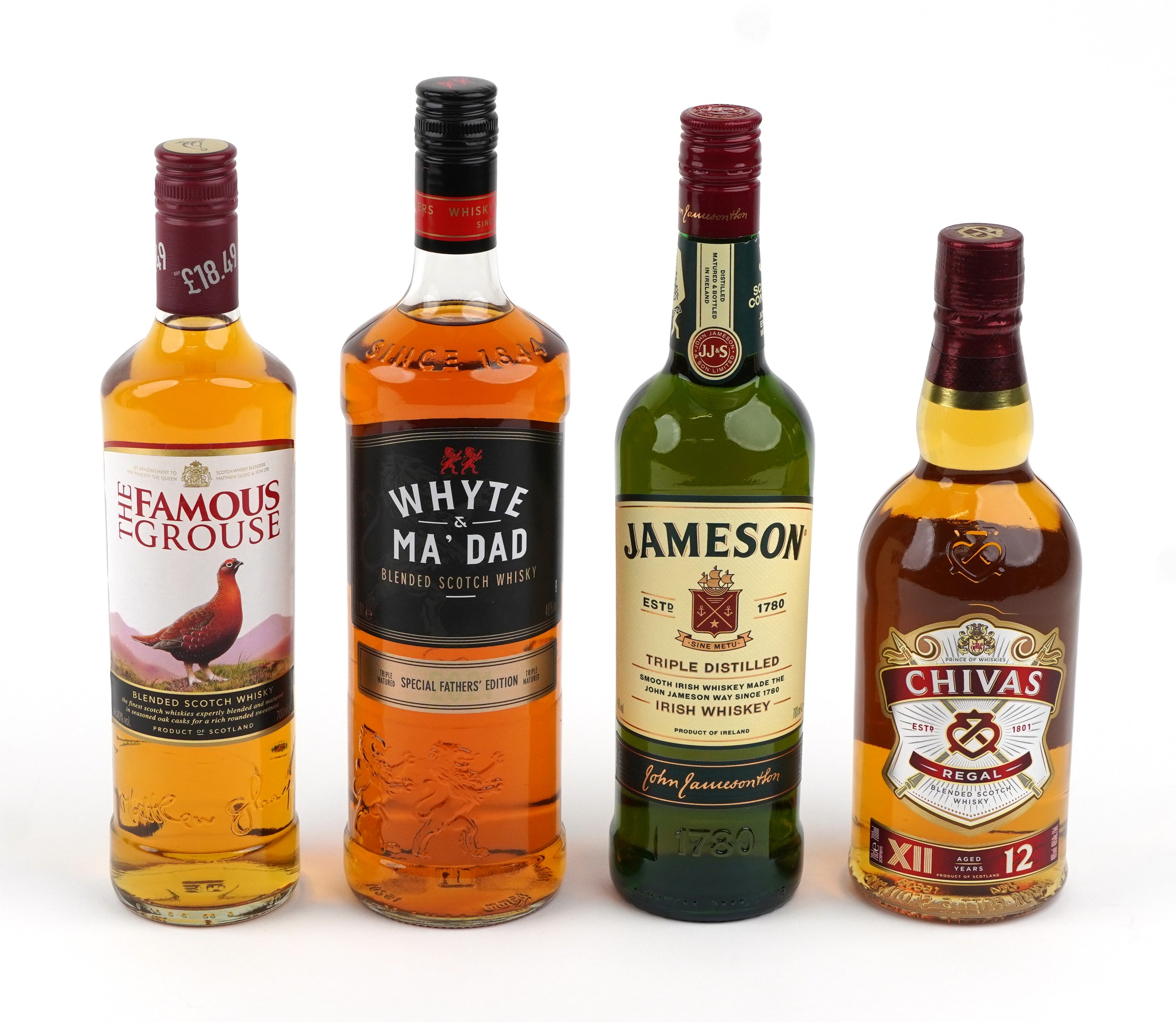 Four bottles of whisky comprising 2021 Whyte & MacKay Special Father's Day Edition, 12 Year Chivas Regal, Jameson Triple Distilled Irish whisky and Famous Grouse Blended Scotch whisky.