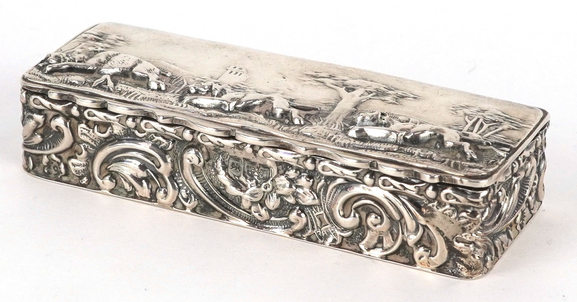An Edwardian silver hunting interest box, the hinged lid emb...