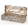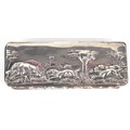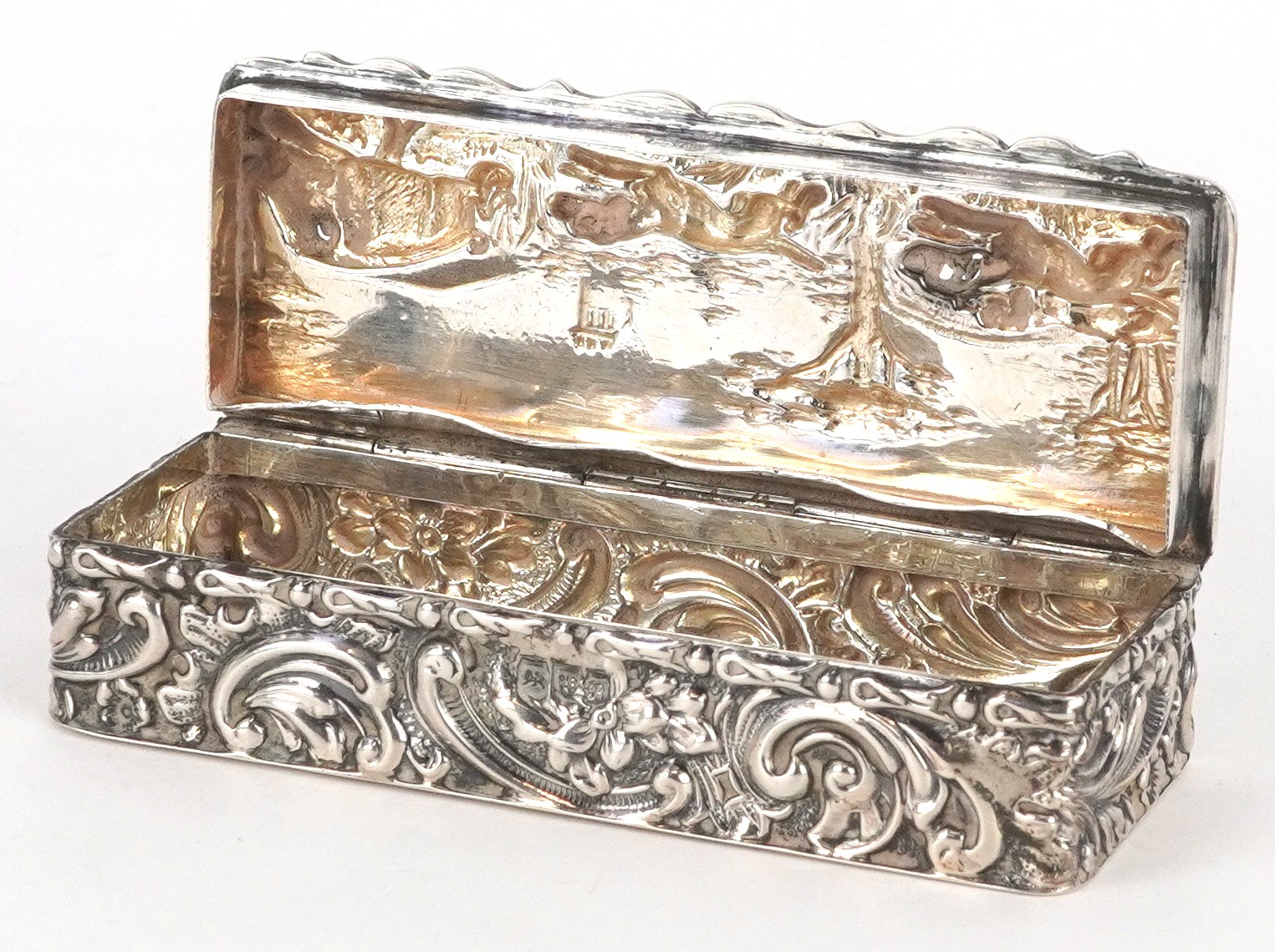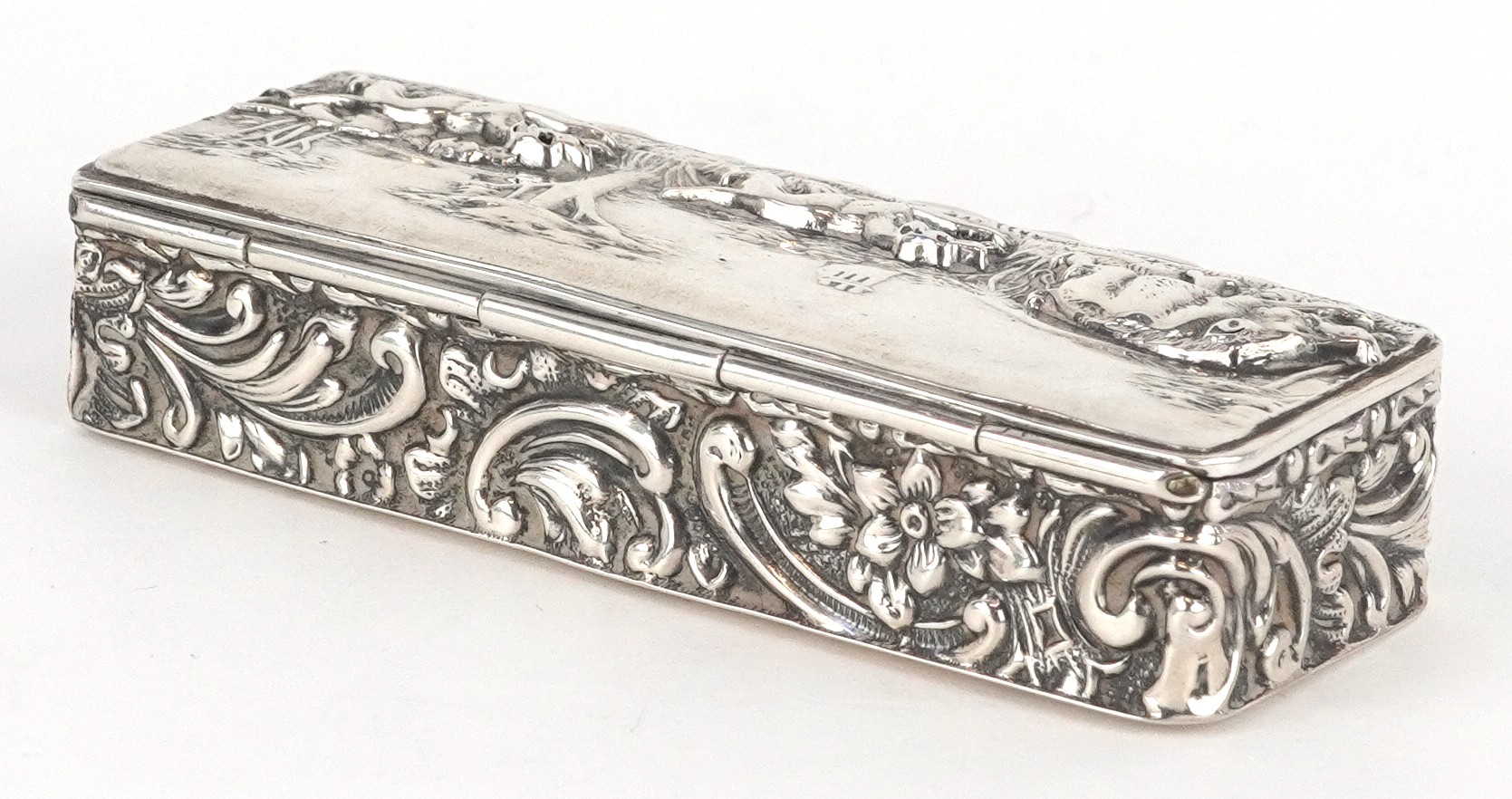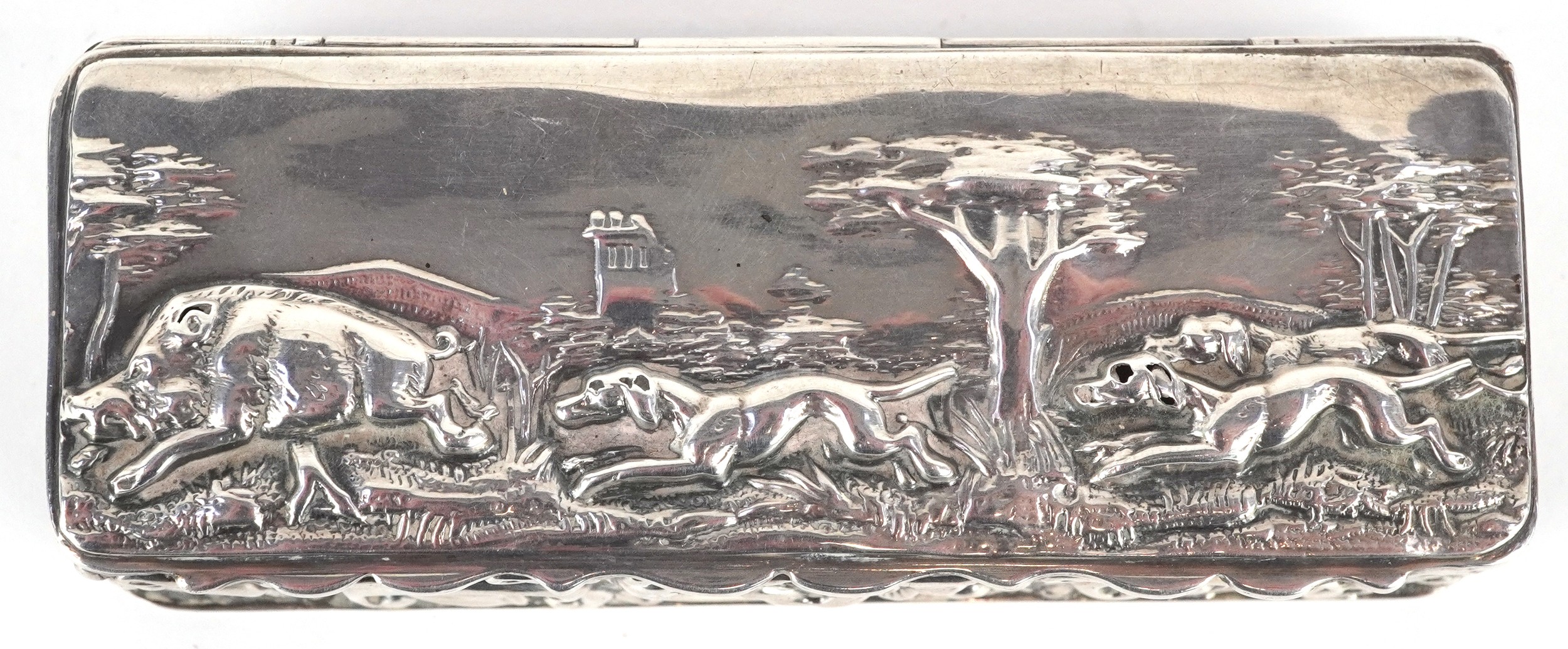 An Edwardian silver hunting interest box, the hinged lid embossed with a hunting scene, Chester 1902, 8.8cm wide, 50.9g.