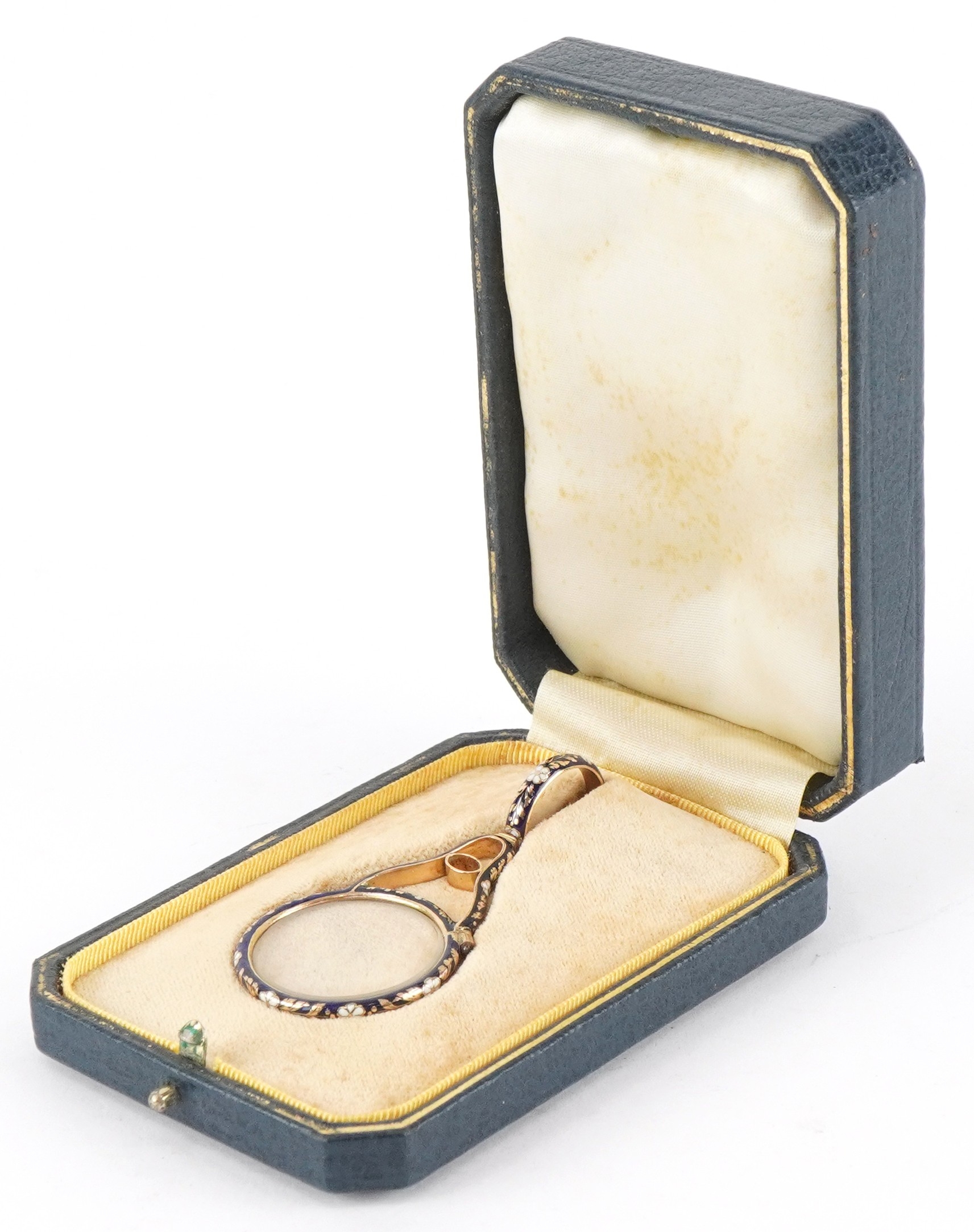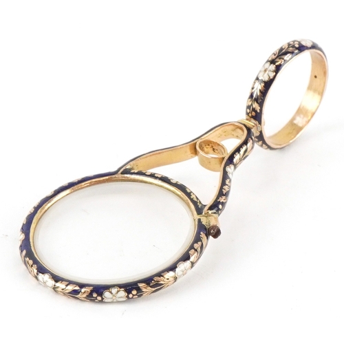 An unmarked gold and enamel quizzing/magnifying glass finely hand painted with flowers, 7cm in length, 11.7g, housed in a velvet and silk lined fitted case.