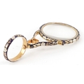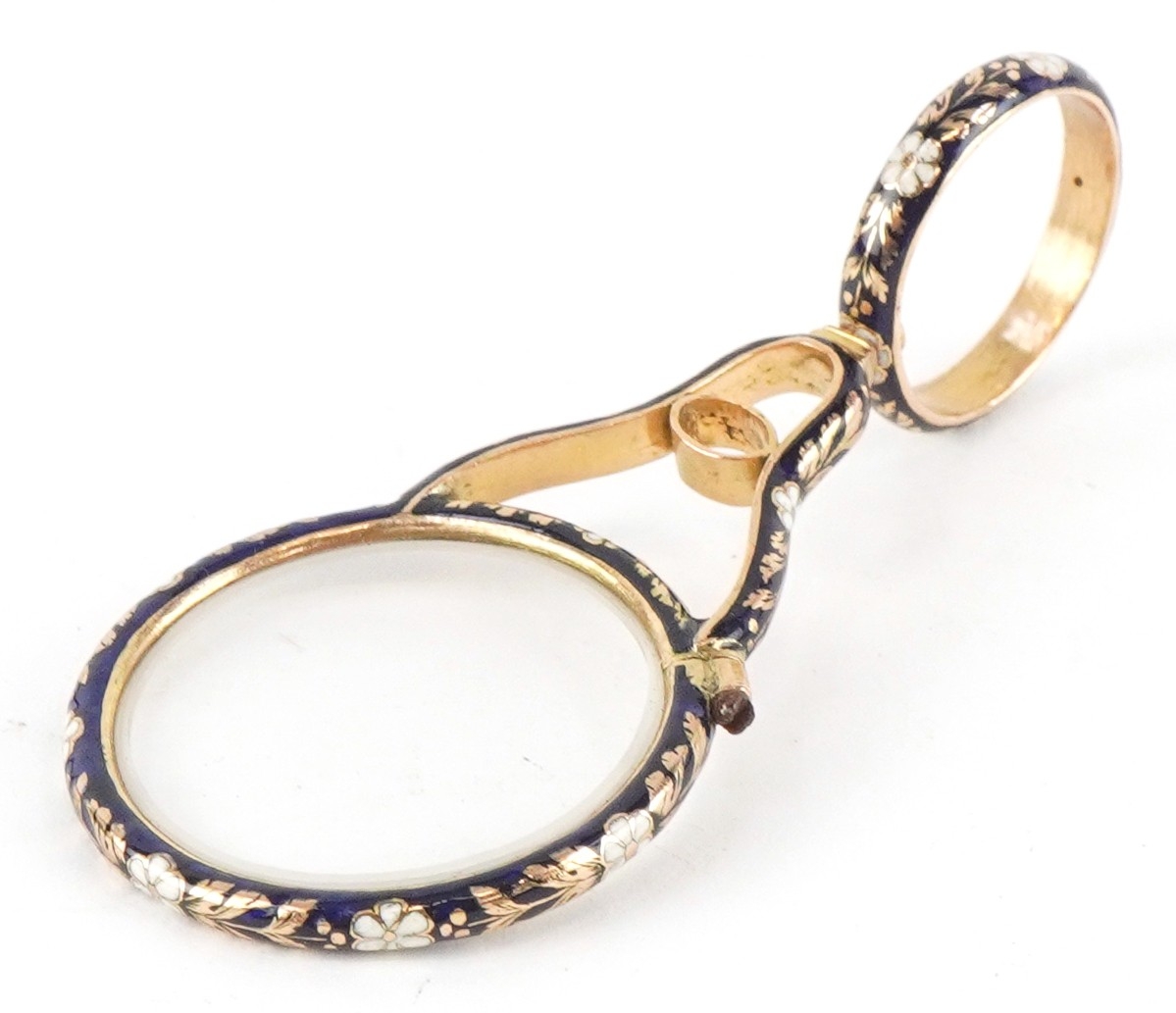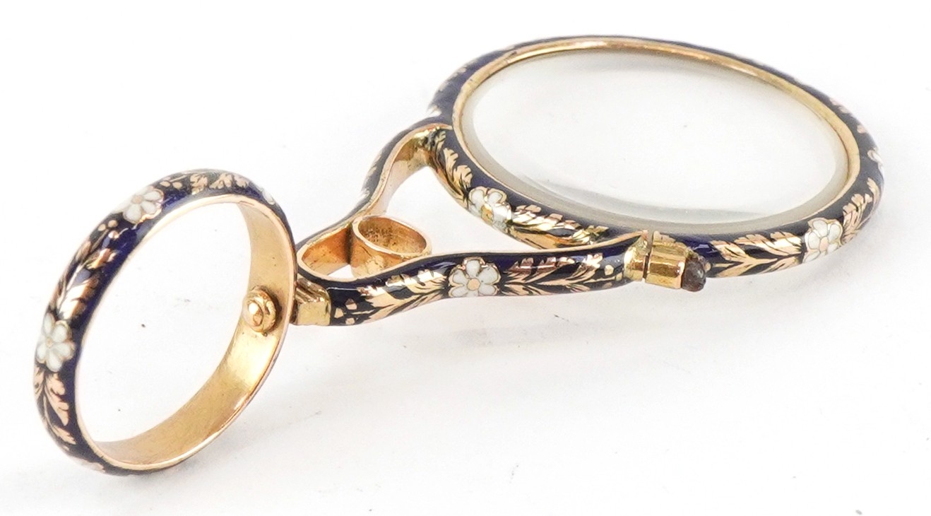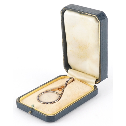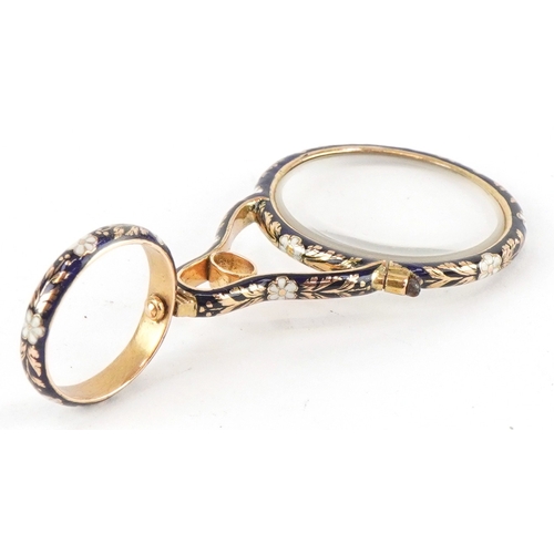An unmarked gold and enamel quizzing/magnifying glass finely...