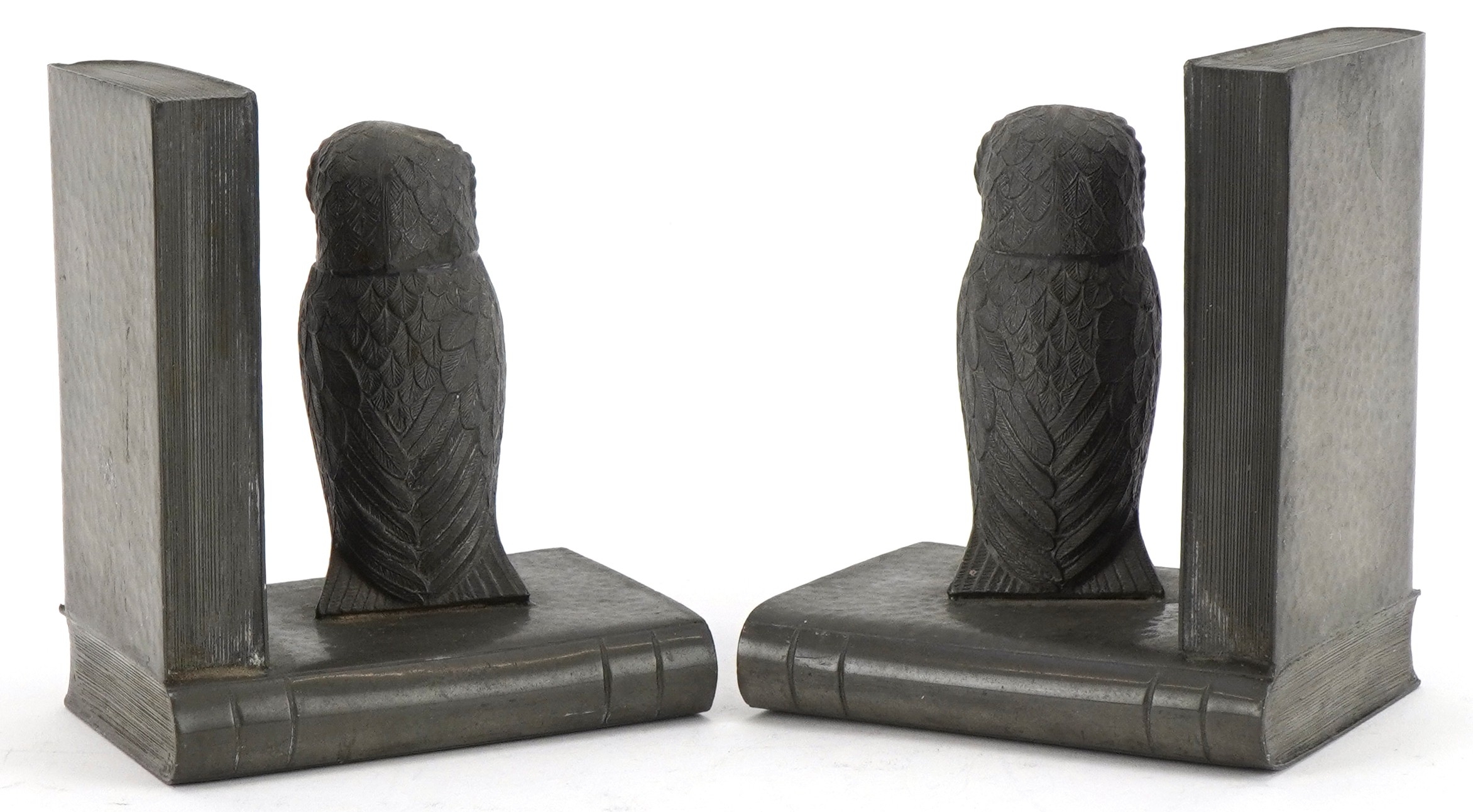 A pair of My Lady planished pewter owl design bookends, 13cm high.