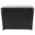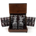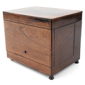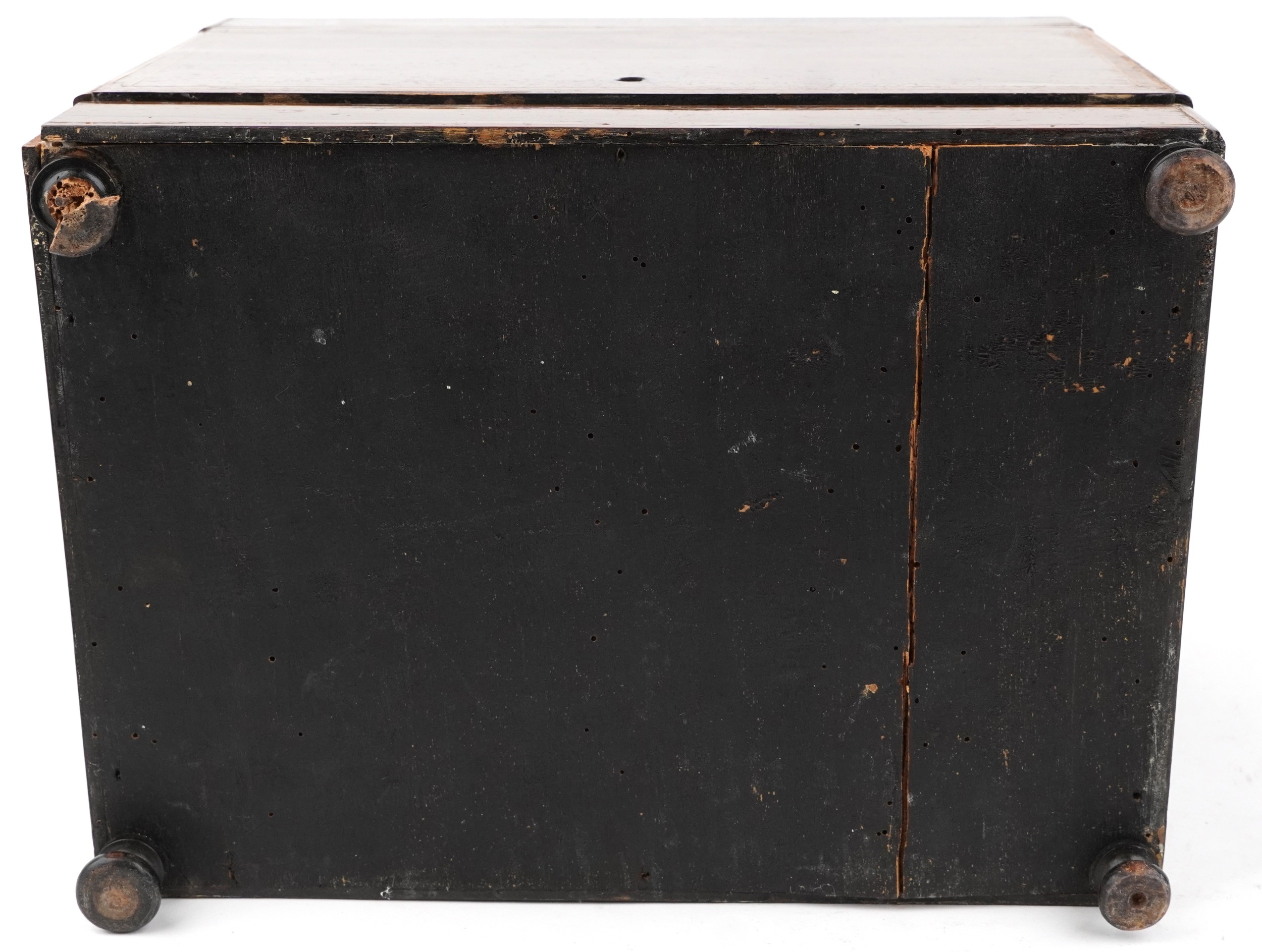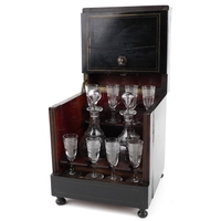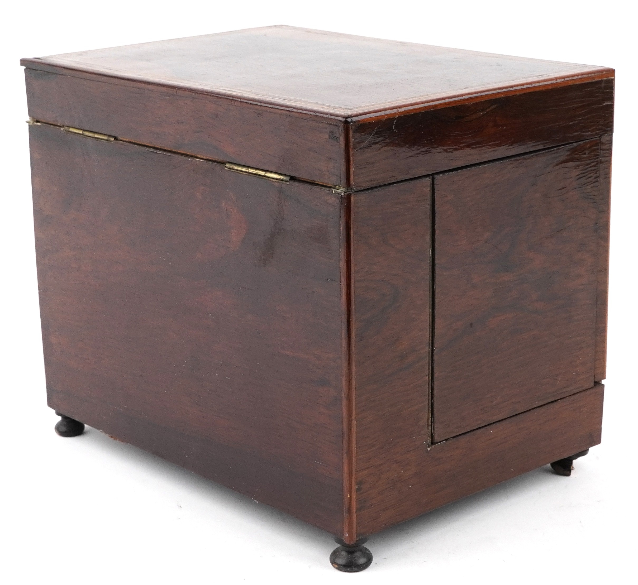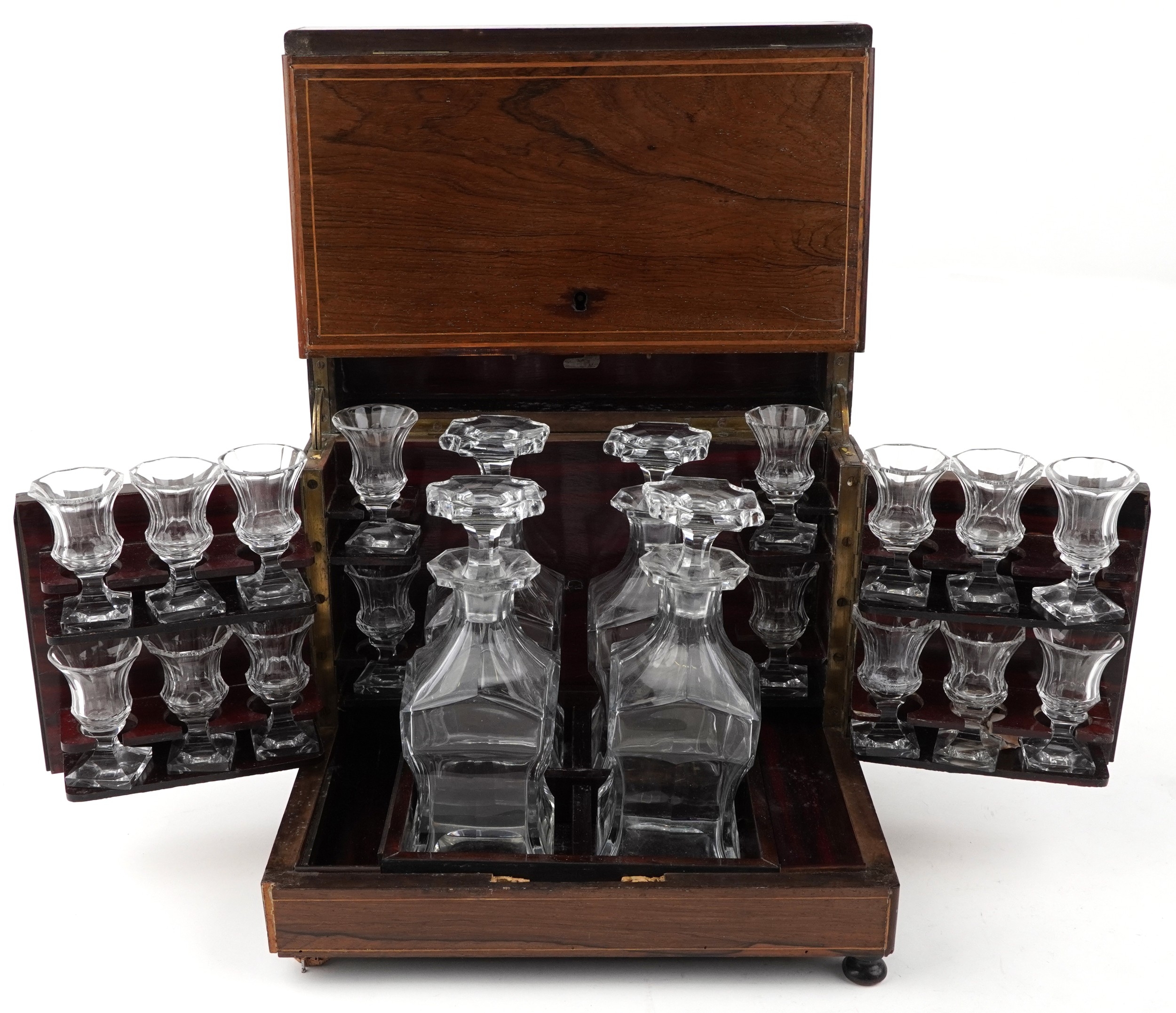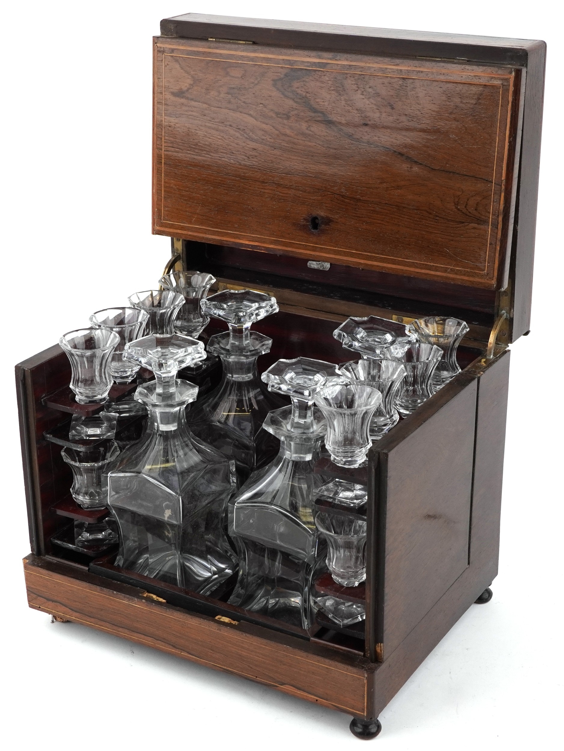 An early 19th century rosewood and boxwood line inlaid table top decanter box, the hinged lid housing four decanters and sixteen liqueur glasses, 25cm H x 30cm W x 22cm D.