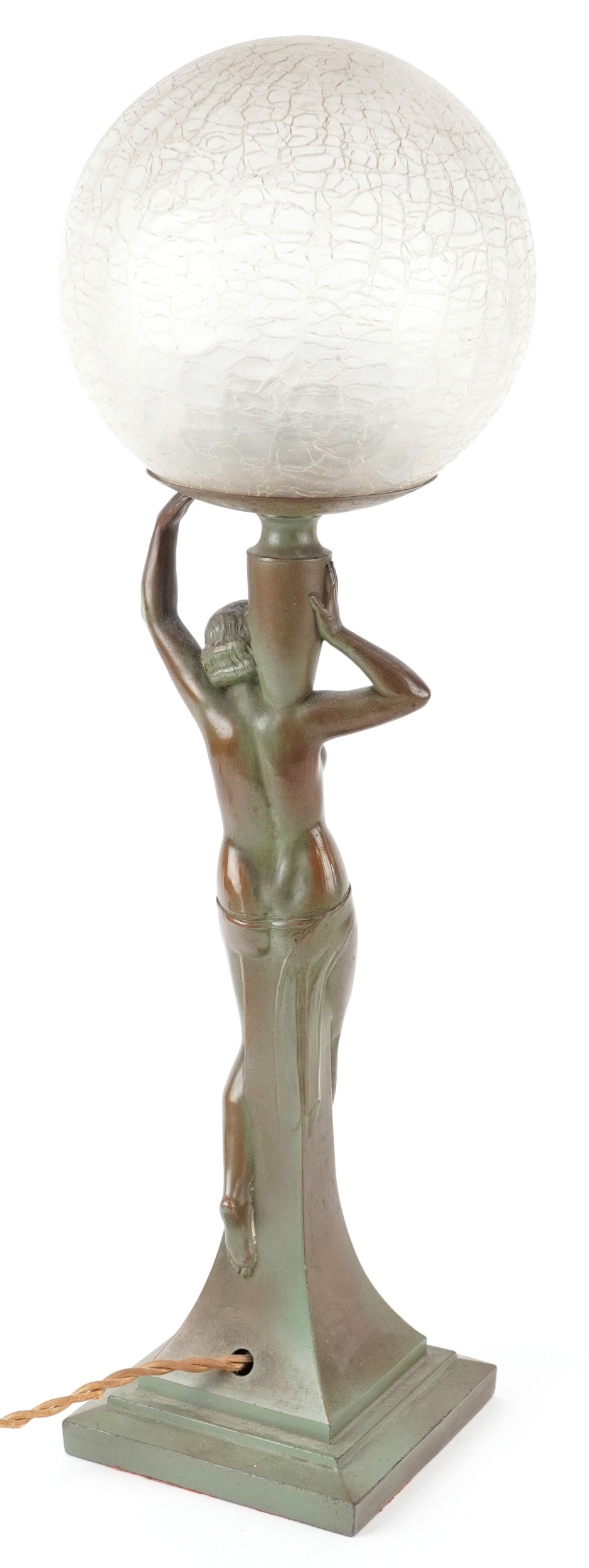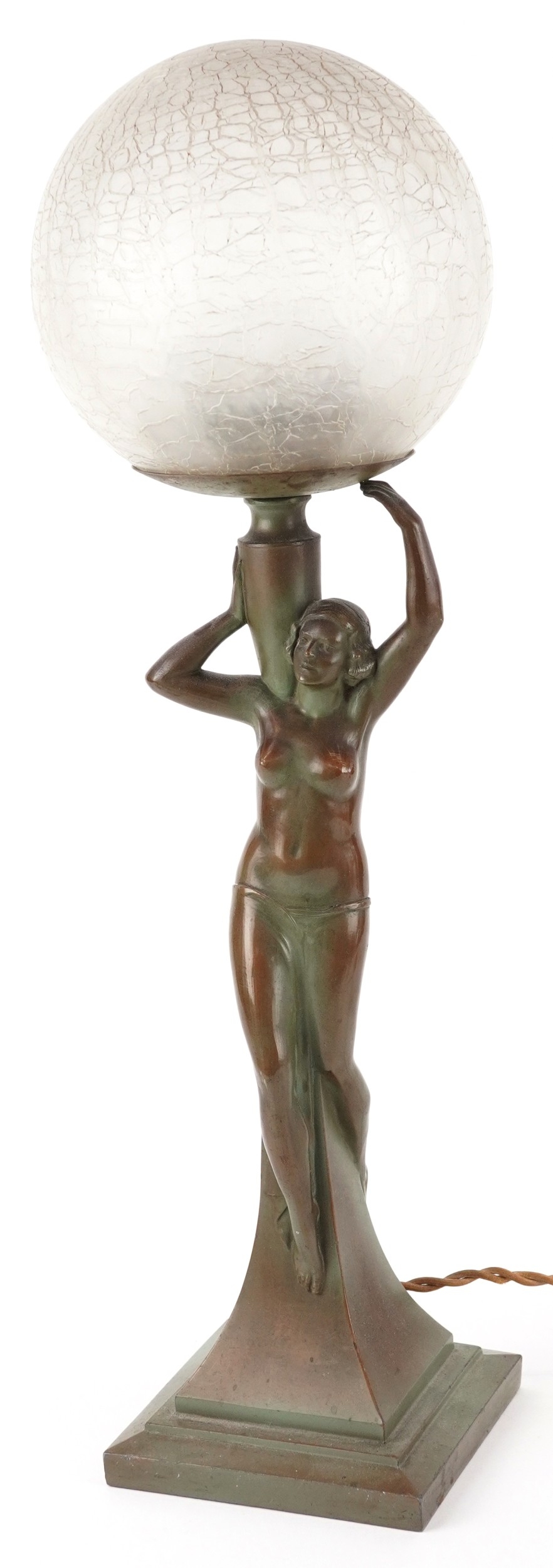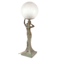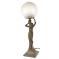 An Art Nouveau patinated bronze table lamp in the form of a nude female with globular glass shade, 50cm high.
