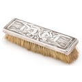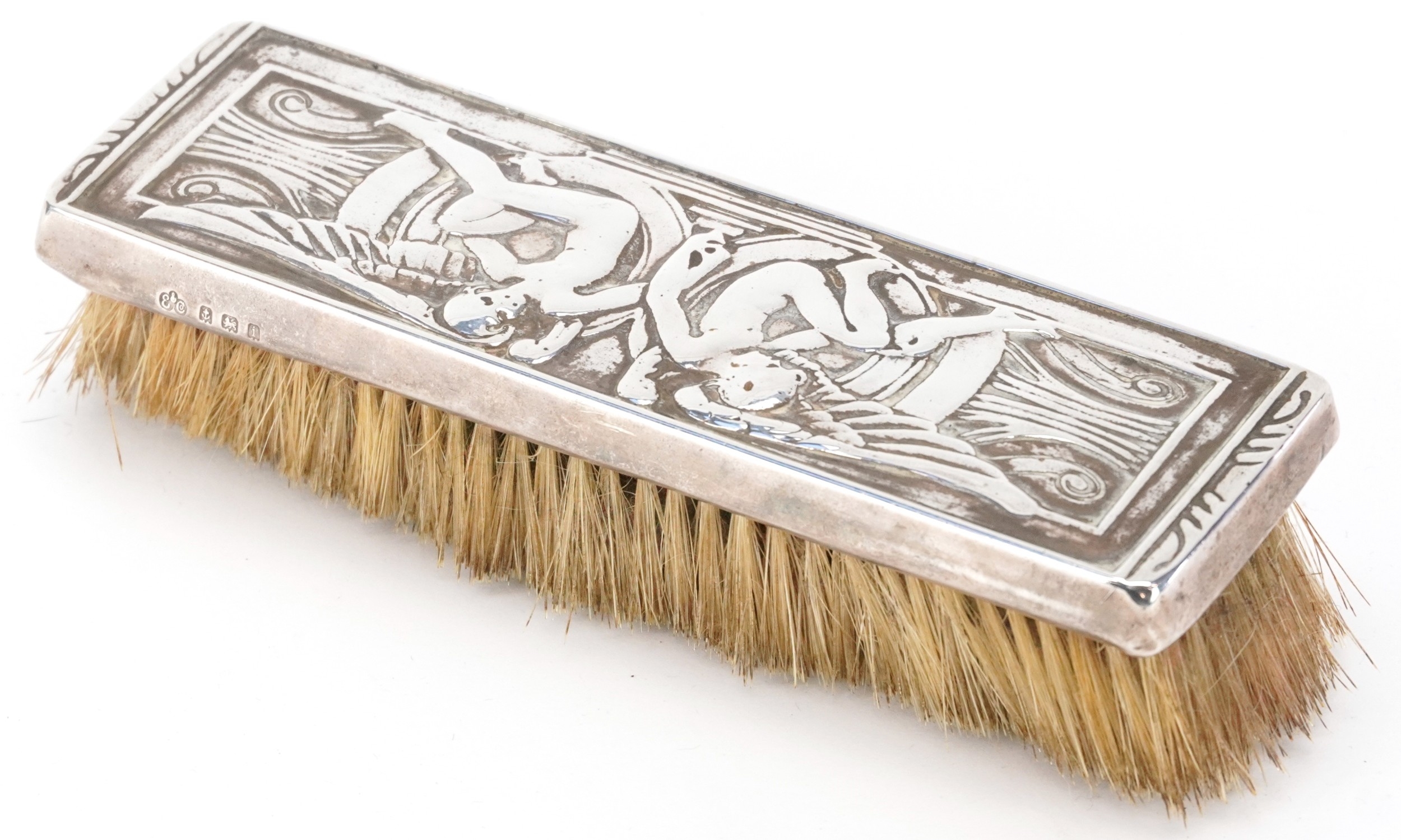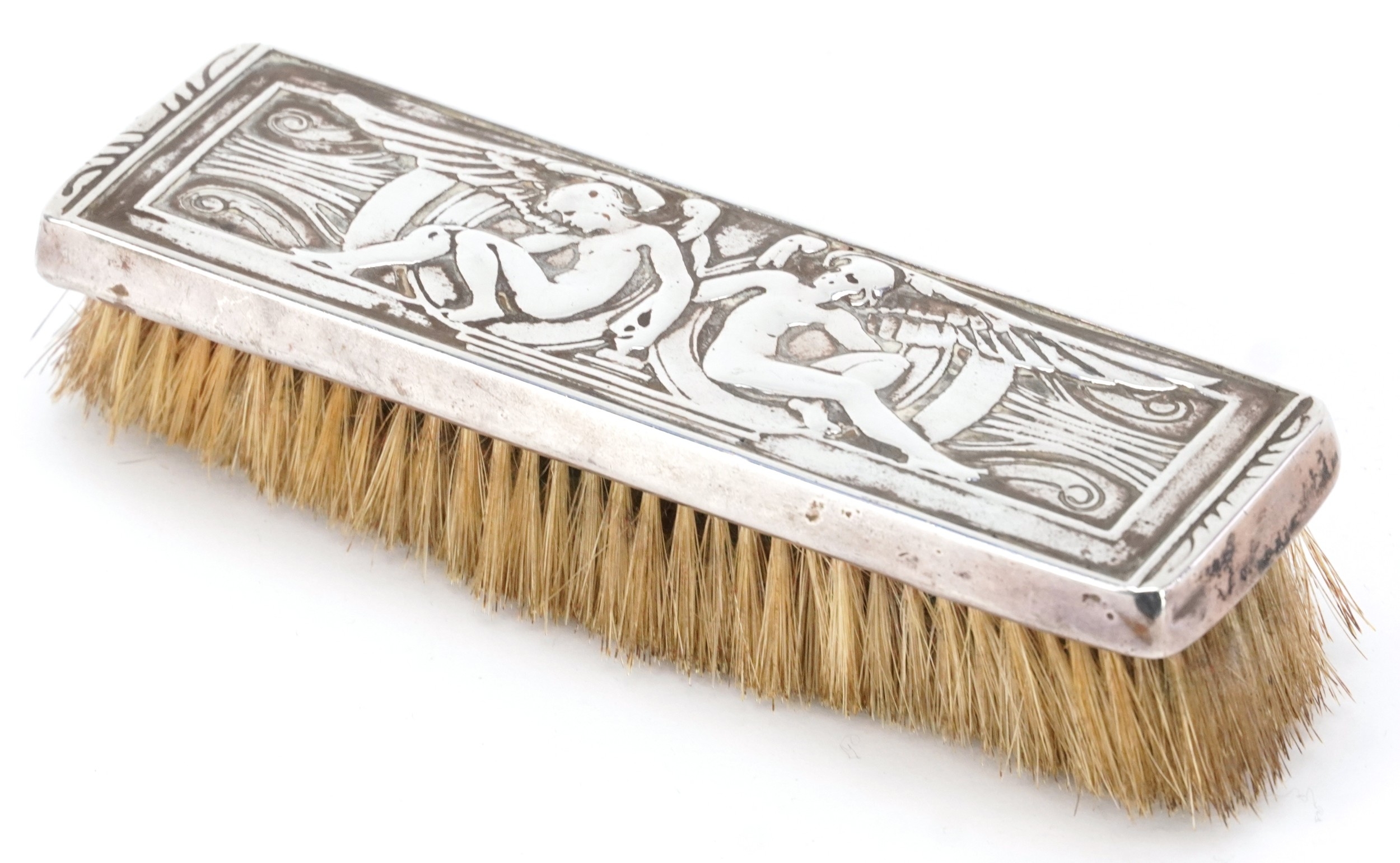 Elkington & Co., an Edwardian silver mounted clothes brush embossed with Putti, Birmingham 1908, 18cm wide.