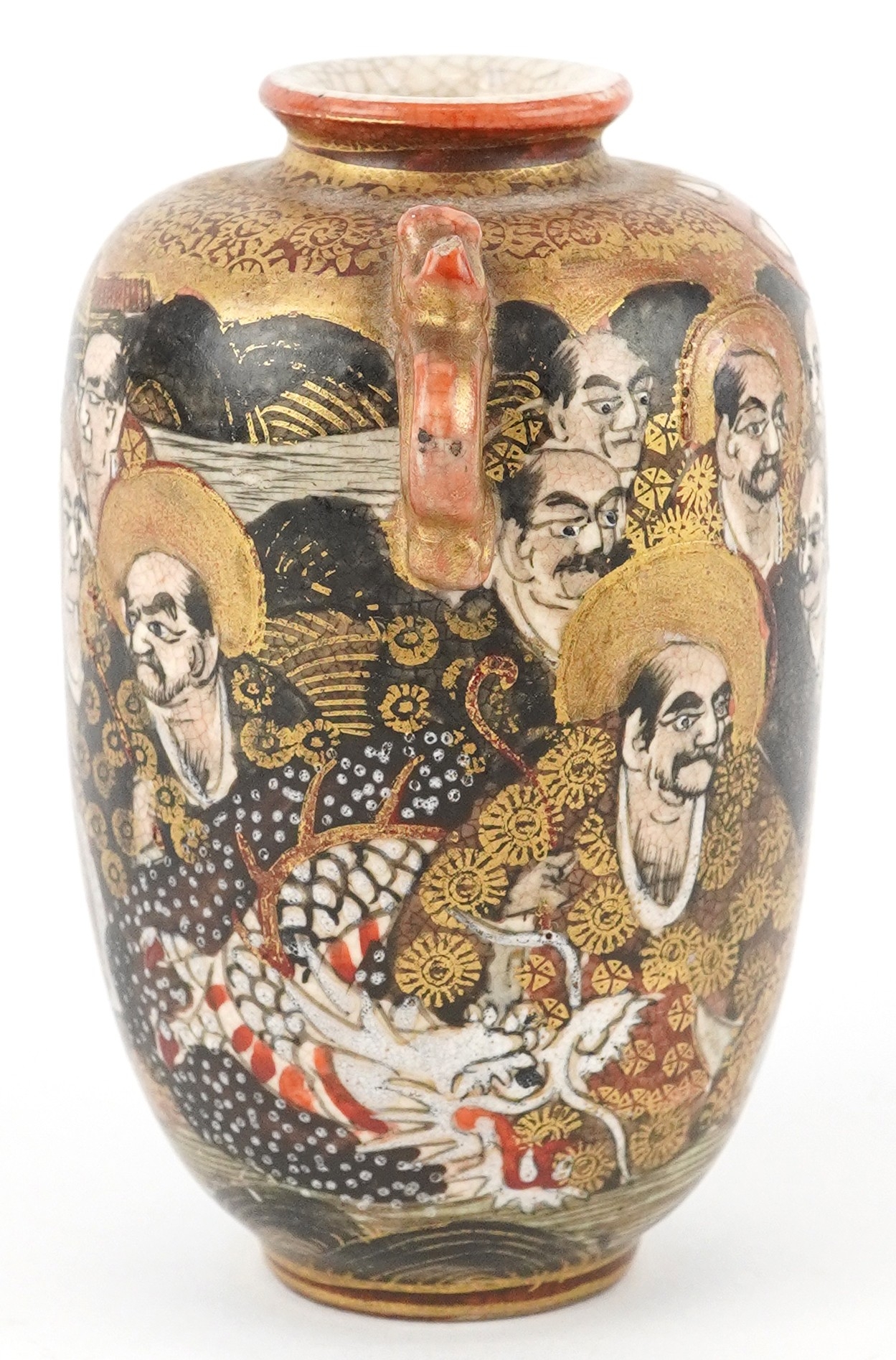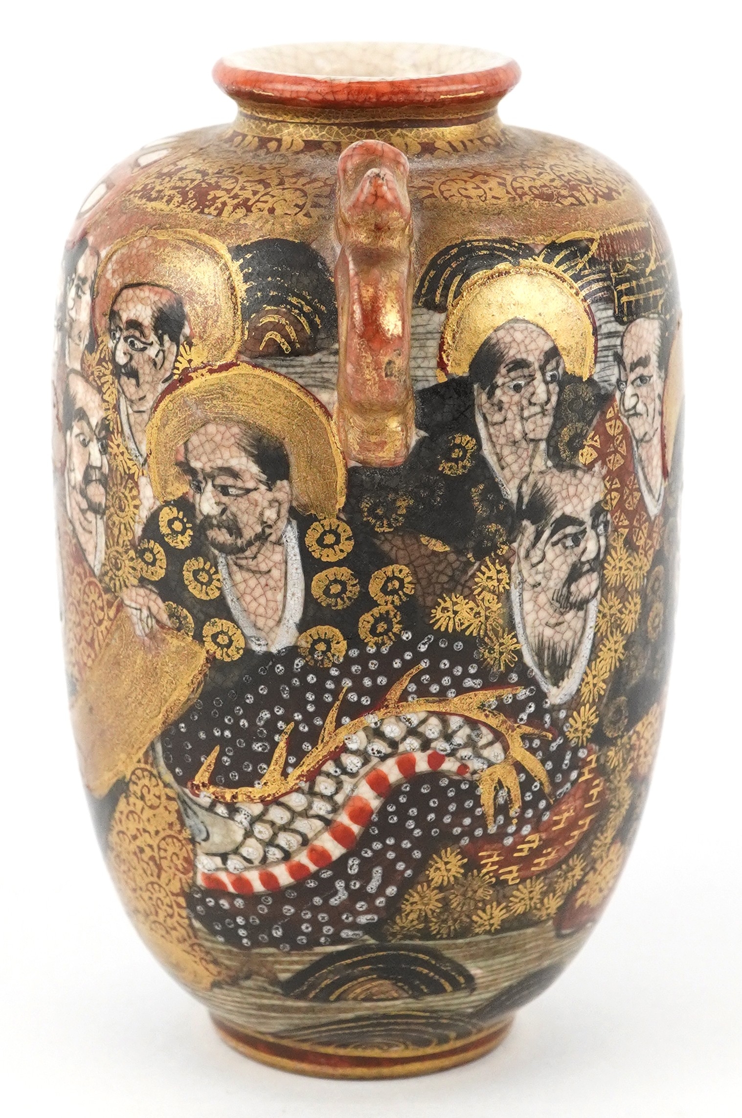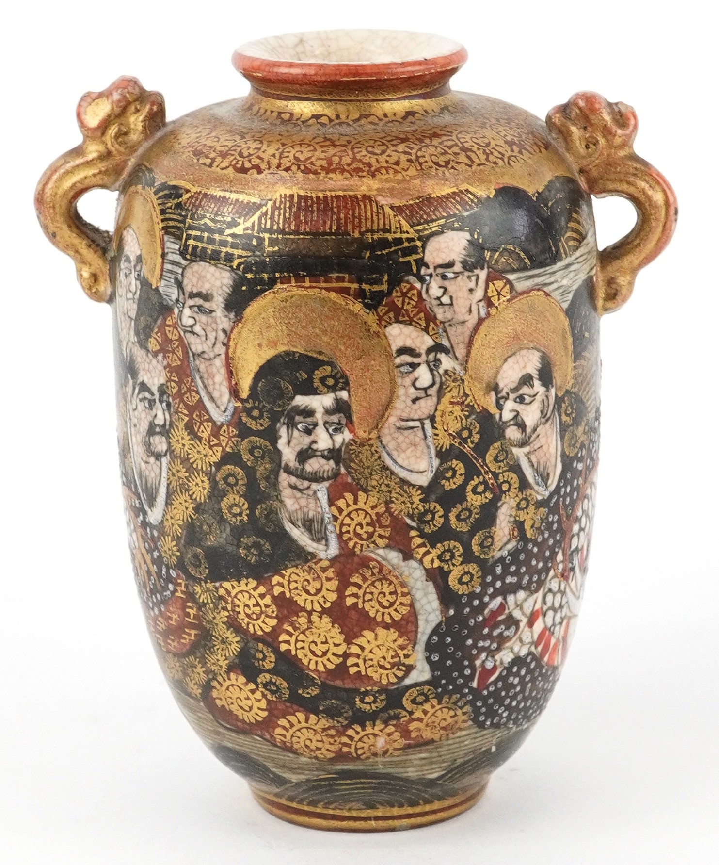A Japanese Satsuma earthenware miniature vase finely hand painted with figures, having twin dragon handles, character marks to the base, 9cm high.
