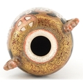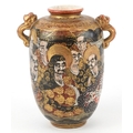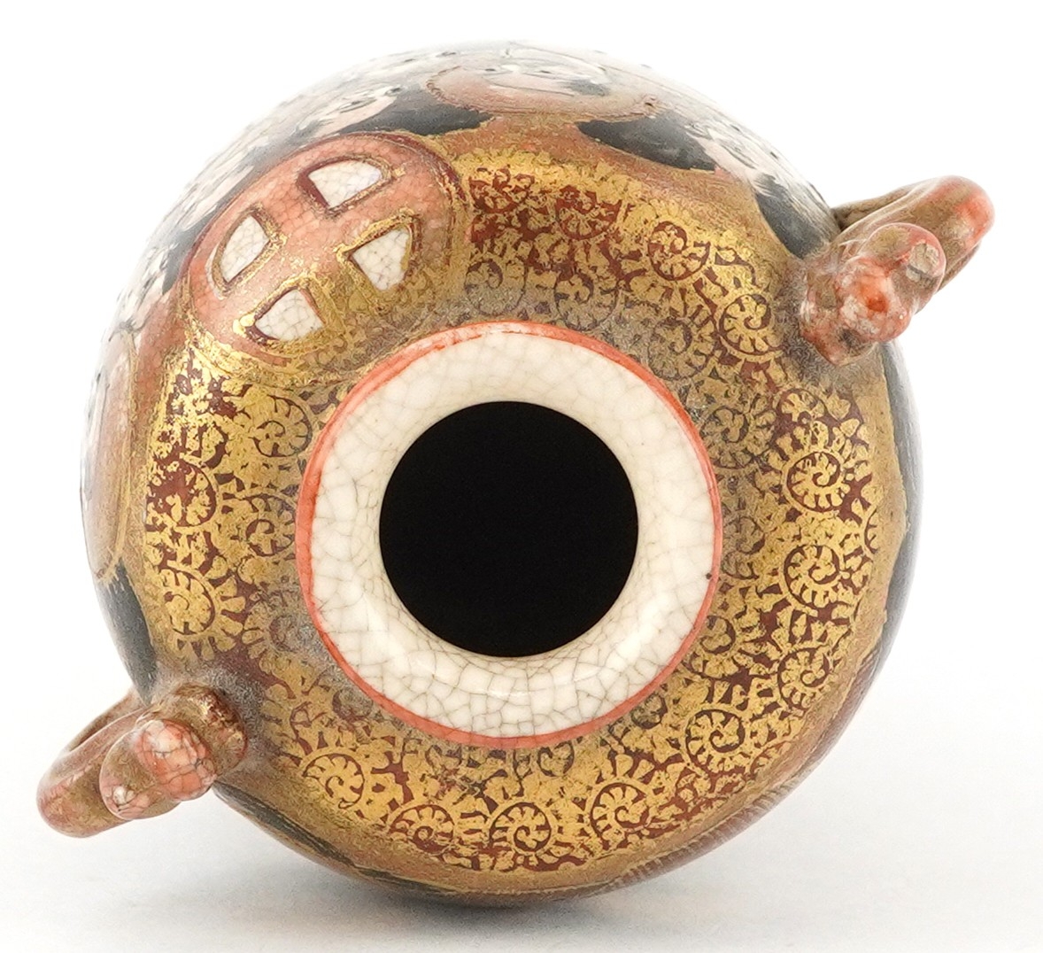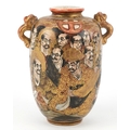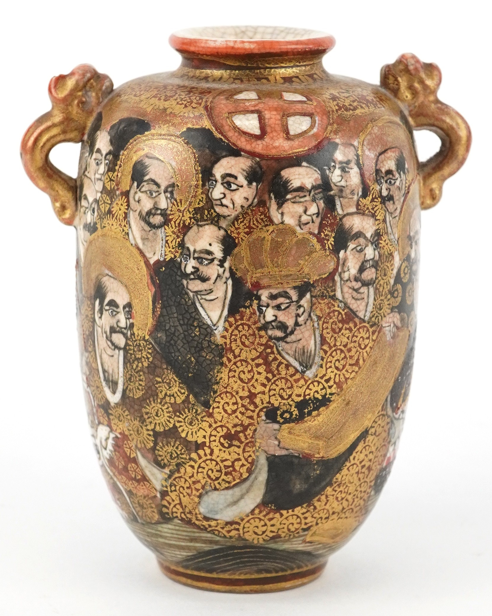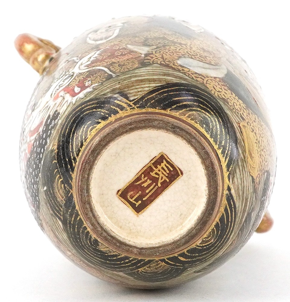 A Japanese Satsuma earthenware miniature vase finely hand painted with figures, having twin dragon handles, character marks to the base, 9cm high.