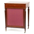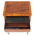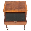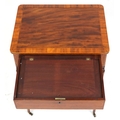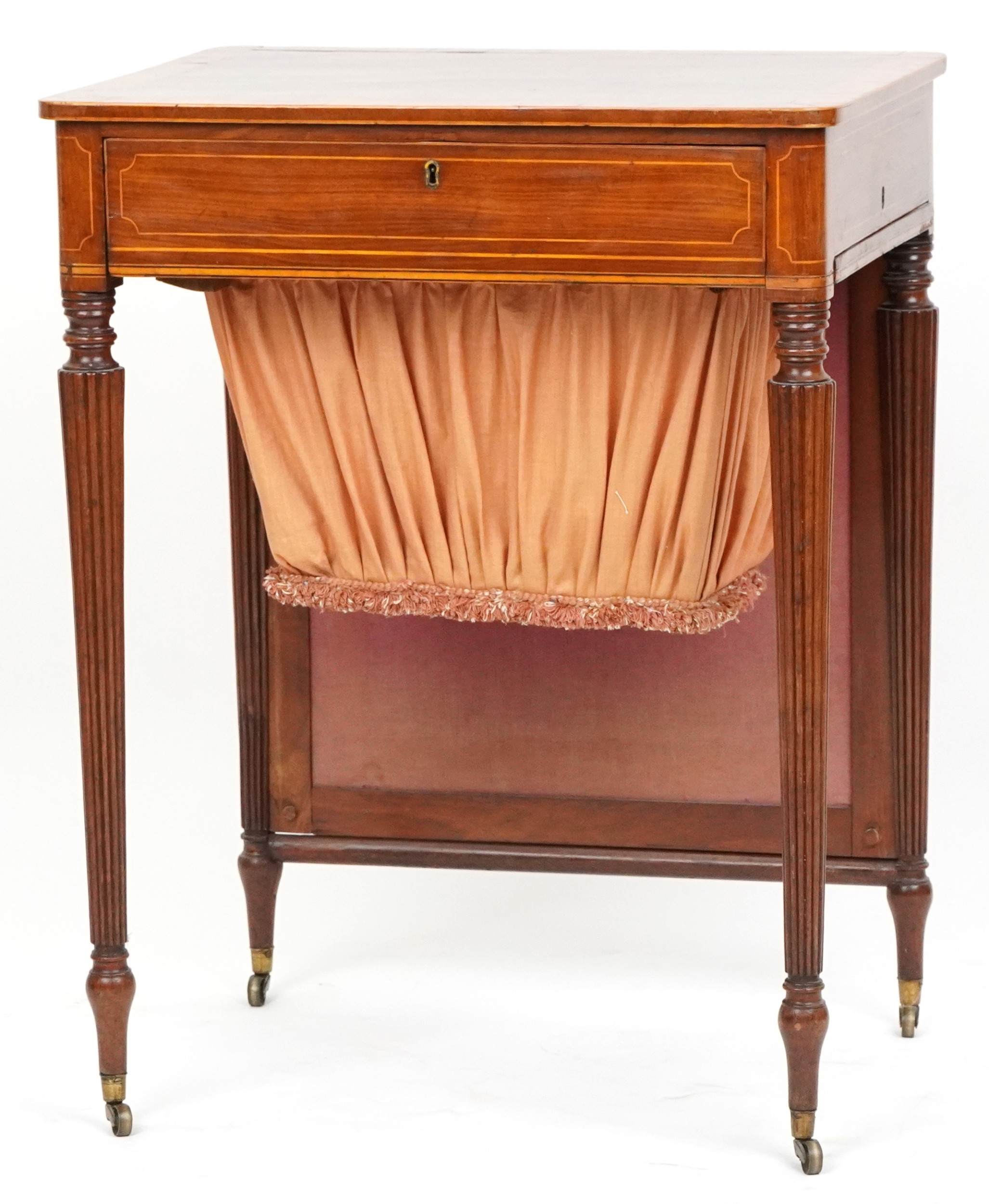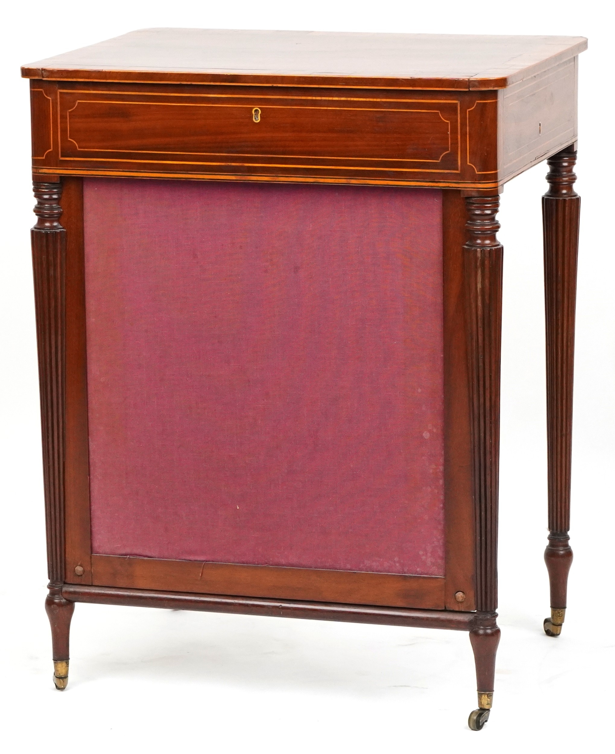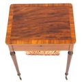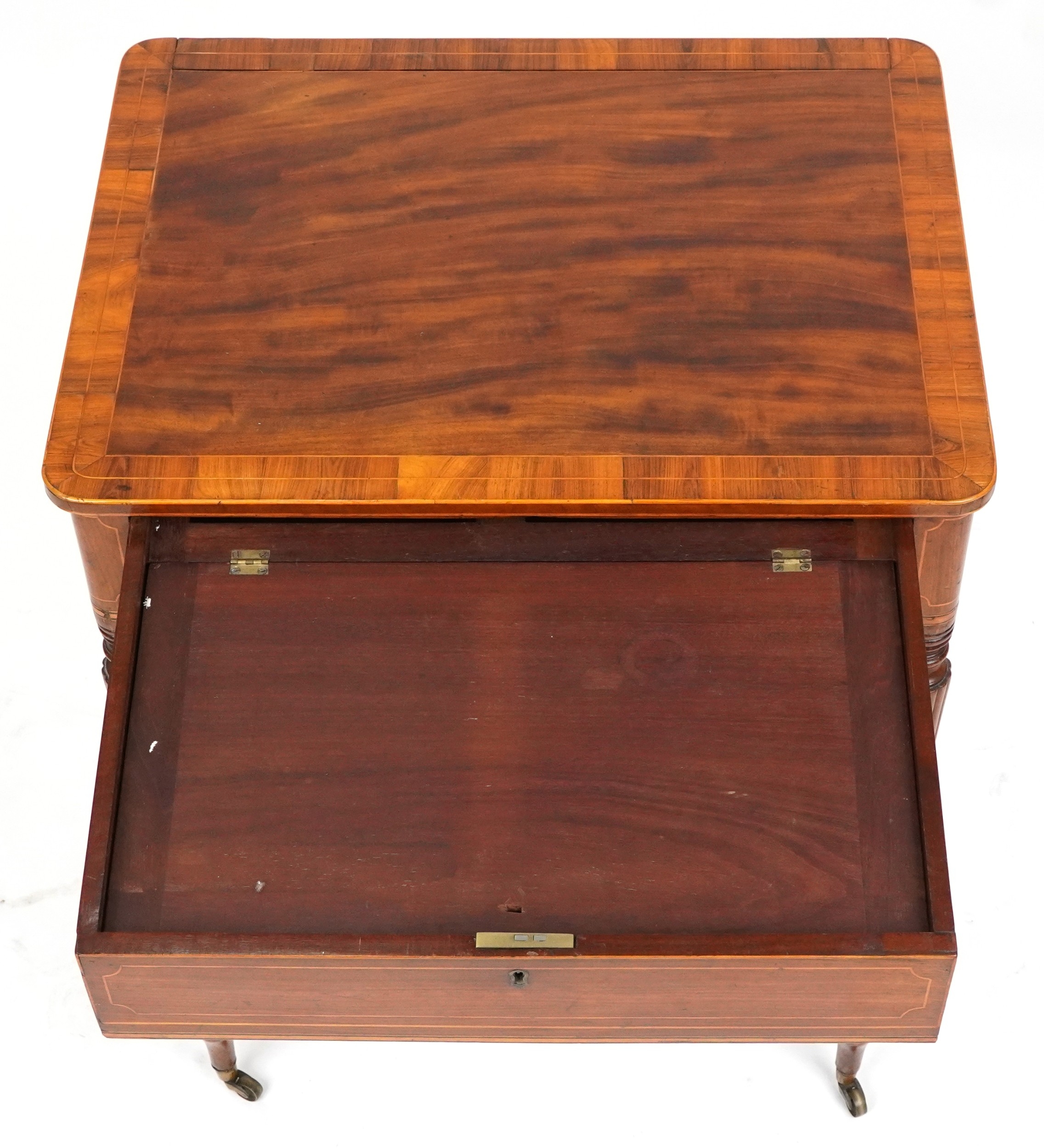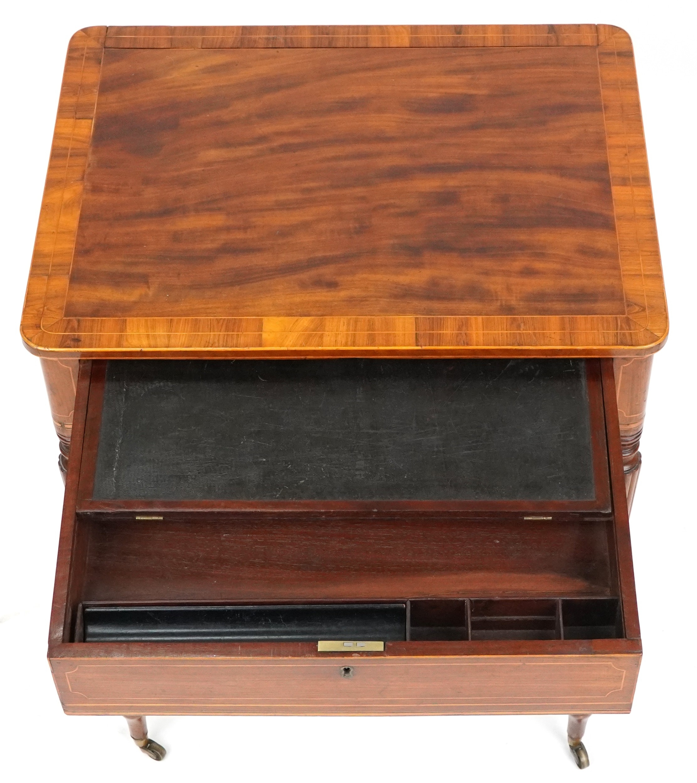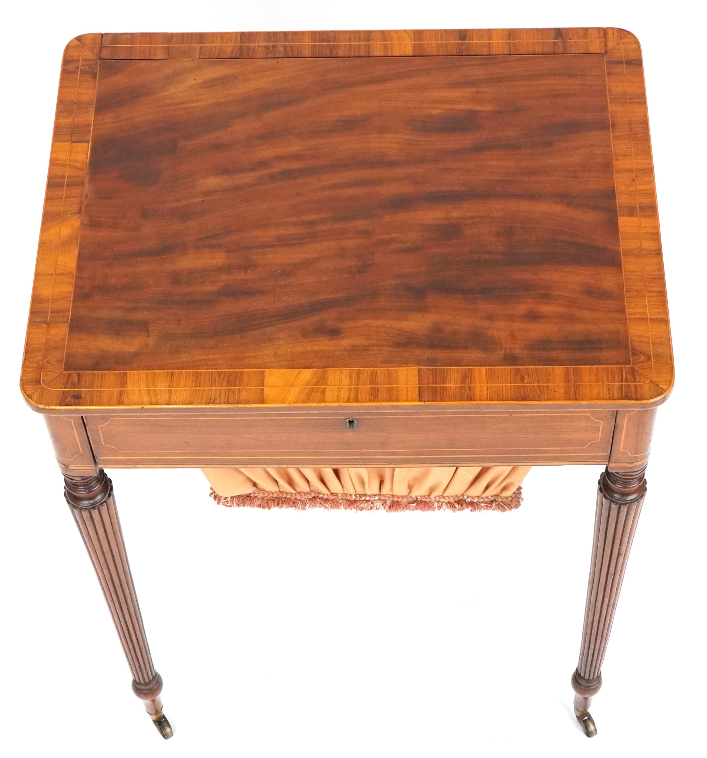 A good late George III figured mahogany and rosewood crossbanded work table, the lift up back above a compartmentalized drawer and well, raised on reeded legs, 76cm H x 59cm W x 46cm D.