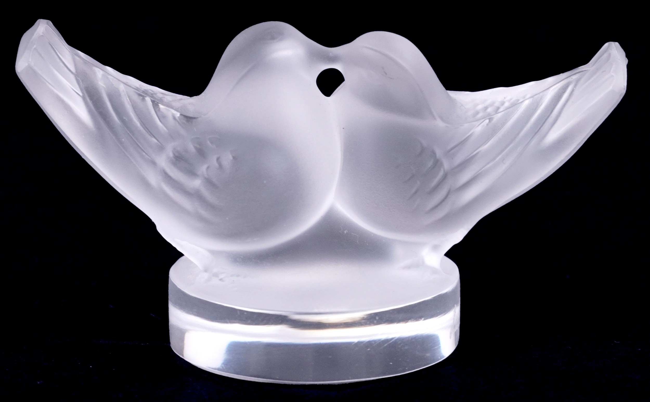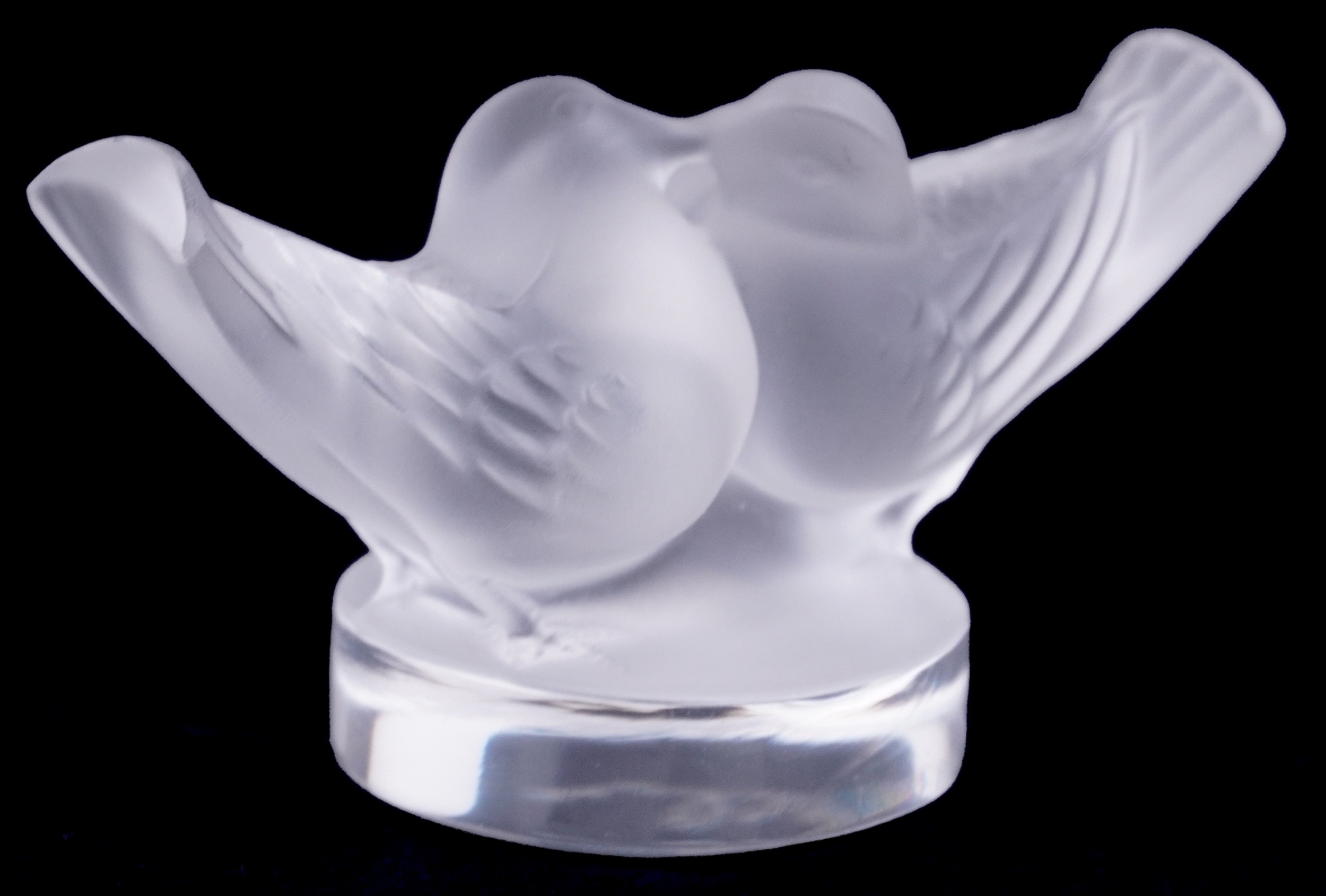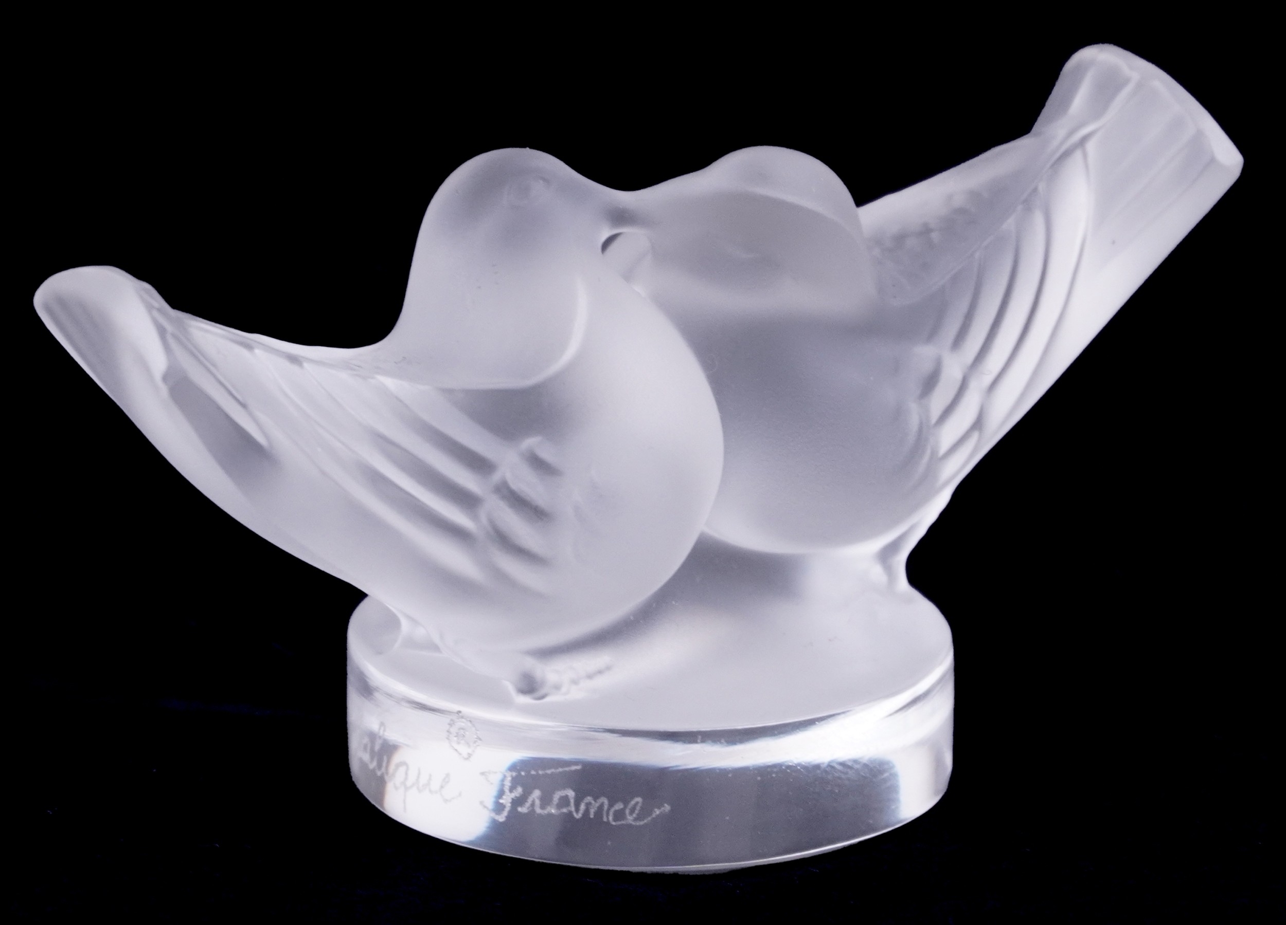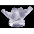 Lalique, a French frosted glass paperweight of lovebirds, etched Lalique France to the rim, 4cm high x 8cm wide.