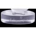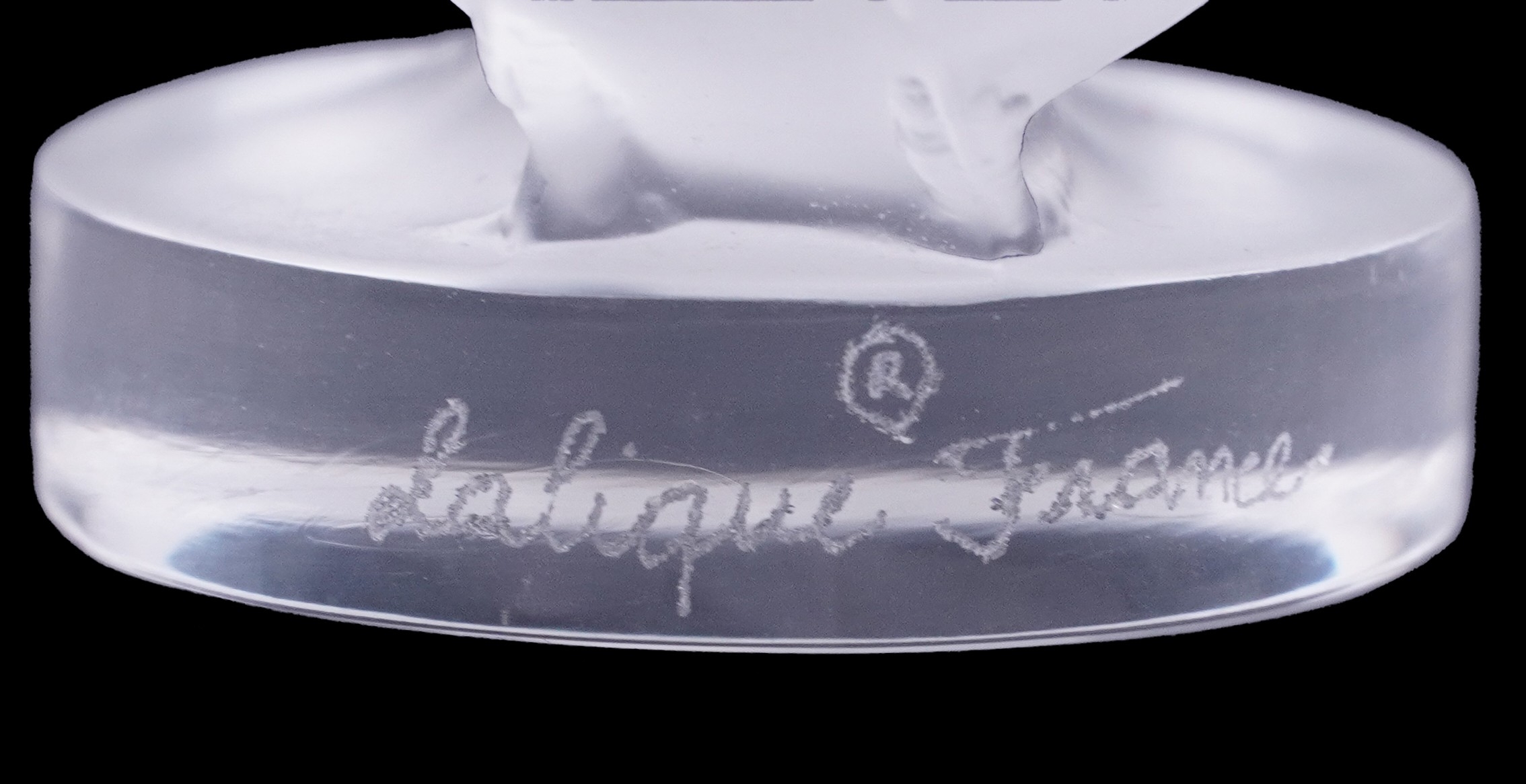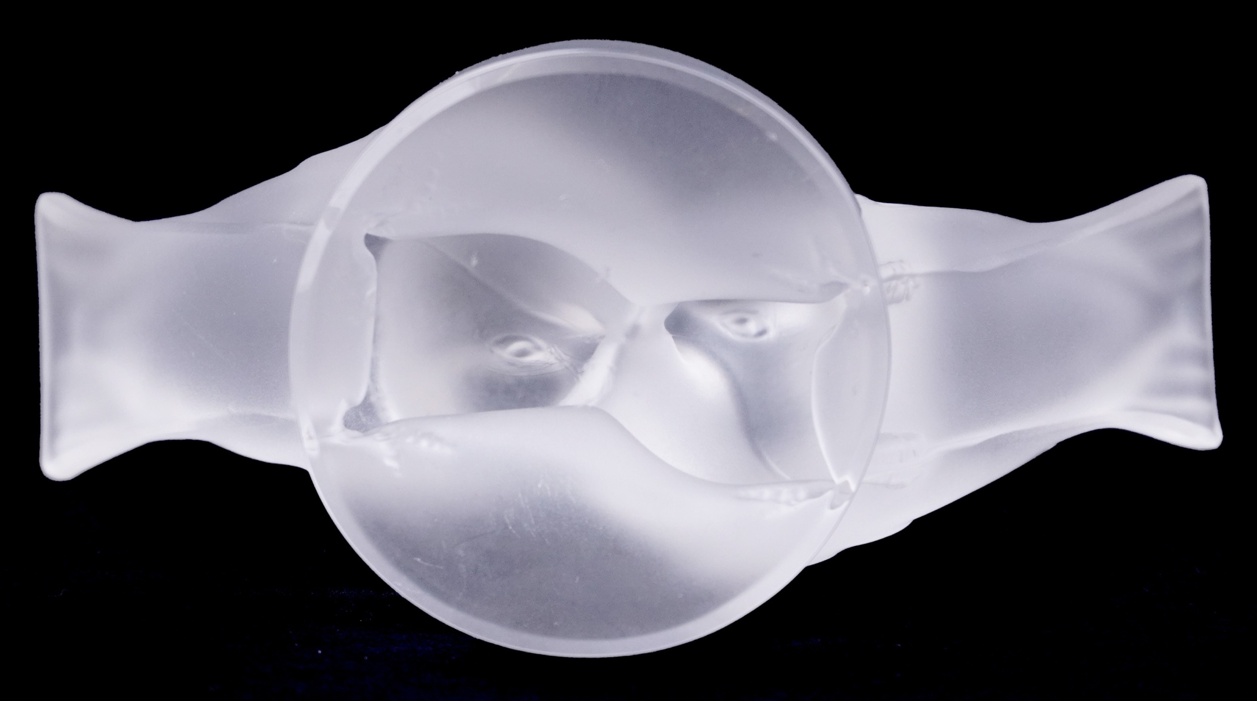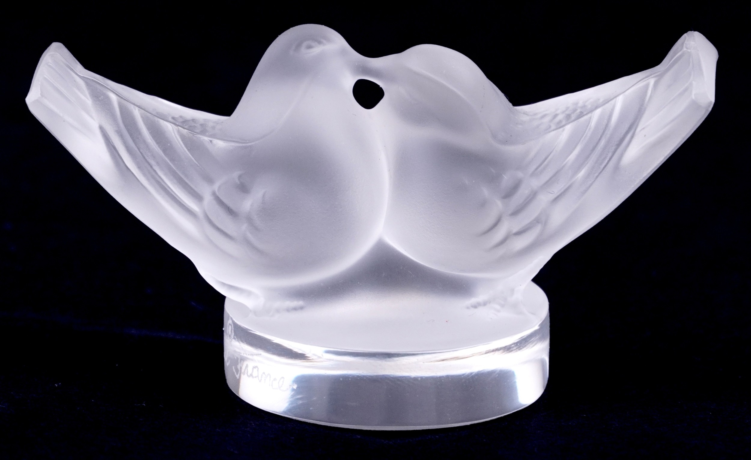 Lalique, a French frosted glass paperweight of lovebirds, etched Lalique France to the rim, 4cm high x 8cm wide.