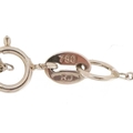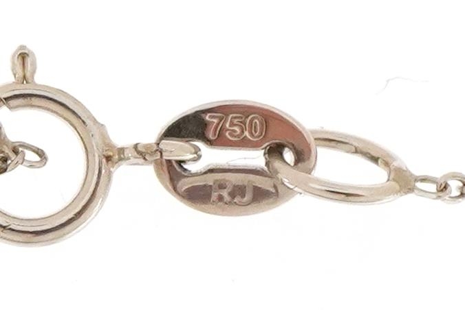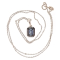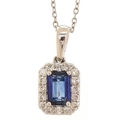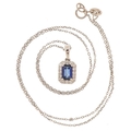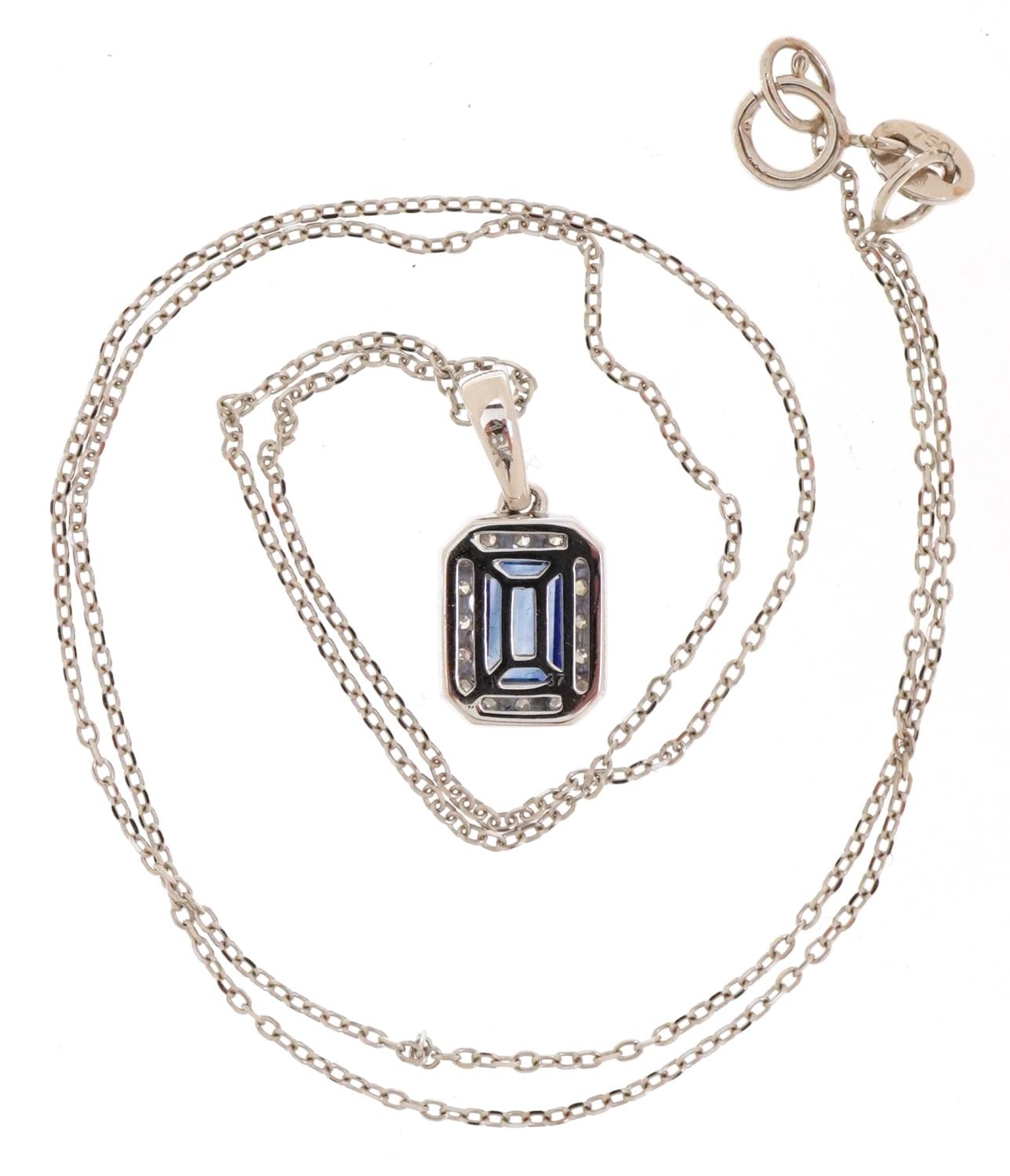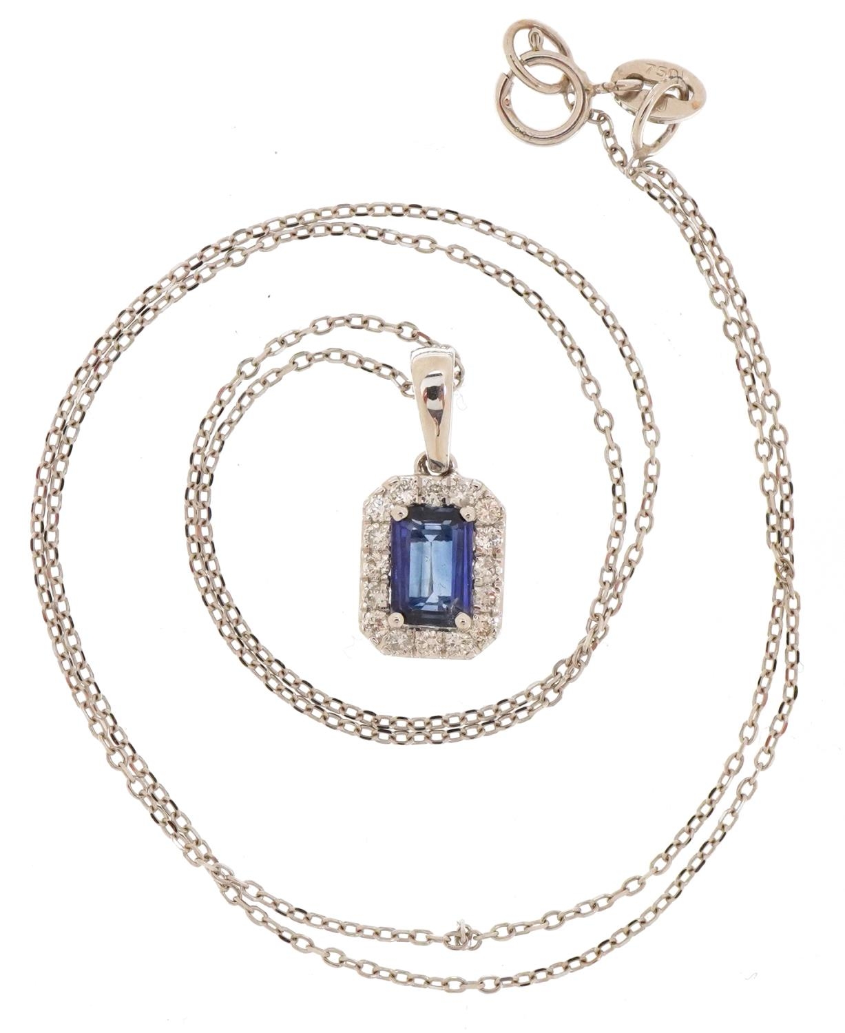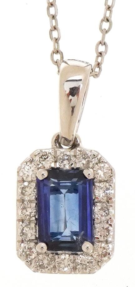 An 18ct white gold step cut sapphire and round brilliant cut diamond cluster pendant on an 18ct white gold necklace, the sapphire approximately 0.65 carat, total diamond weight approximately 0.20 carat, 1.6cm high and 40cm in length, total 2.5g.