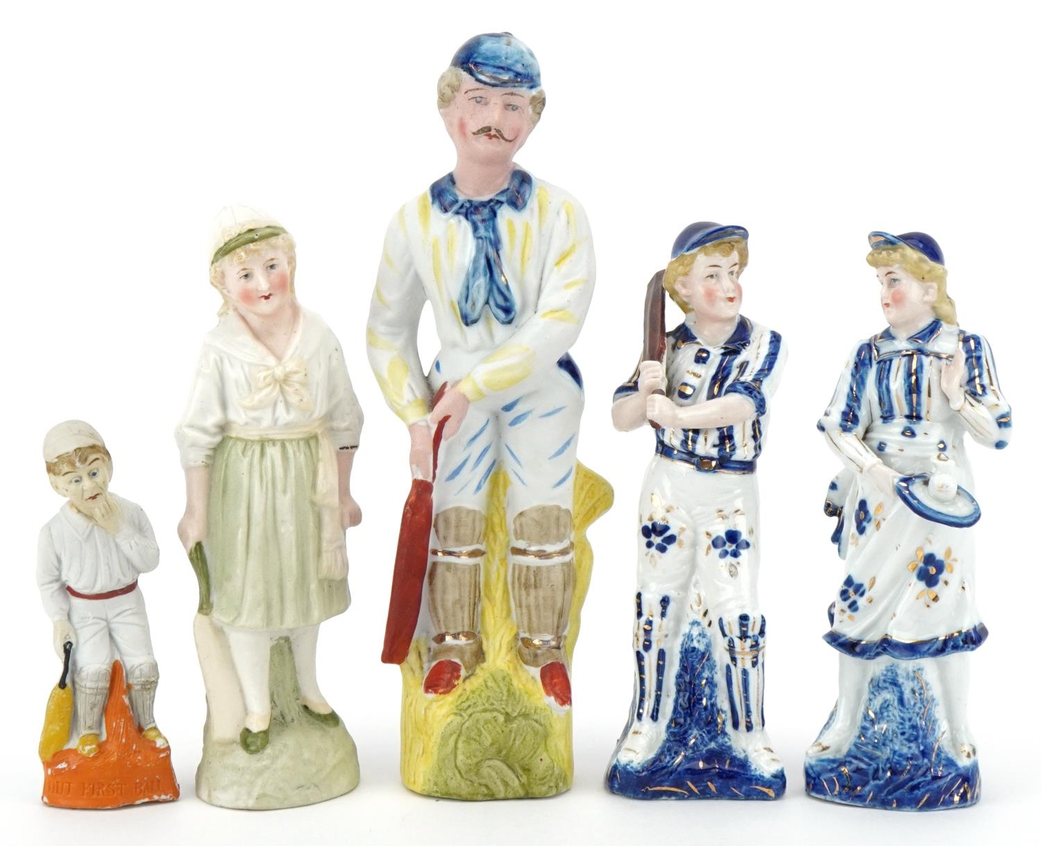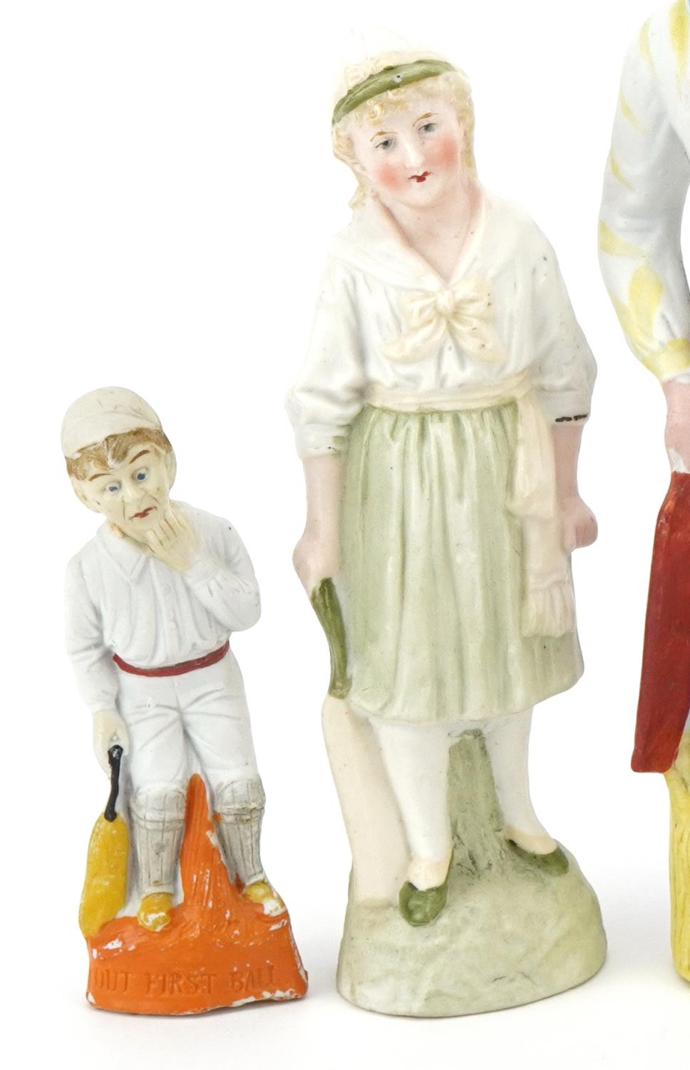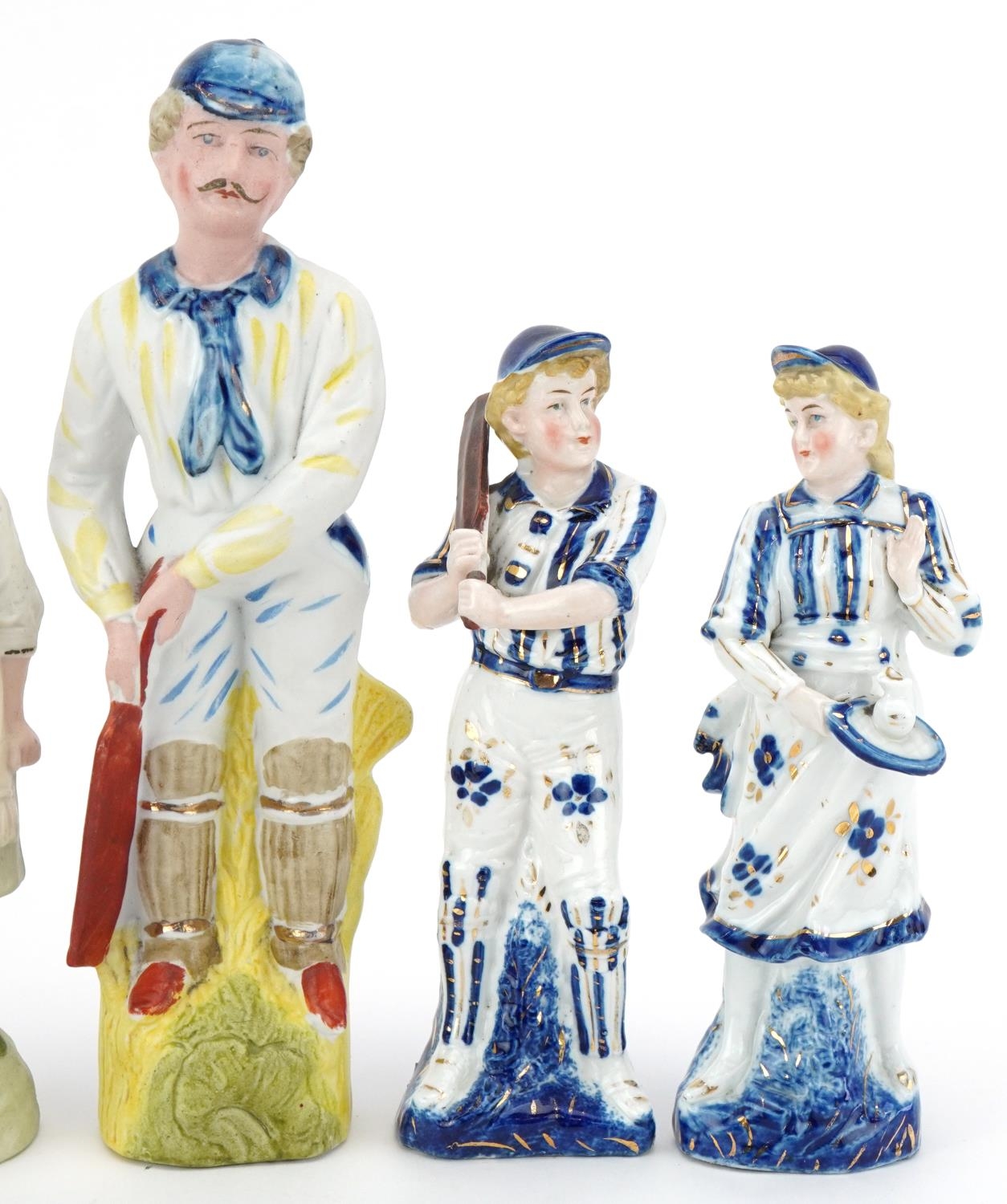 Various Victorian bisque figures of cricketers including a boy and girl couple, the largest 24cm high.