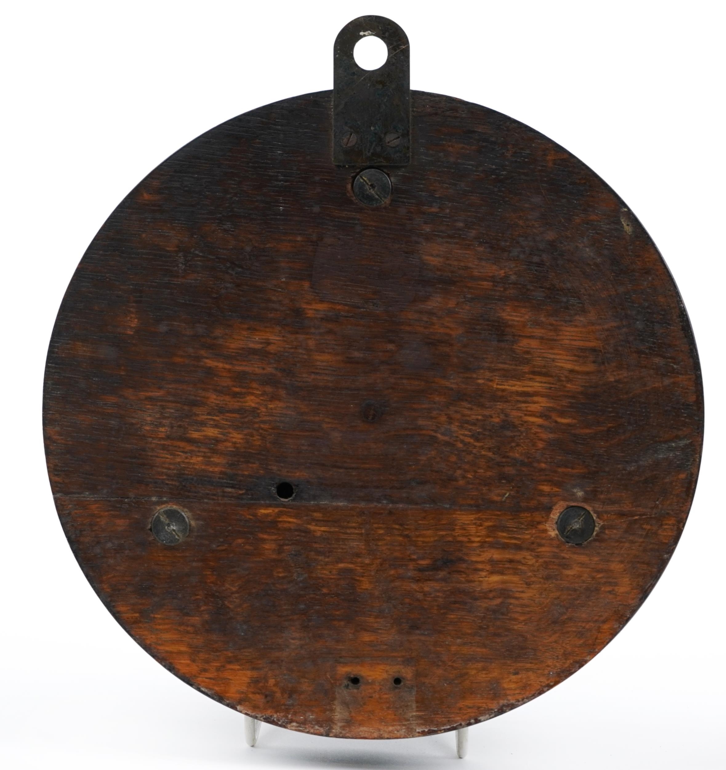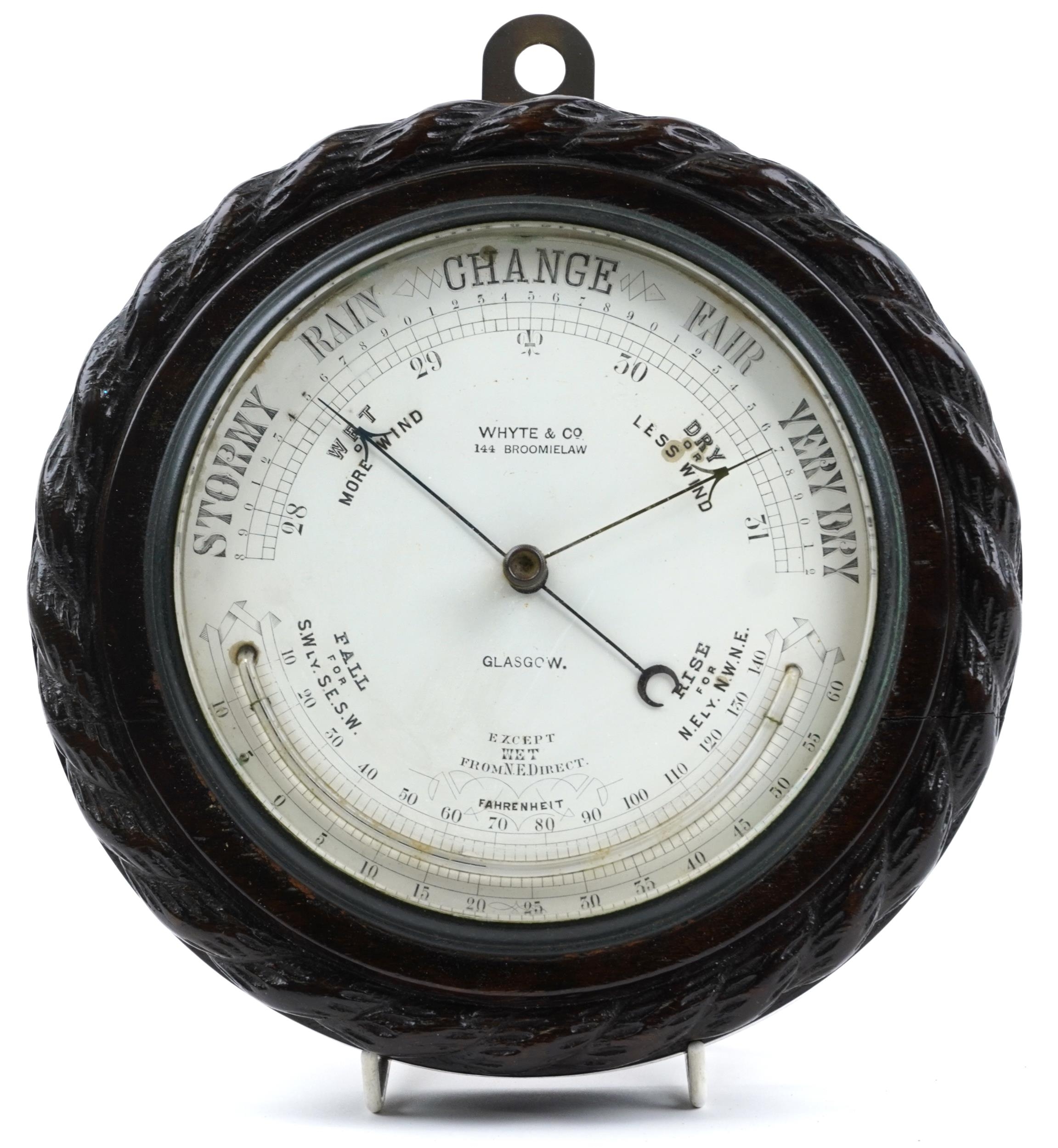 Carved oak wall barometer with thermometer retailed by Whyte & Co of Glasgow, 22.5cm in diameter